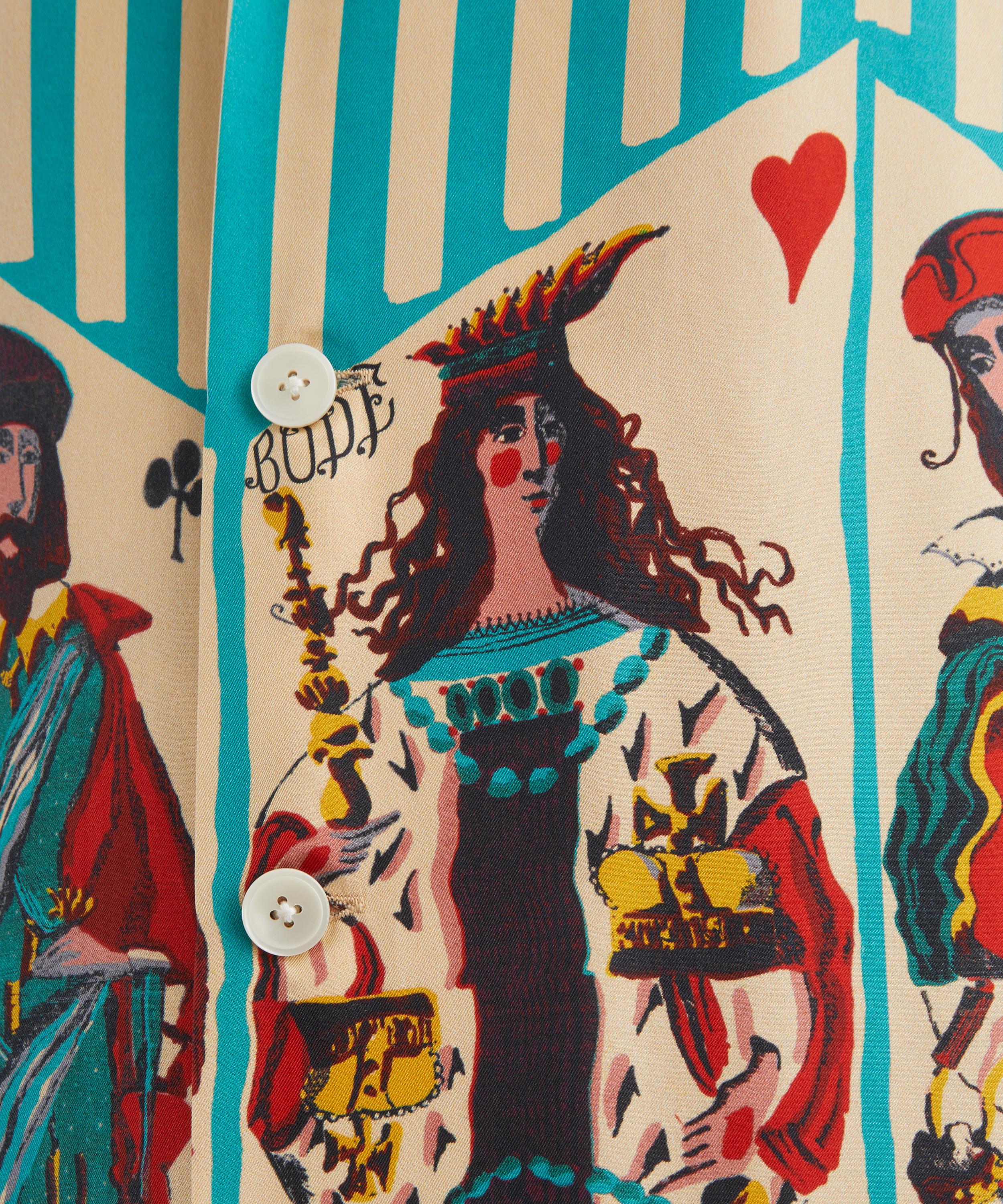 Crafted from pure silk, this short-sleeve shirt draws inspiration from the pack of cards in Alice’s Adventures in Wonderland. It’s printed with a playing-card motif set against a blue-green striped background, creating a whimsical yet refined finish.