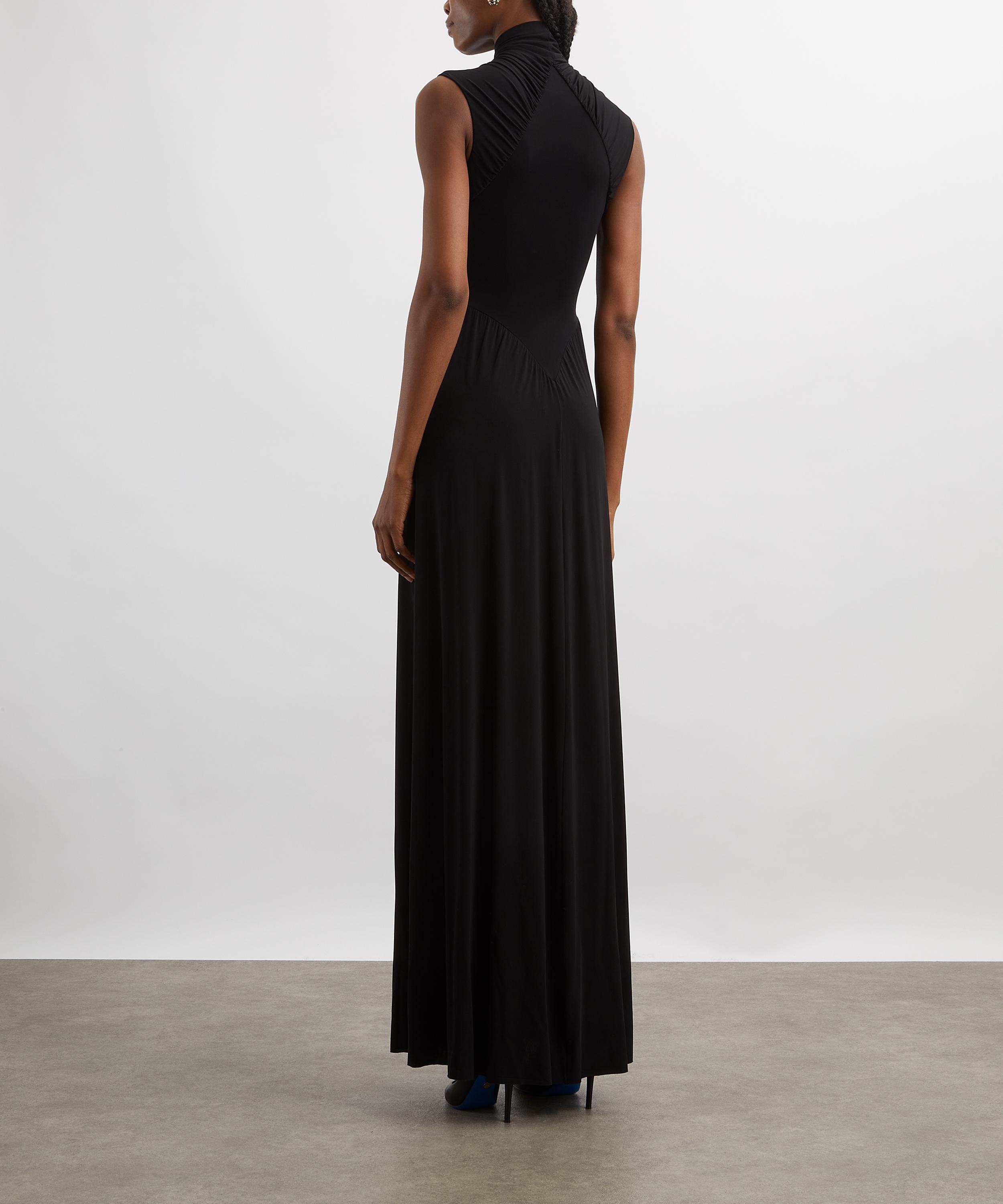 Crafted from fluid viscose jersey, it skims the body to create a flattering, form-fitting silhouette that falls gracefully to a maxi hem. Featuring a high neckline and a sheer mesh back panel, it pairs perfectly with pointed heels for a refined silhouette that exudes effortless sophistication.