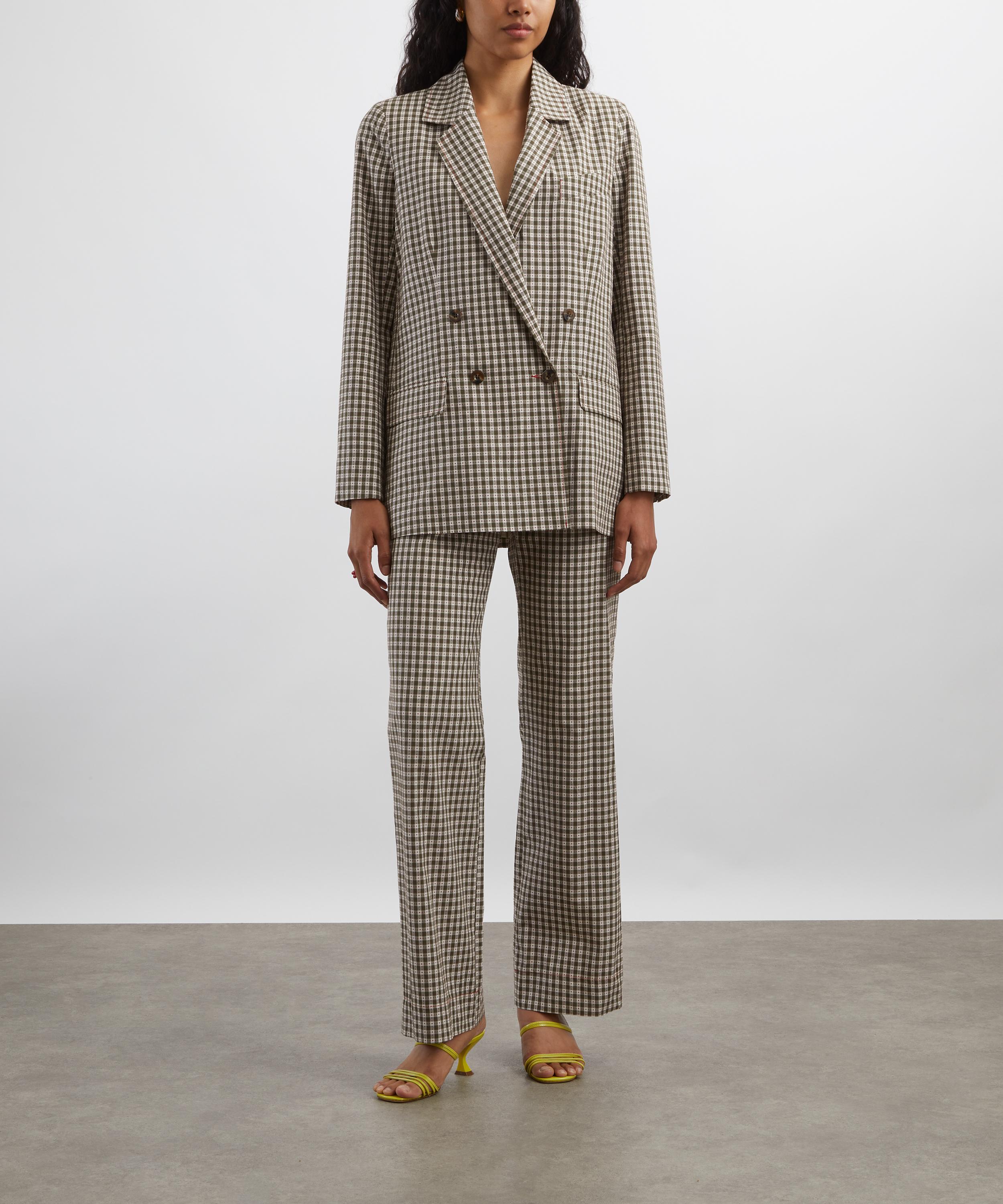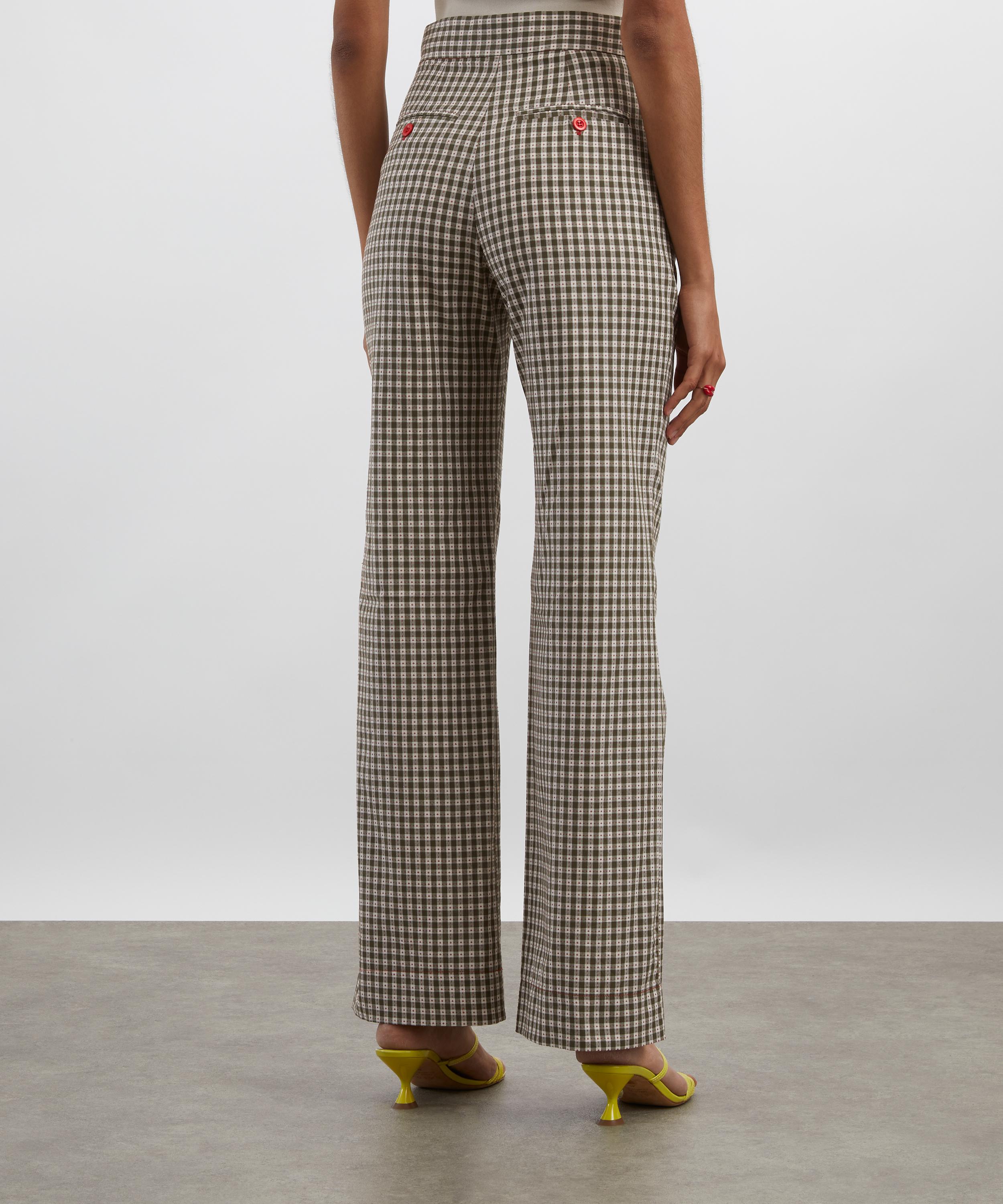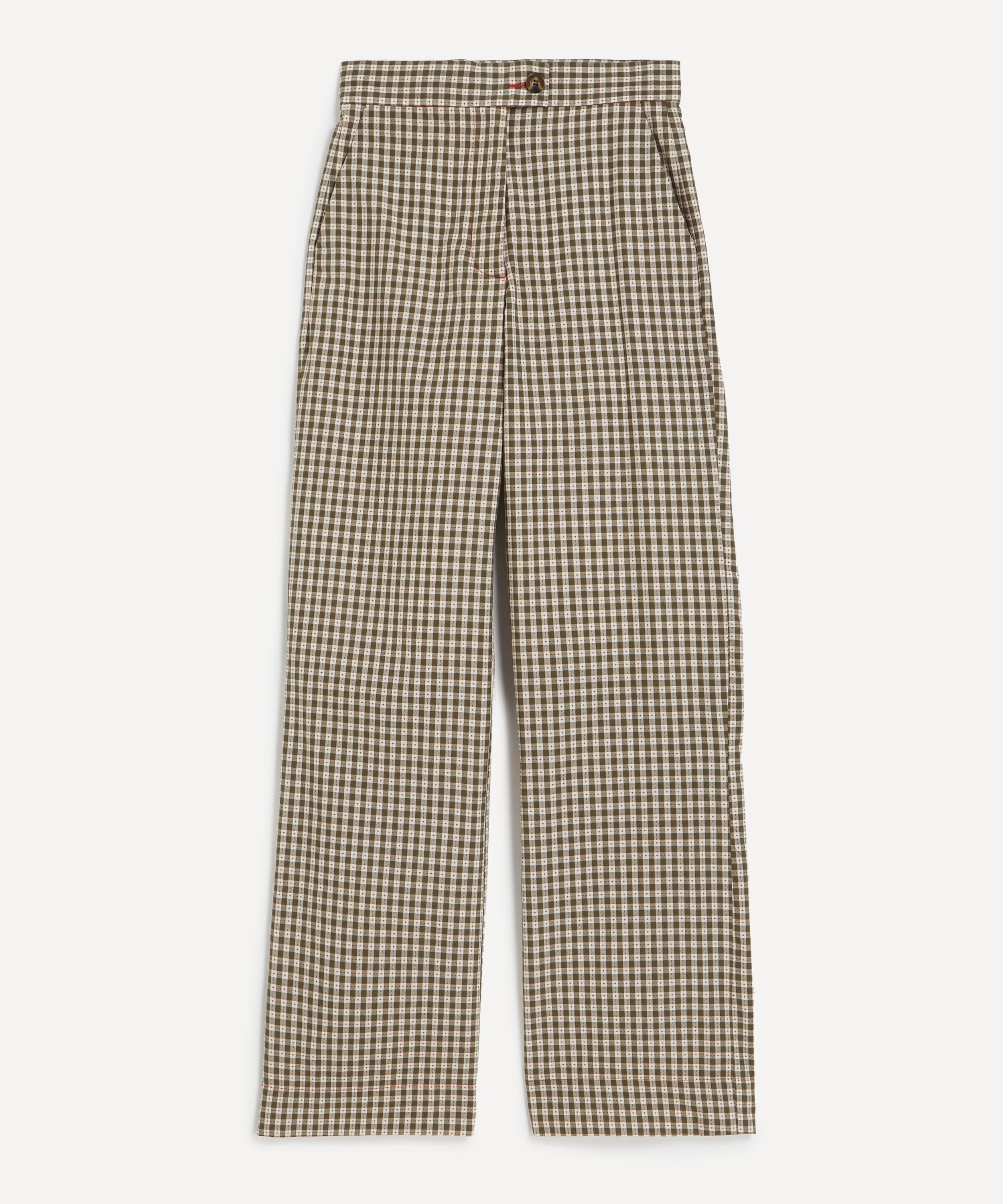 Made in London, these high-waisted trousers are crafted from cotton adorned with a khaki gingham pattern. Designed with a straight-leg silhouette, they feature an extended waistband, and multiple side and back pockets. Style them with the matching Rum & Raisin Double-Breasted Blazer for a perfectly coordinated look.