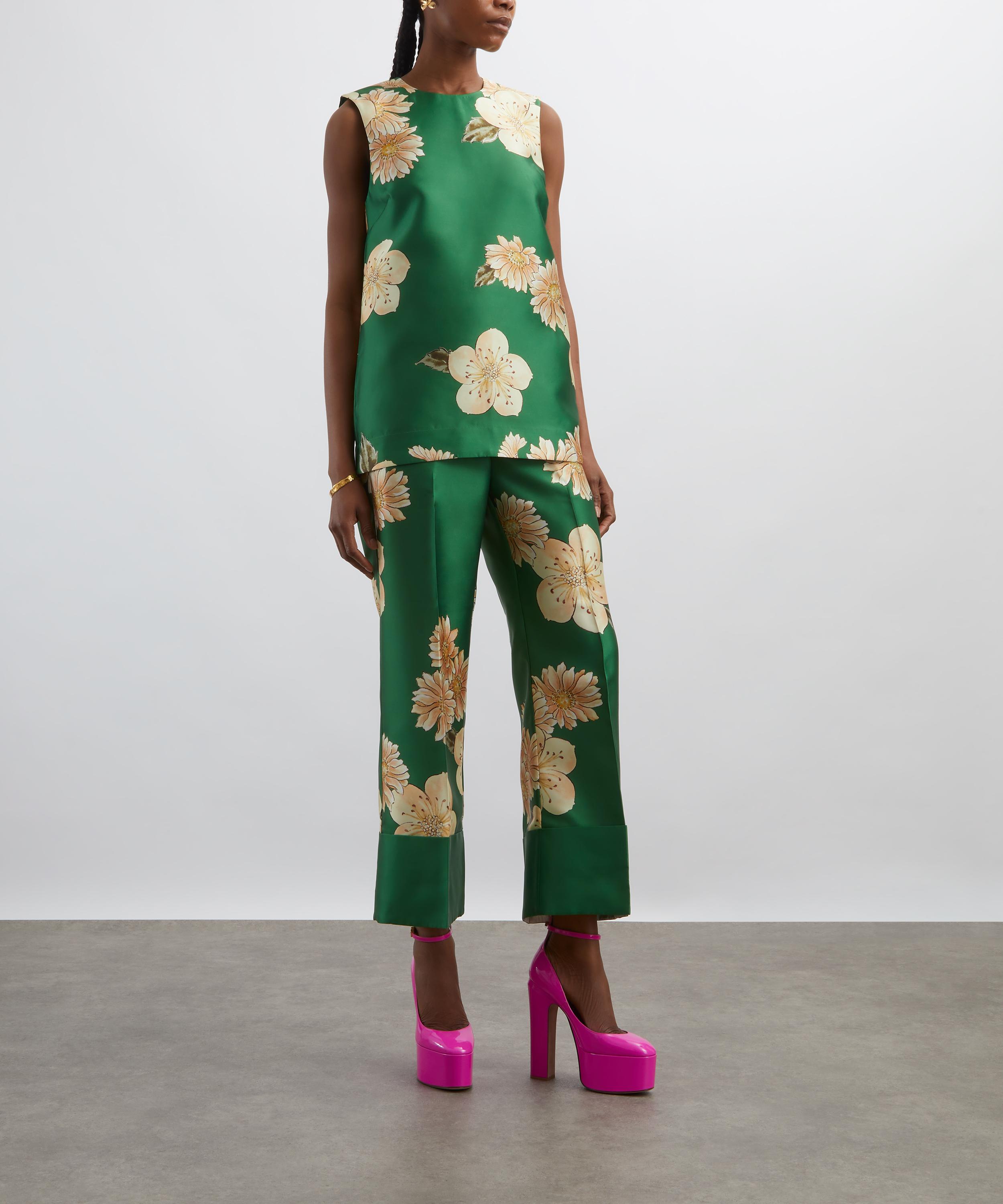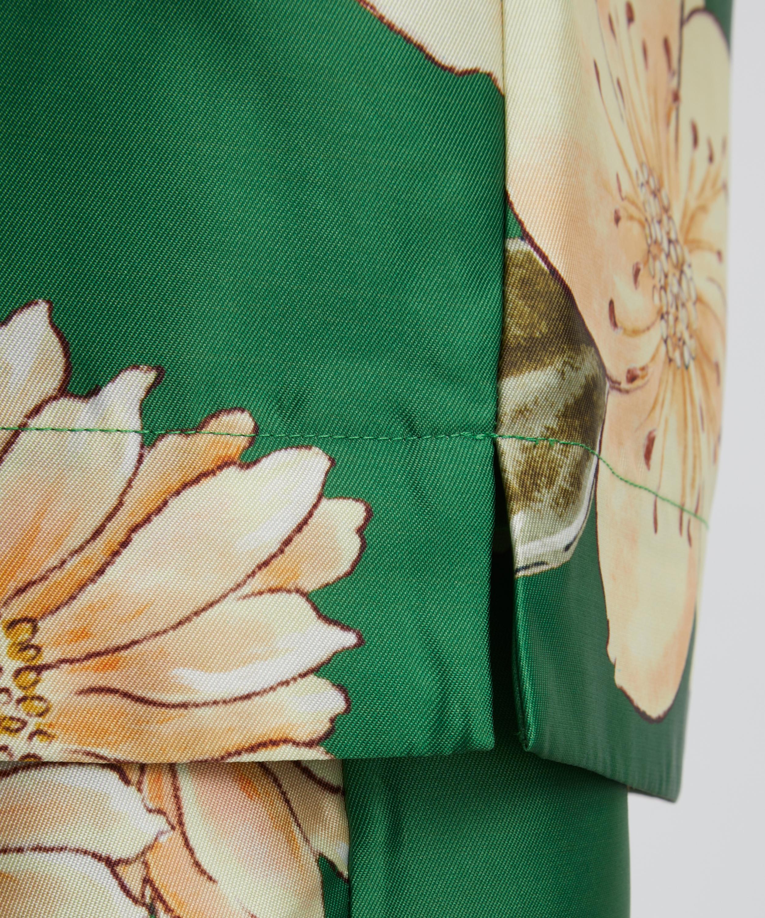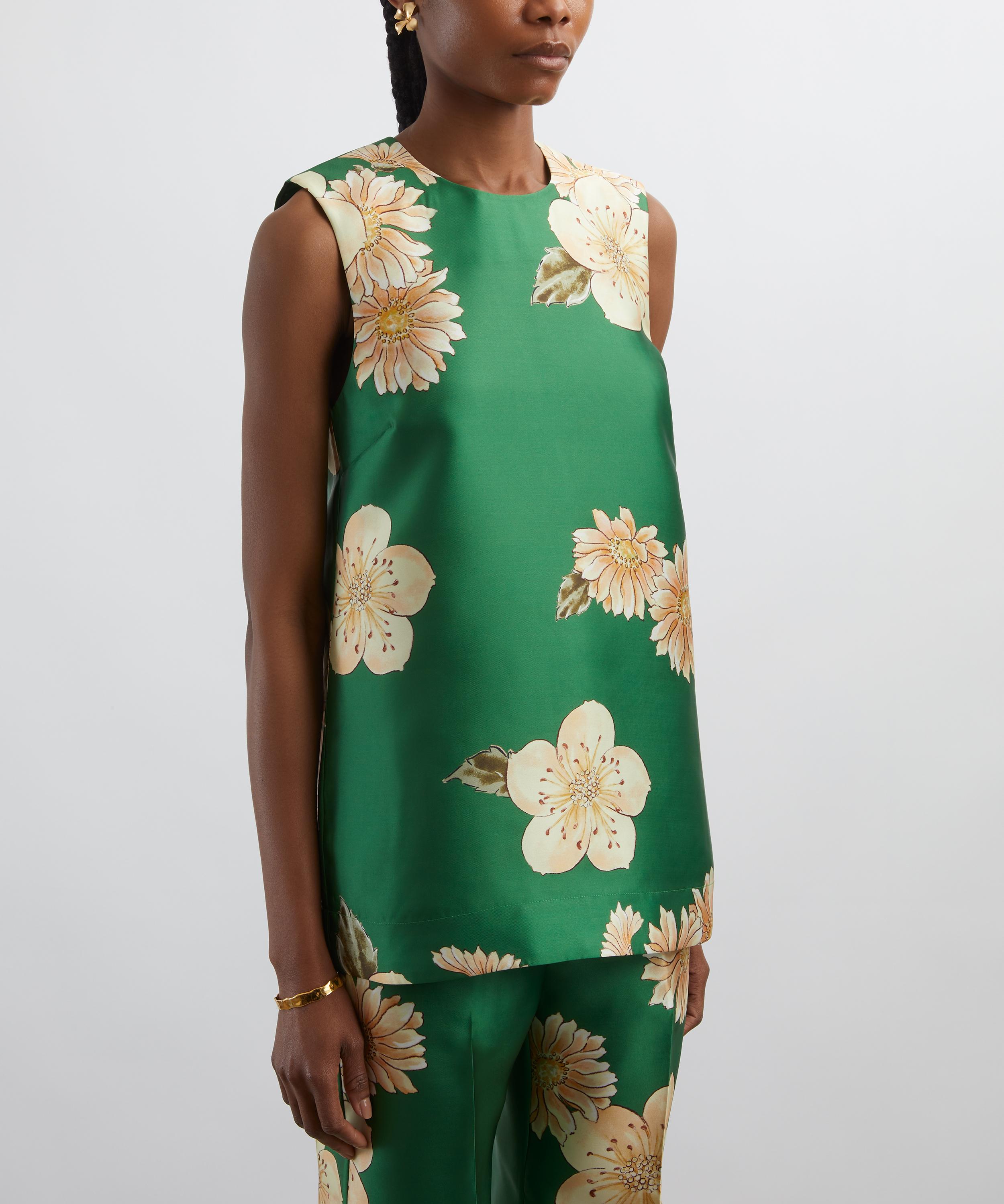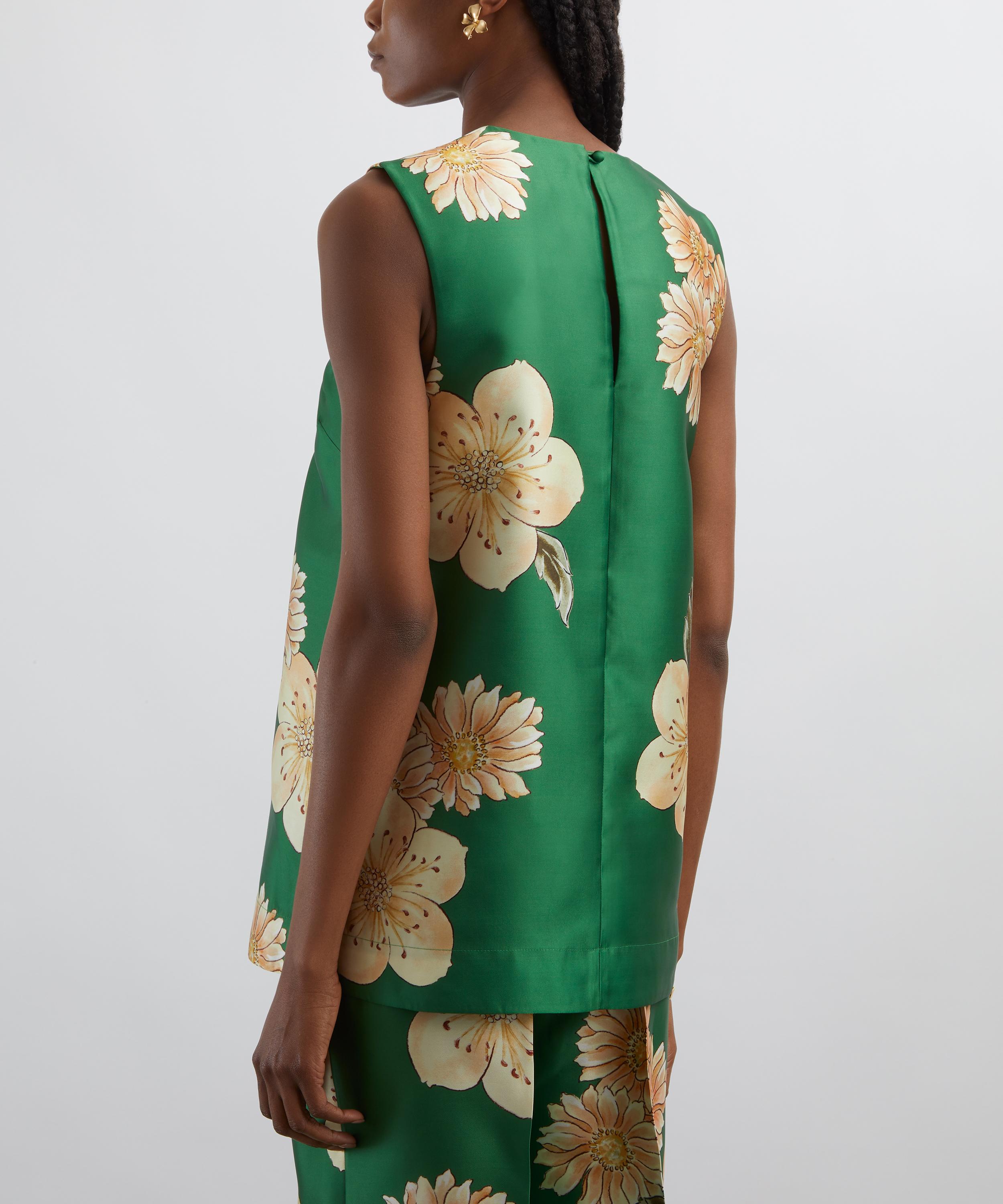 Cut from satin twill and adorned with a verdant floral pattern, this vibrant shirt dress top features a relaxed, sleeveless silhouette, complete with a round neck, and a centre-back keyhole opening.