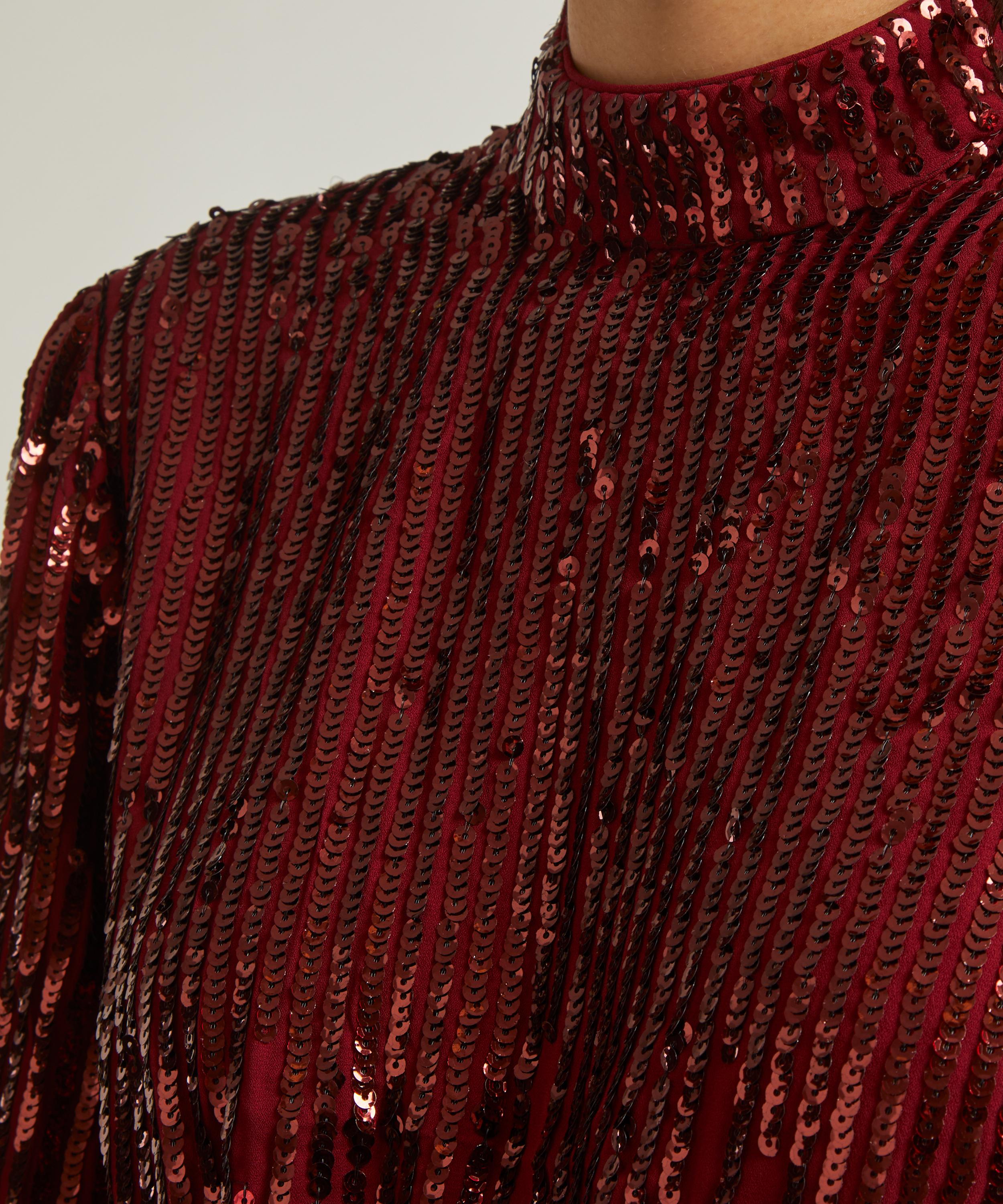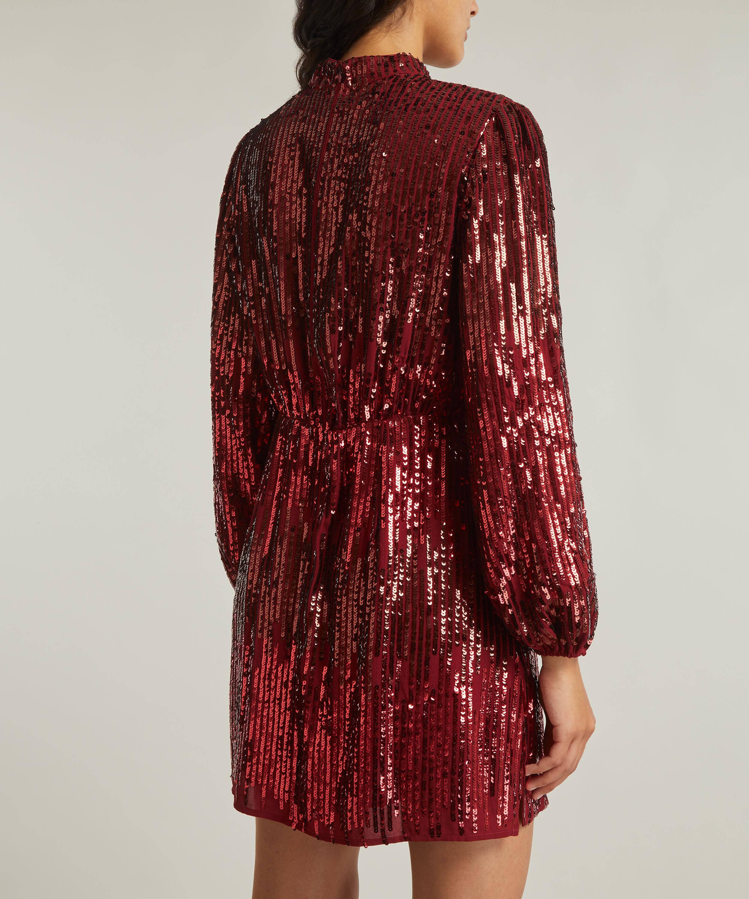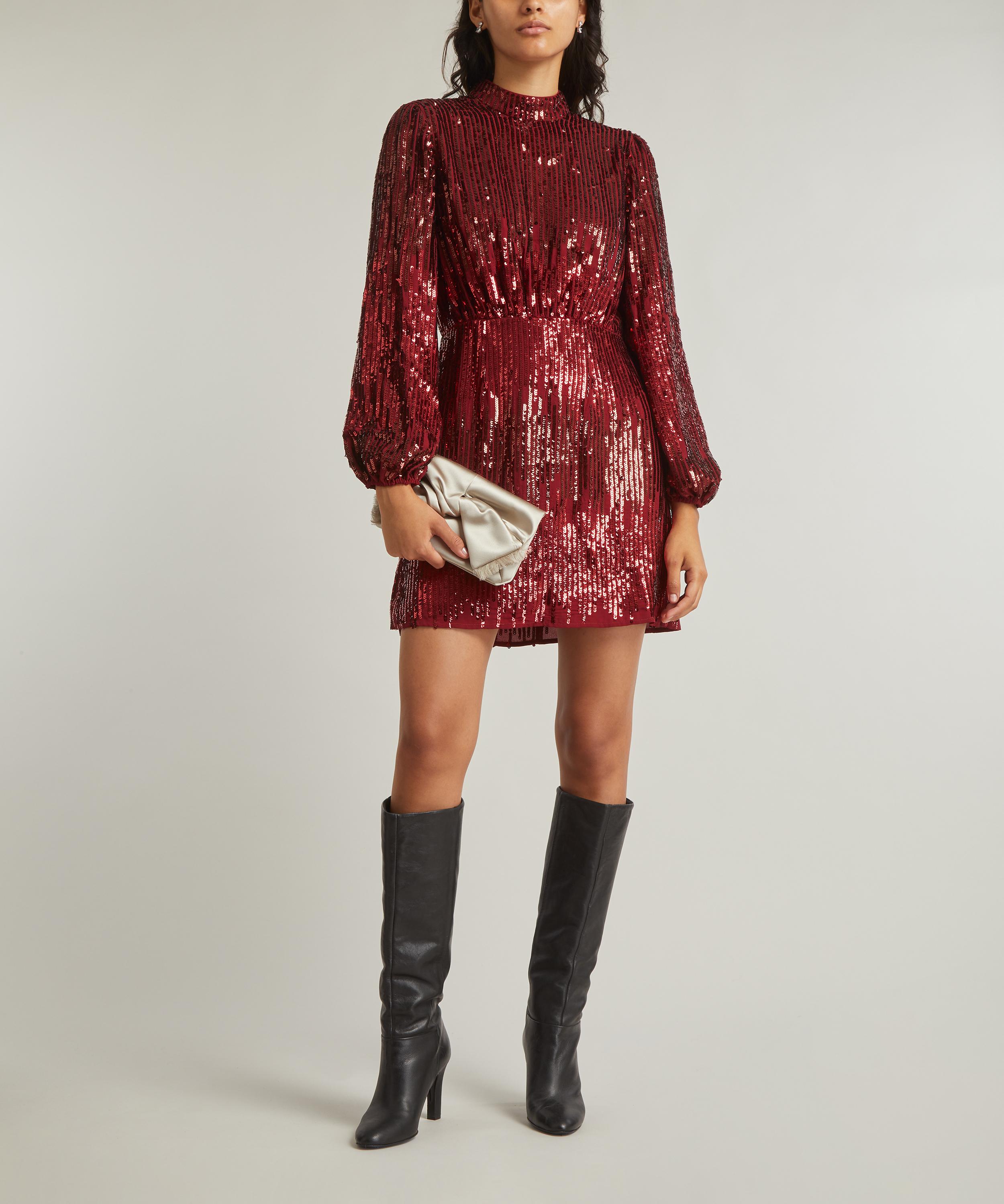 Taking inspiration from ‘60s-style party dresses, this sparkling mini-dress is adorned all-over in burgundy-red sequins. Fitted with a banded neckline and voluminous bishop sleeves, its skimpy short-skirt is perfect for showing-off a pair of statement boots.