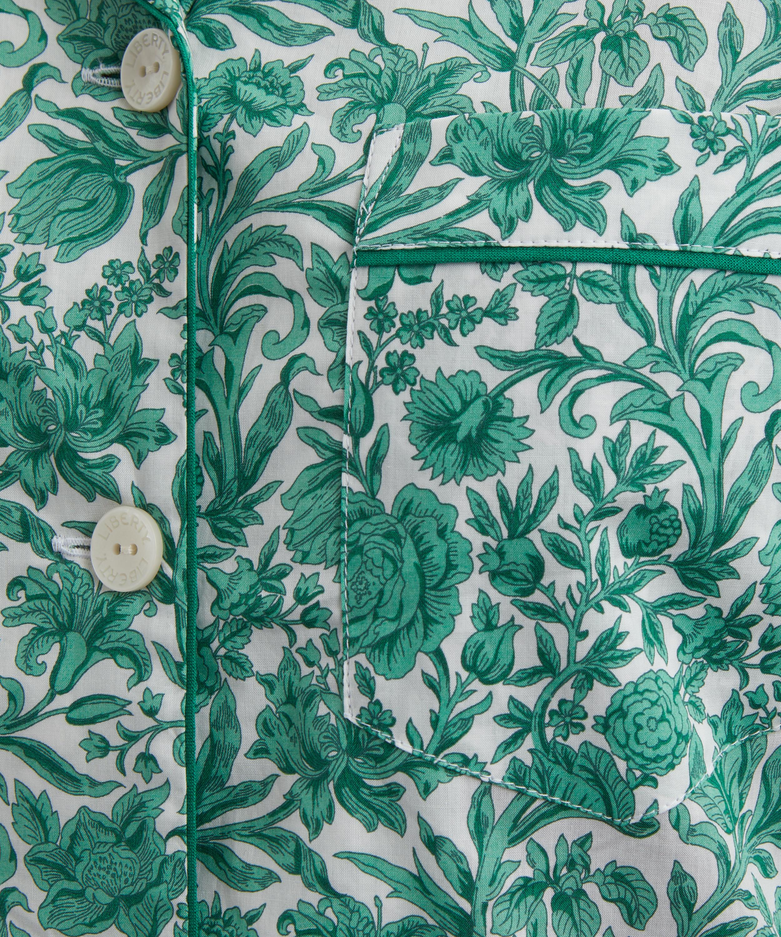 Printed in our very own cutting-edge Liberty fabric mill in northern Italy, this particular pyjama set showcases the Sambourne print - a hand-painted, ornamental monochrome floral print with roses, lilies, pinks, tulips, and pomegranates hiding amongst its trailing foliage.