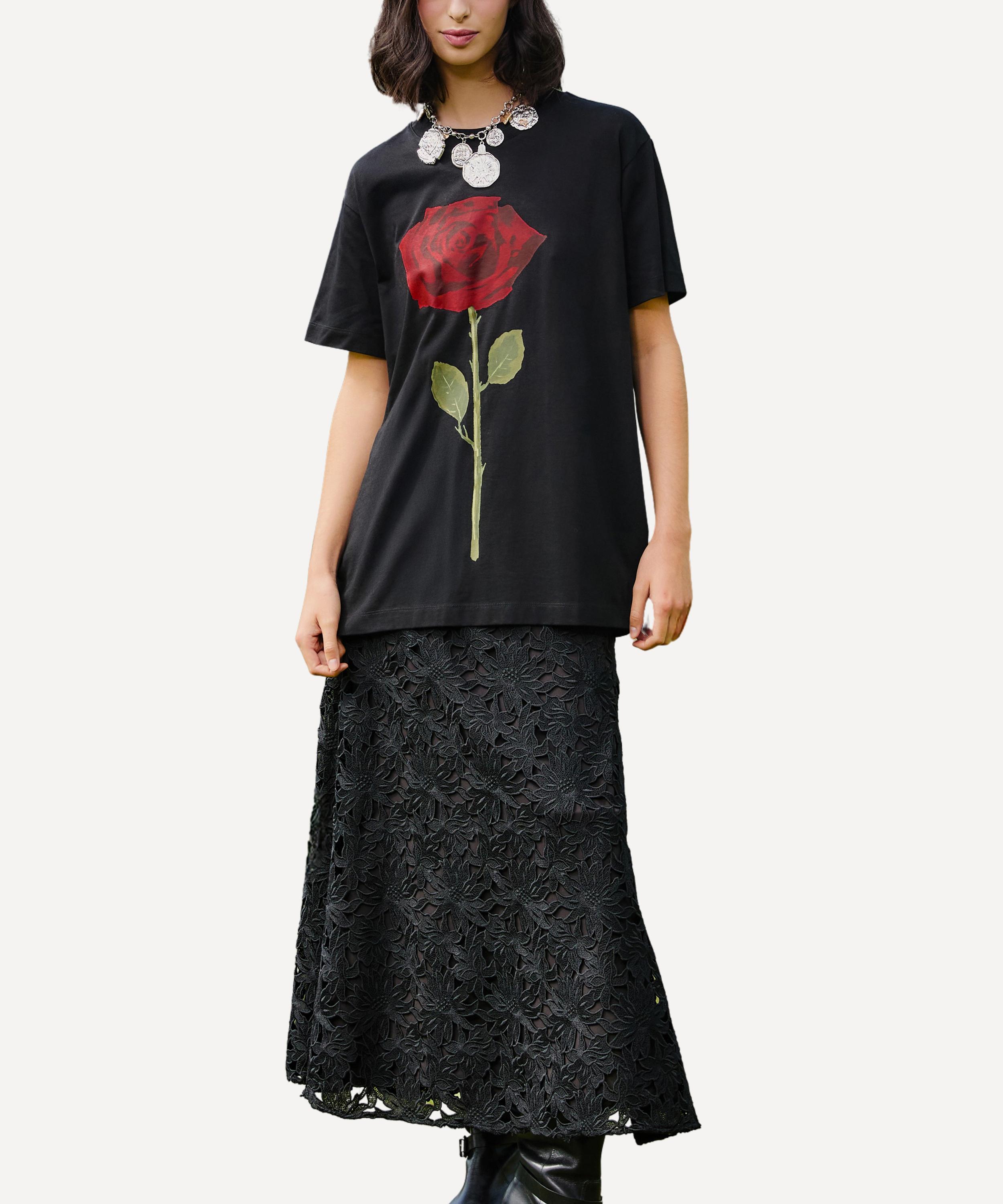 Embrace effortless charm with this relaxed tee, crafted from pure cotton. Its soft sand hue sets the stage for a bold red rose print, while the classic round neckline and easy silhouette offer all-day comfort. A mindful, graceful statement in both style and spirit.