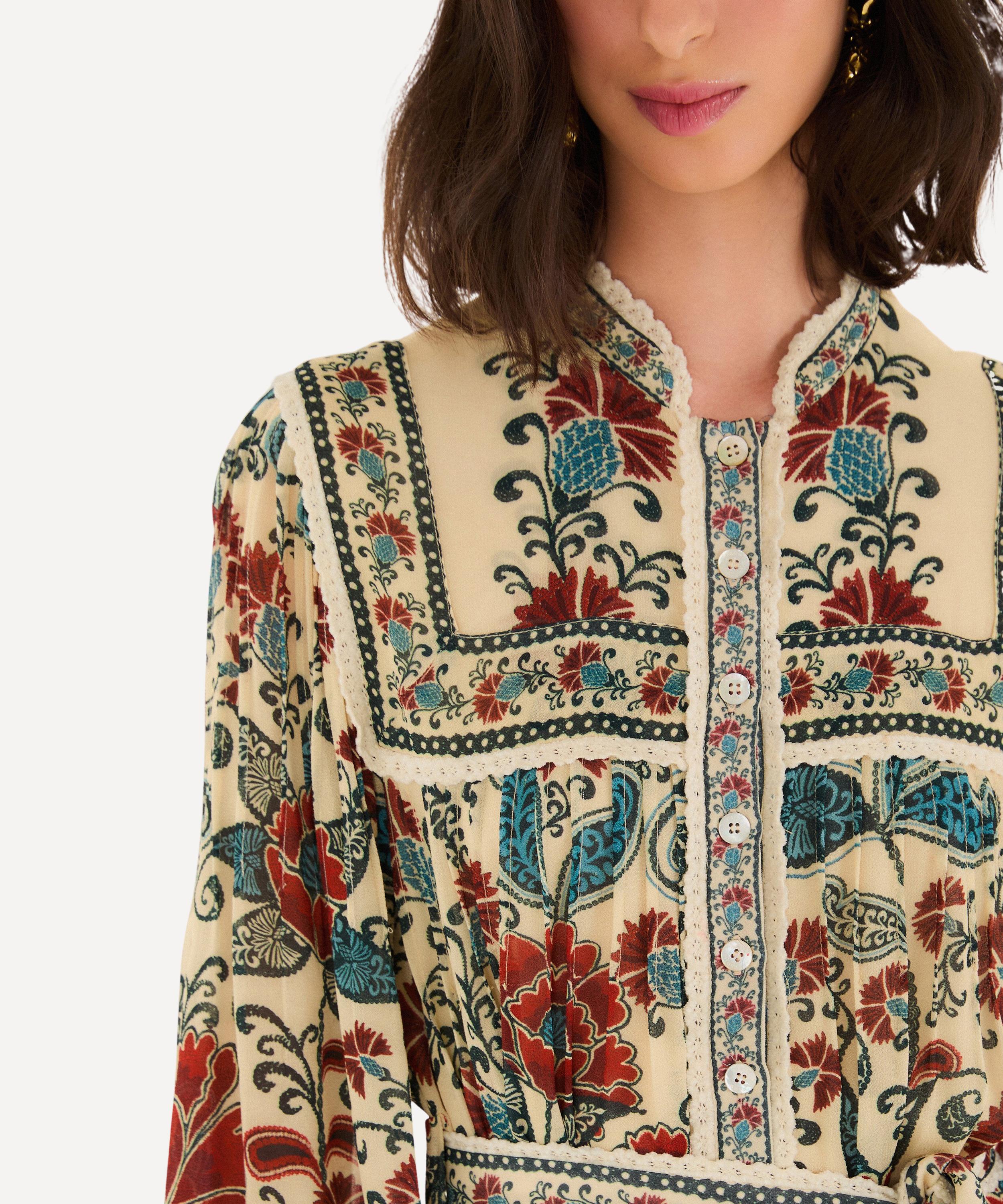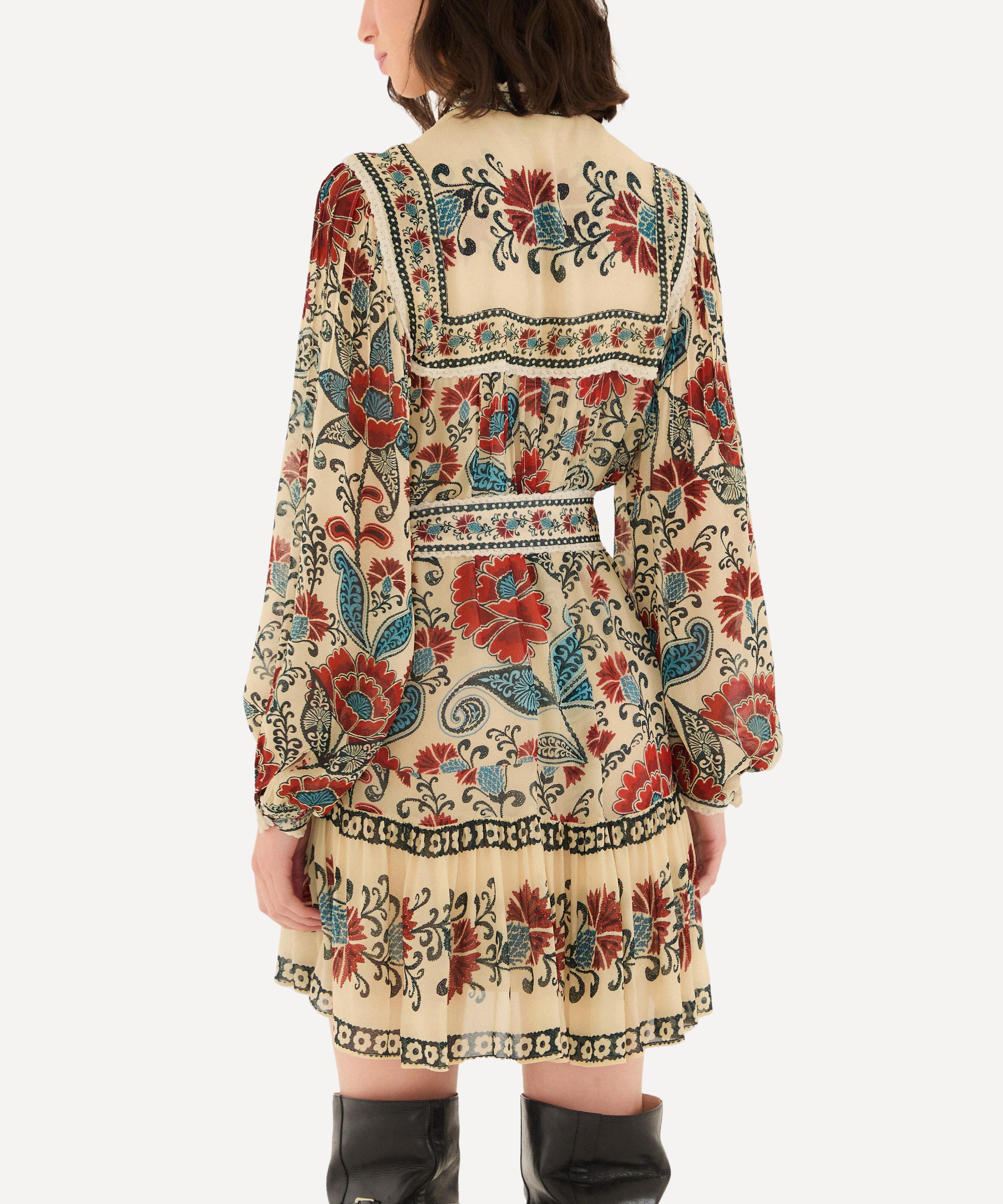 Radiating warmth and charm, this sand-hued mini dress features vibrant floral prints in lush reds and calming blues. A delicate round neckline, gathered yoke, and softly puffed sleeves create a playful silhouette, while a matching belt adds gentle definition - blending comfort with joyful elegance.