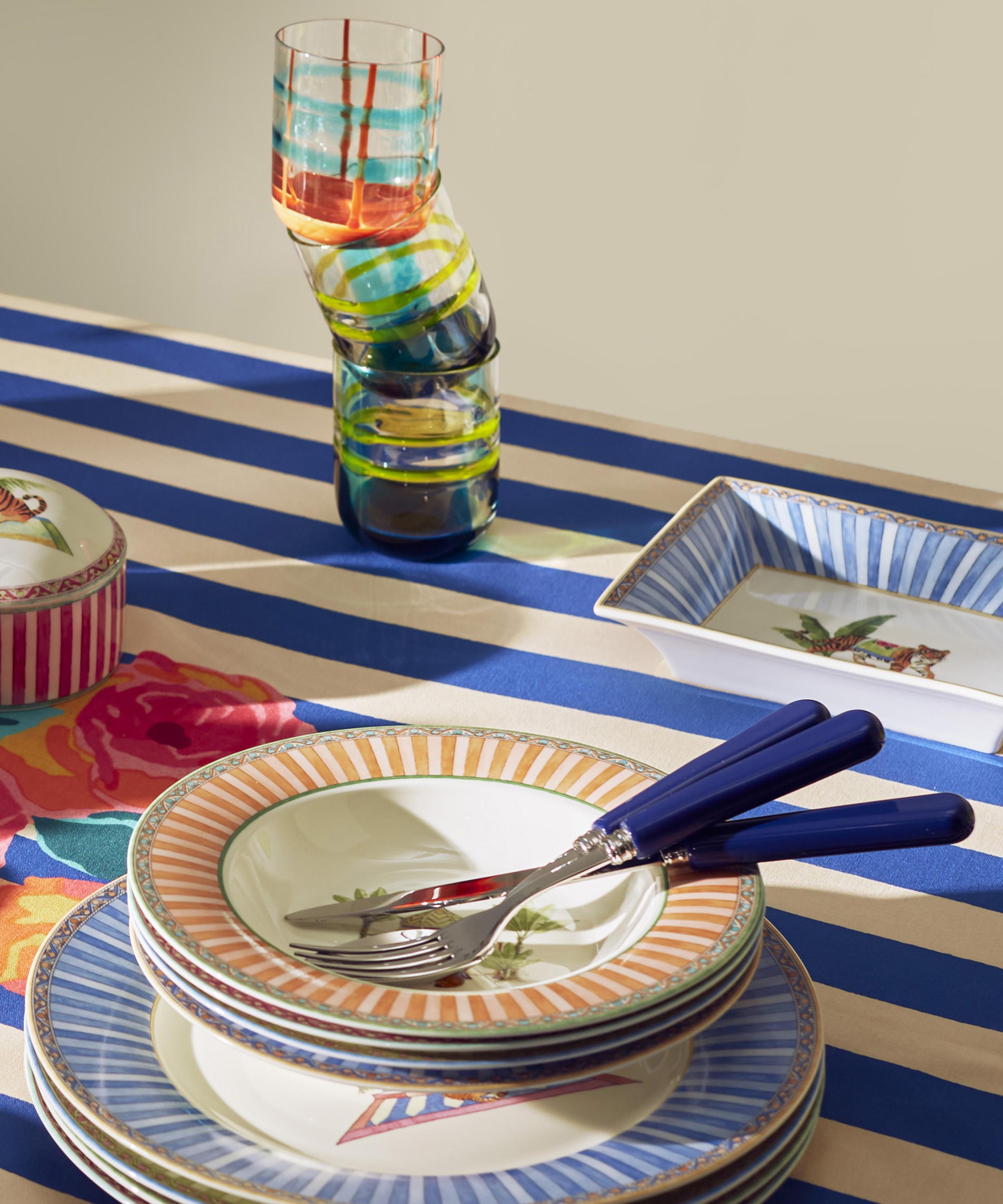 From Lisa Corti’s first foray into womenswear in 1963 to the international design emporium her daughter Ida presides over today, her namesake brand has become an emblem of elegance that transcends seasons and generations in inimitable style. Today Lisa divides her time between India and Italy, relentlessly exploring the art and culture of beauty and adding new designs to her unique aesthetic. For over sixty years now her trademark collection of mezzeri, tableware, cushions, bedspreads, tapestries and as well as curtains and ready to wear, has embodied a joyous sophistication - look to the brand to effortlessly enrich any space or look with an eclectic charm.