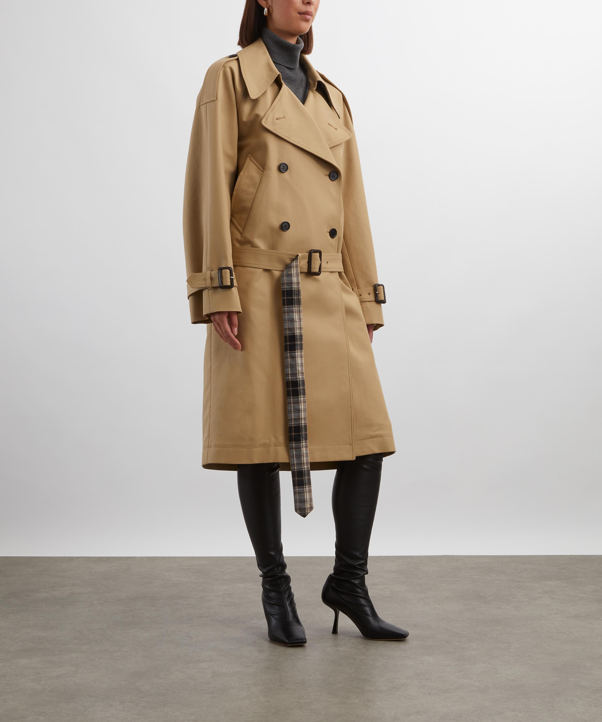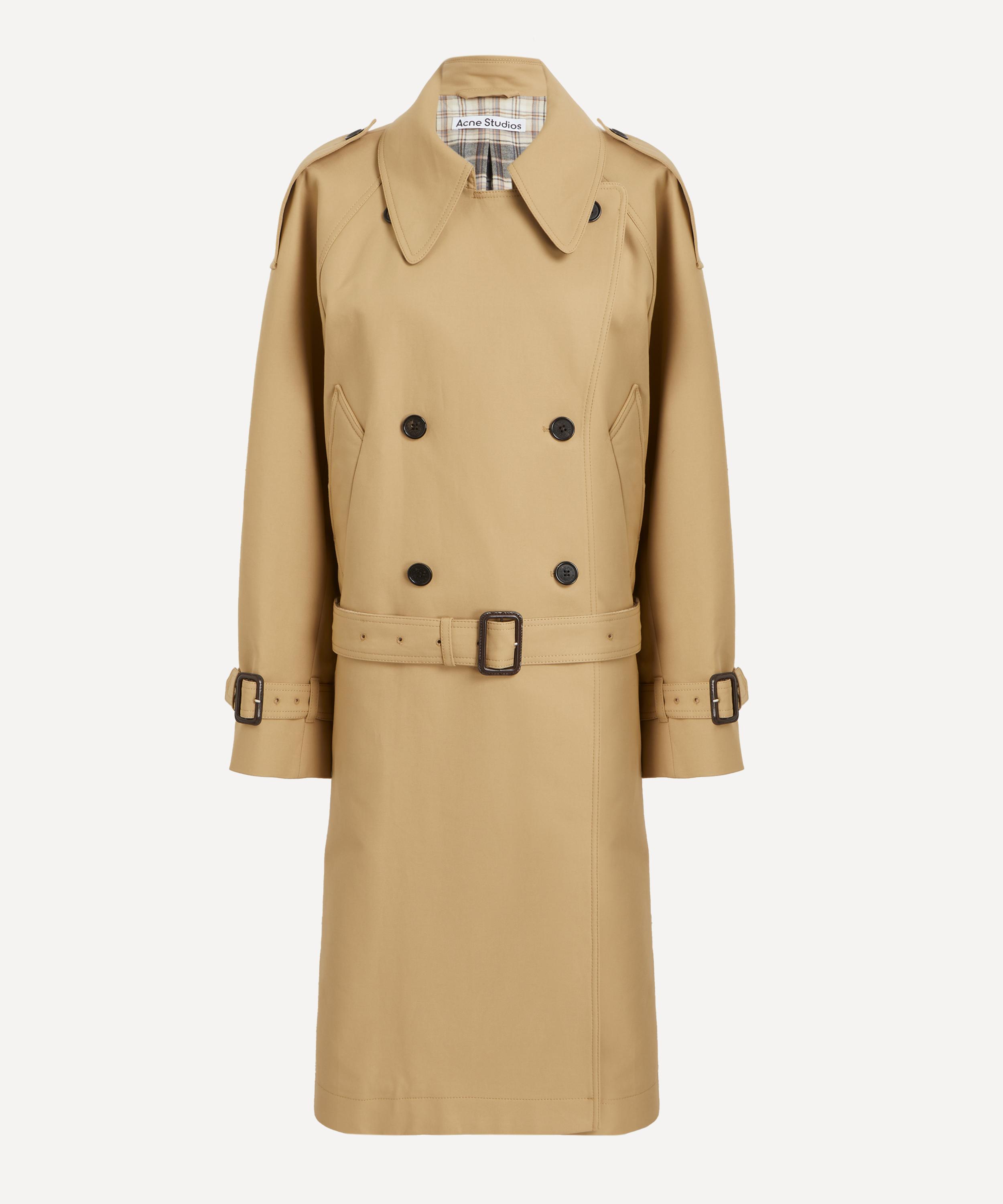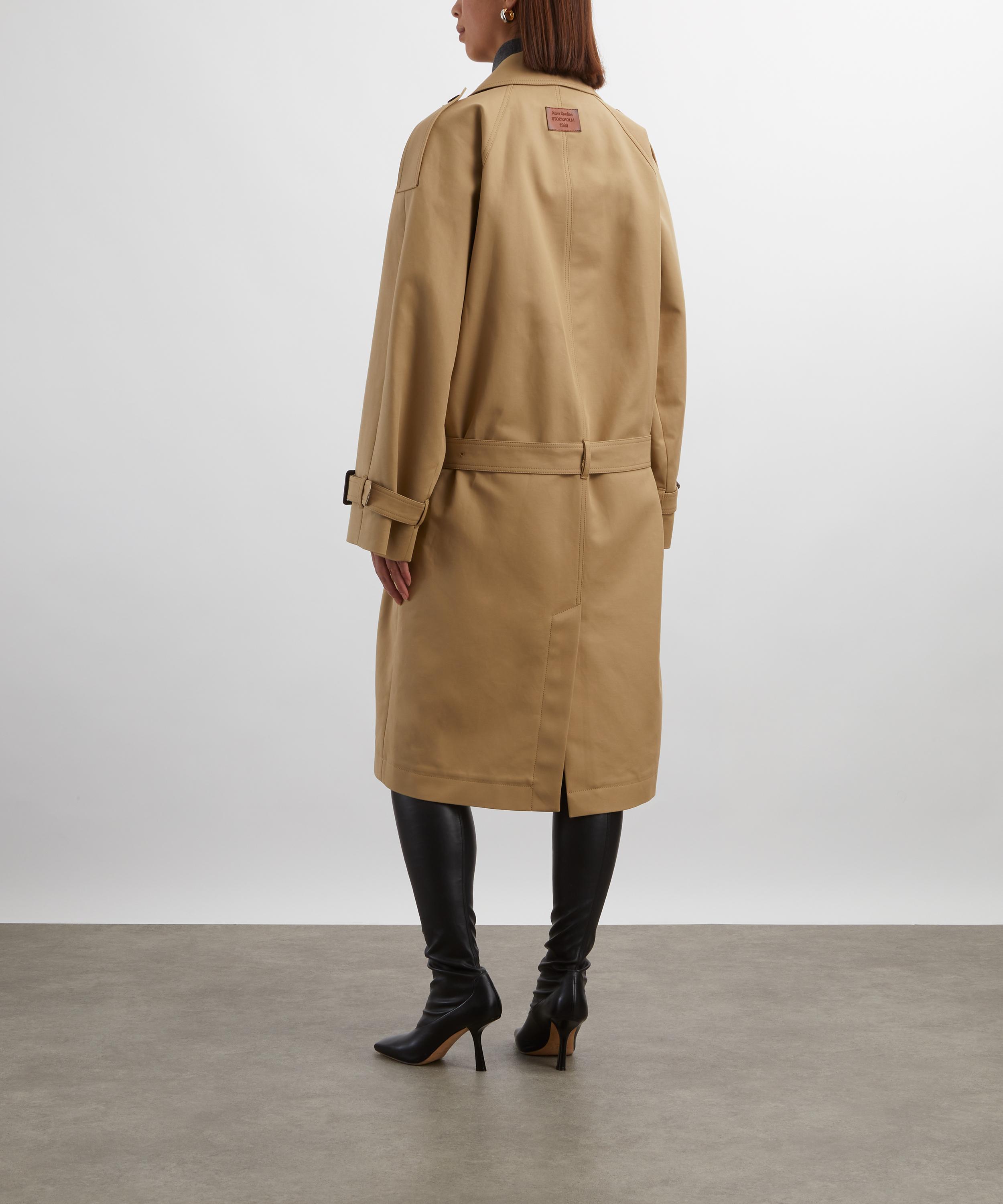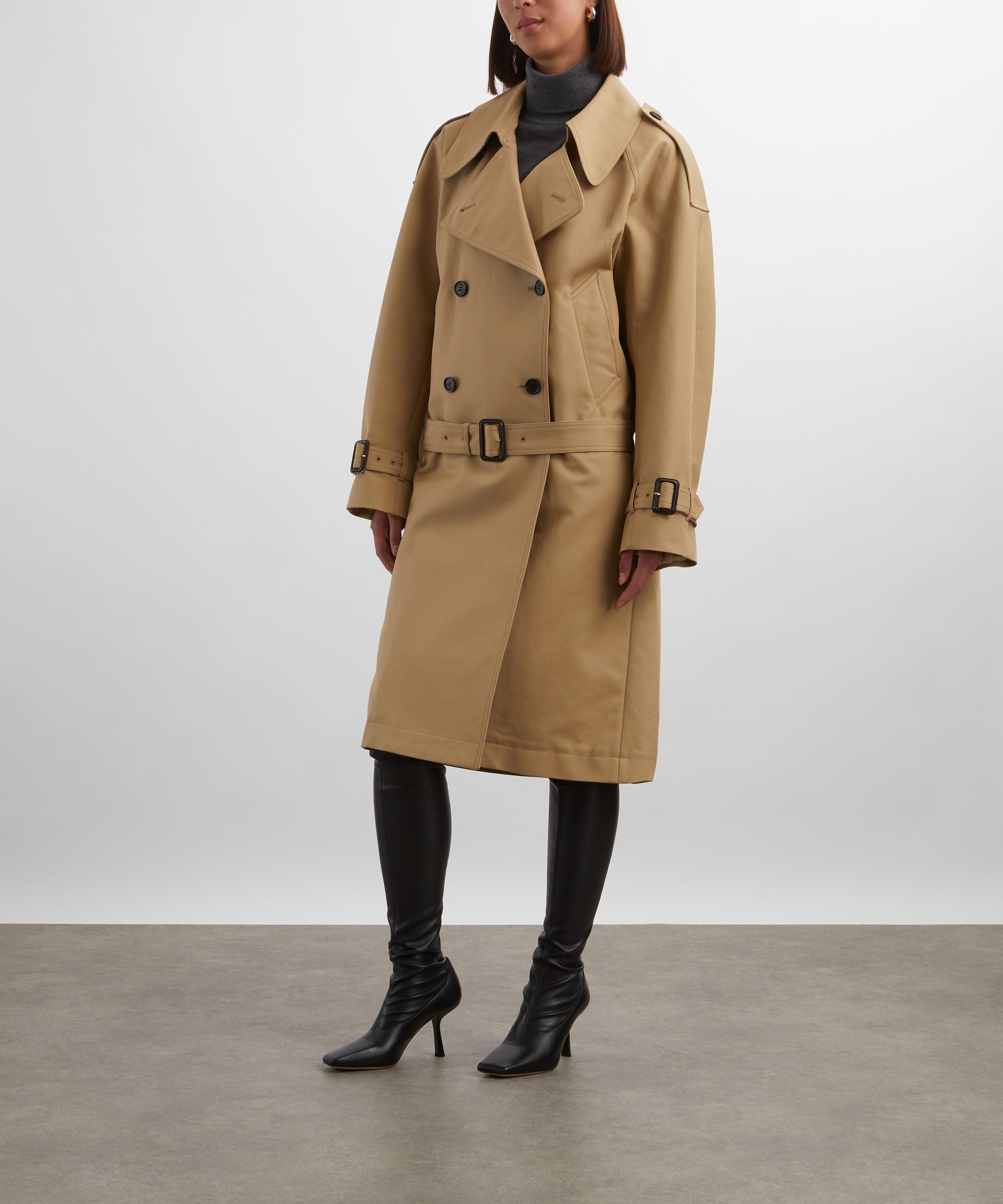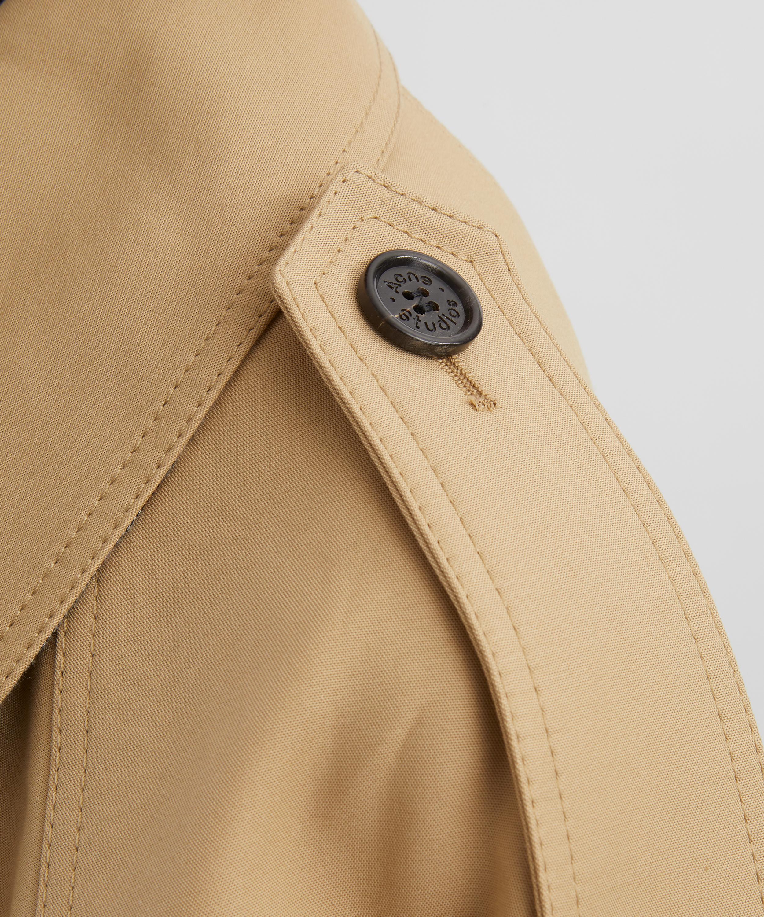 Crafted from smooth satin double-structured cotton in a classic beige hue, this contemporary take on the timeless trench coat is cut to a relaxed fit and features shoulder epaulettes, cuff straps, a button-up front, and a dropped waist that sits at the hips.