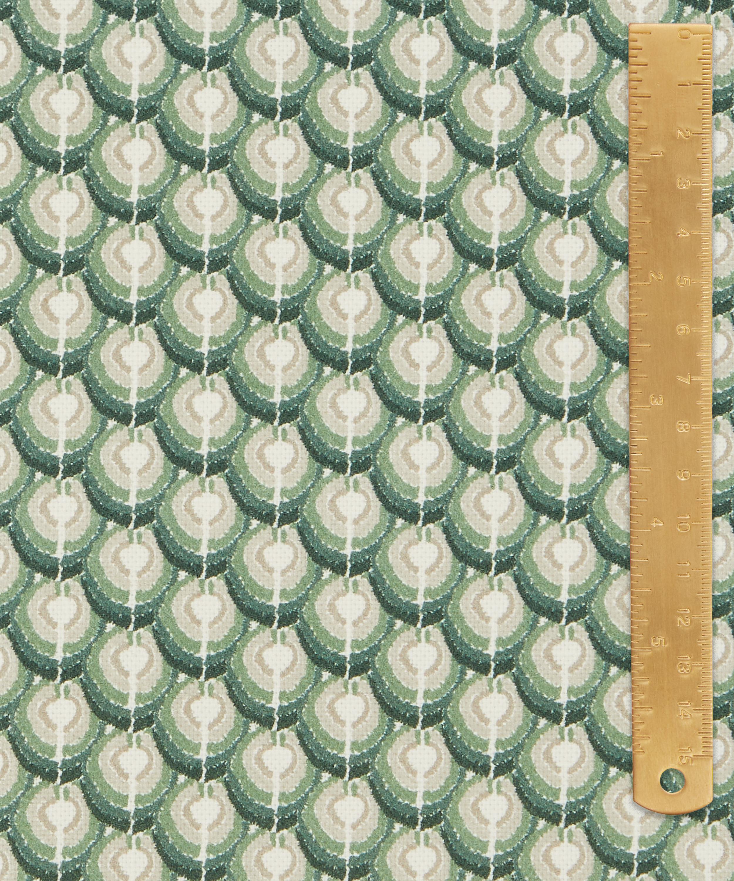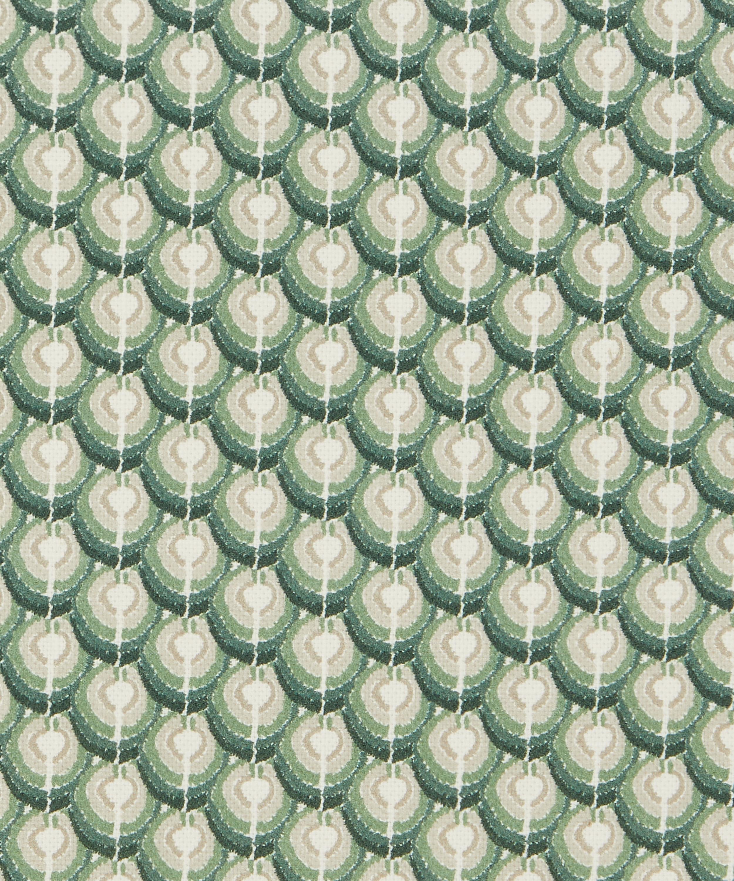 Inspired by the iconic markings of regal peacock feathers, this all-over geometric design was originally drawn with the decisive mark-making of oil pastels, providing a hand-drawn aesthetic to an otherwise graphic print.