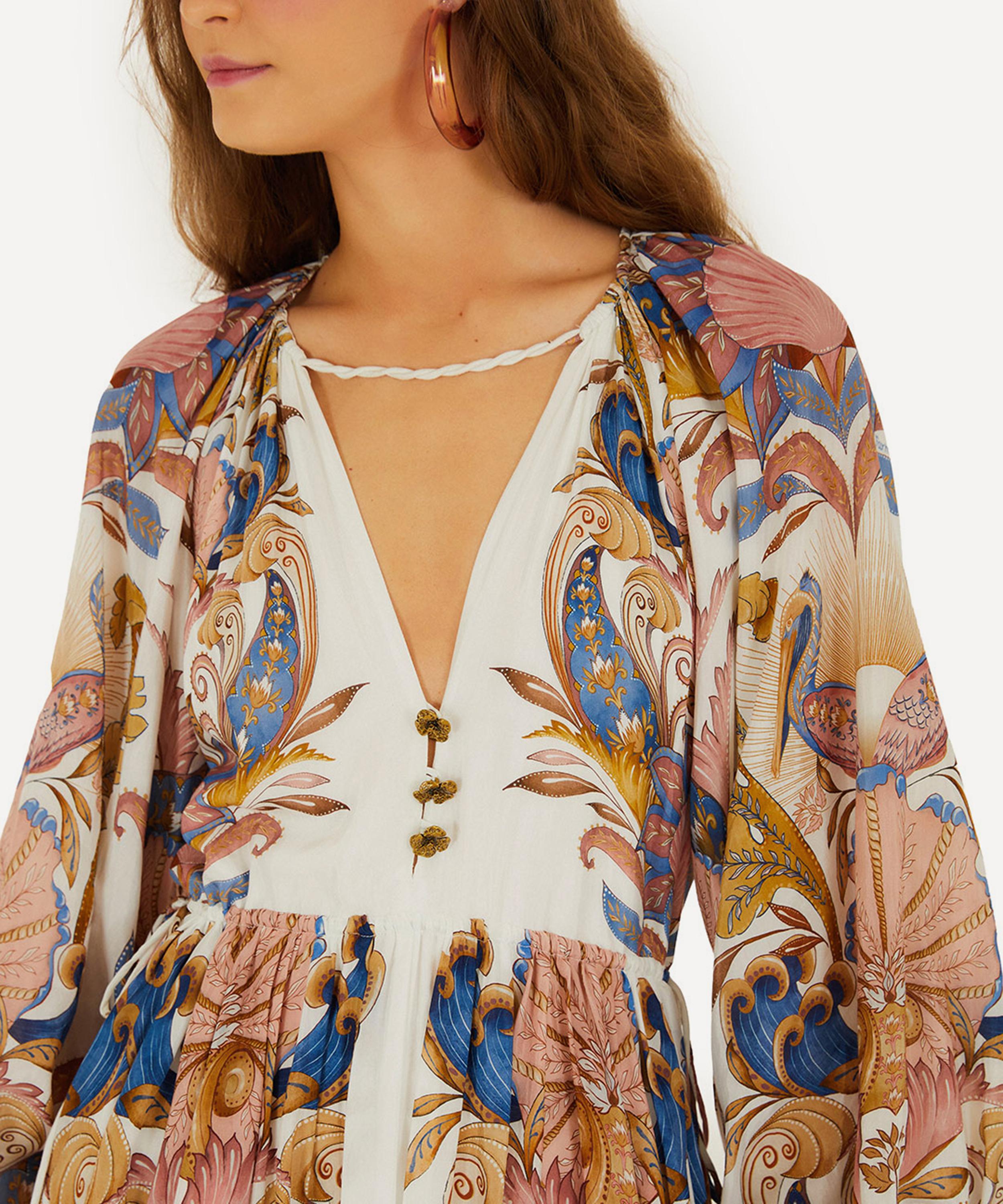Crafted from lightweight, breathable linen and adorned with a bold floral and shell print, this mini dress features a deep V-neckline, long puff sleeves, and a voluminous balloon skirt that falls to a playful mini length.