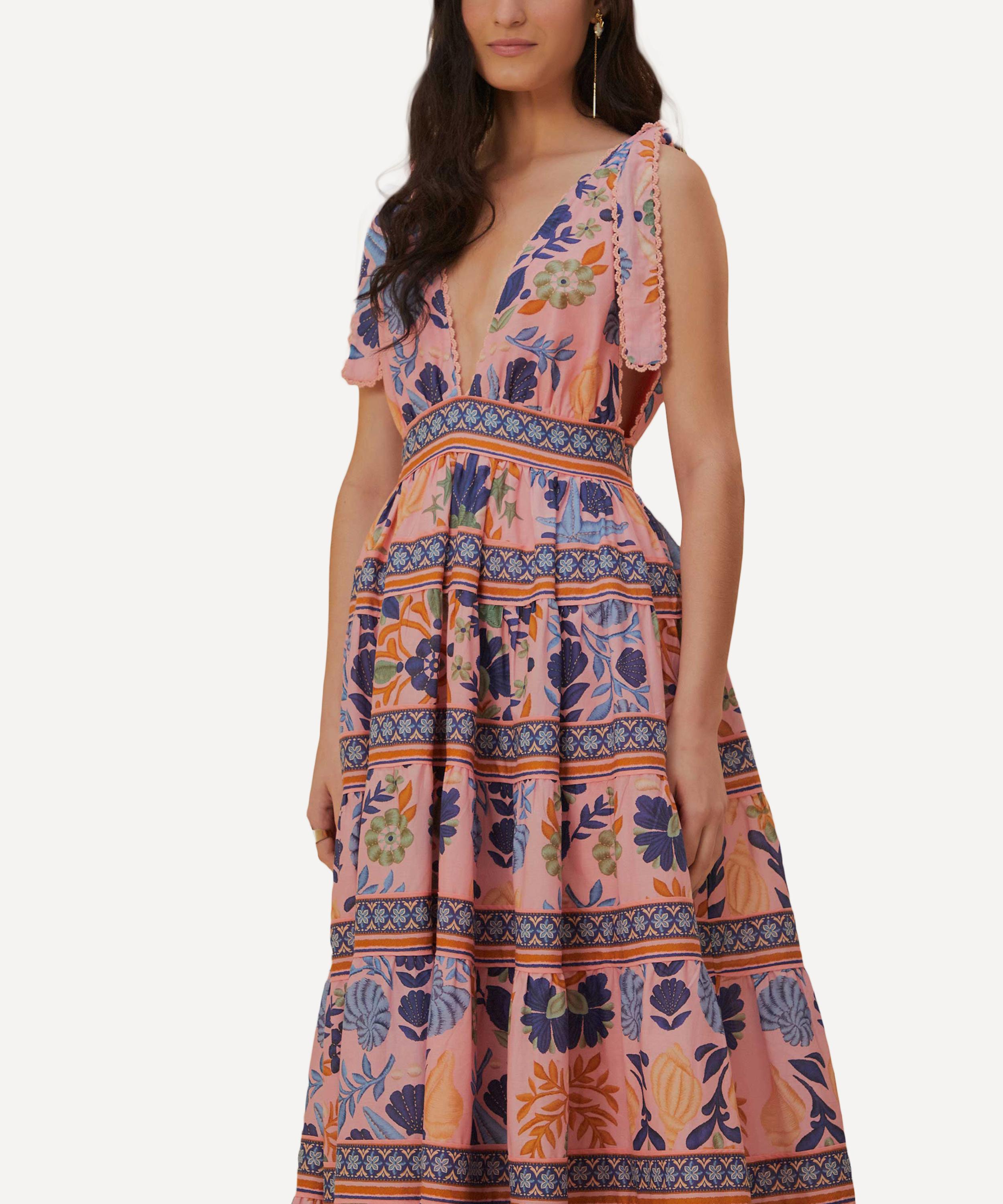 The Seashell Tapestry Pink Midi-Dress from Rio de Janeiro-based label FARM Rio brings some Brazilian vivacity to your new-season edit.