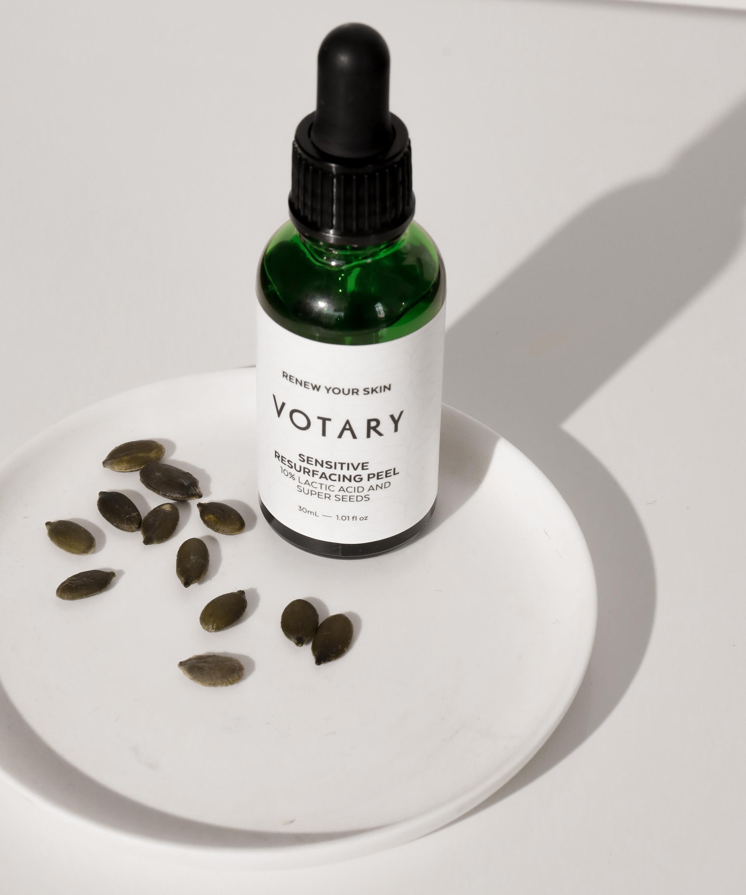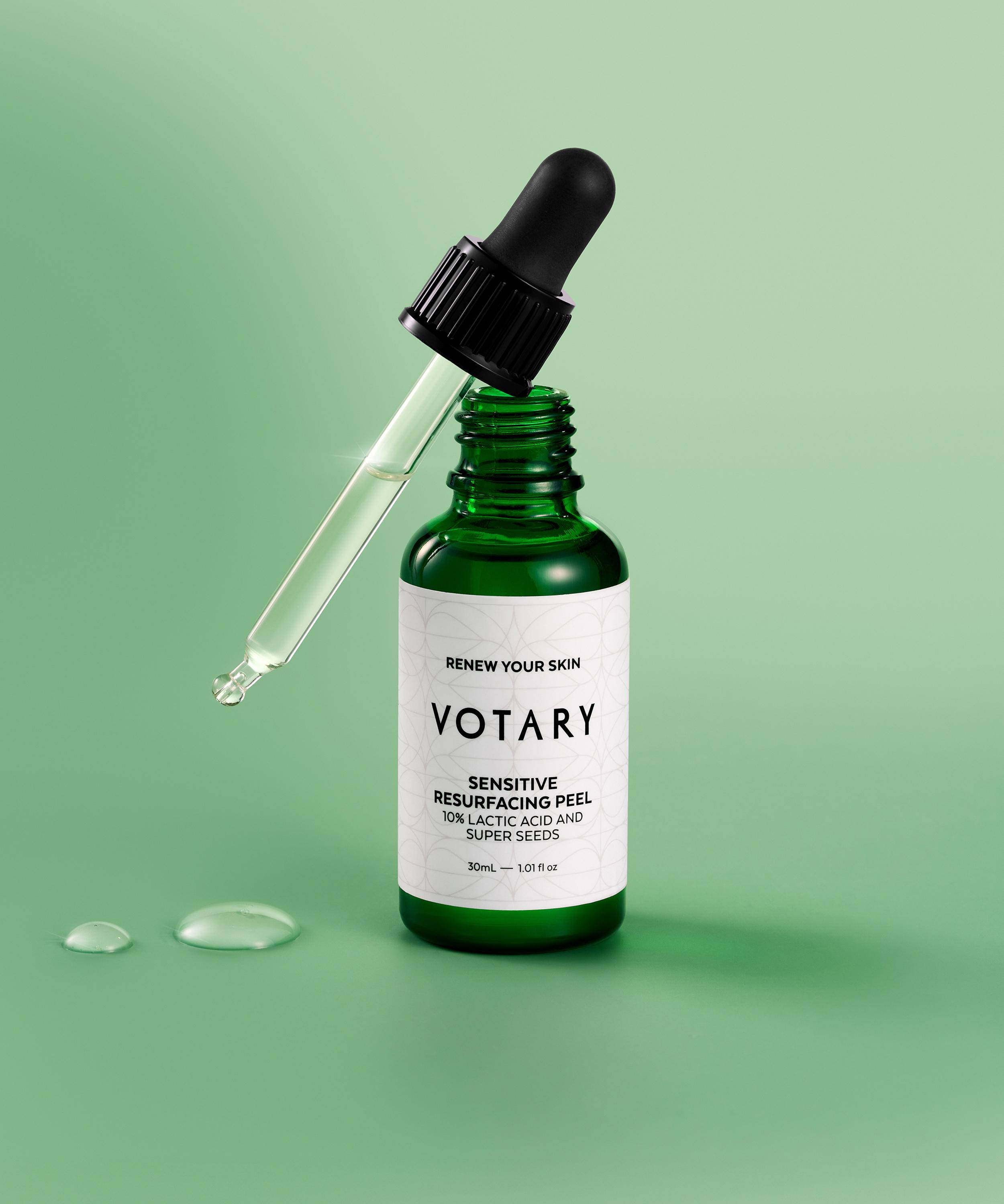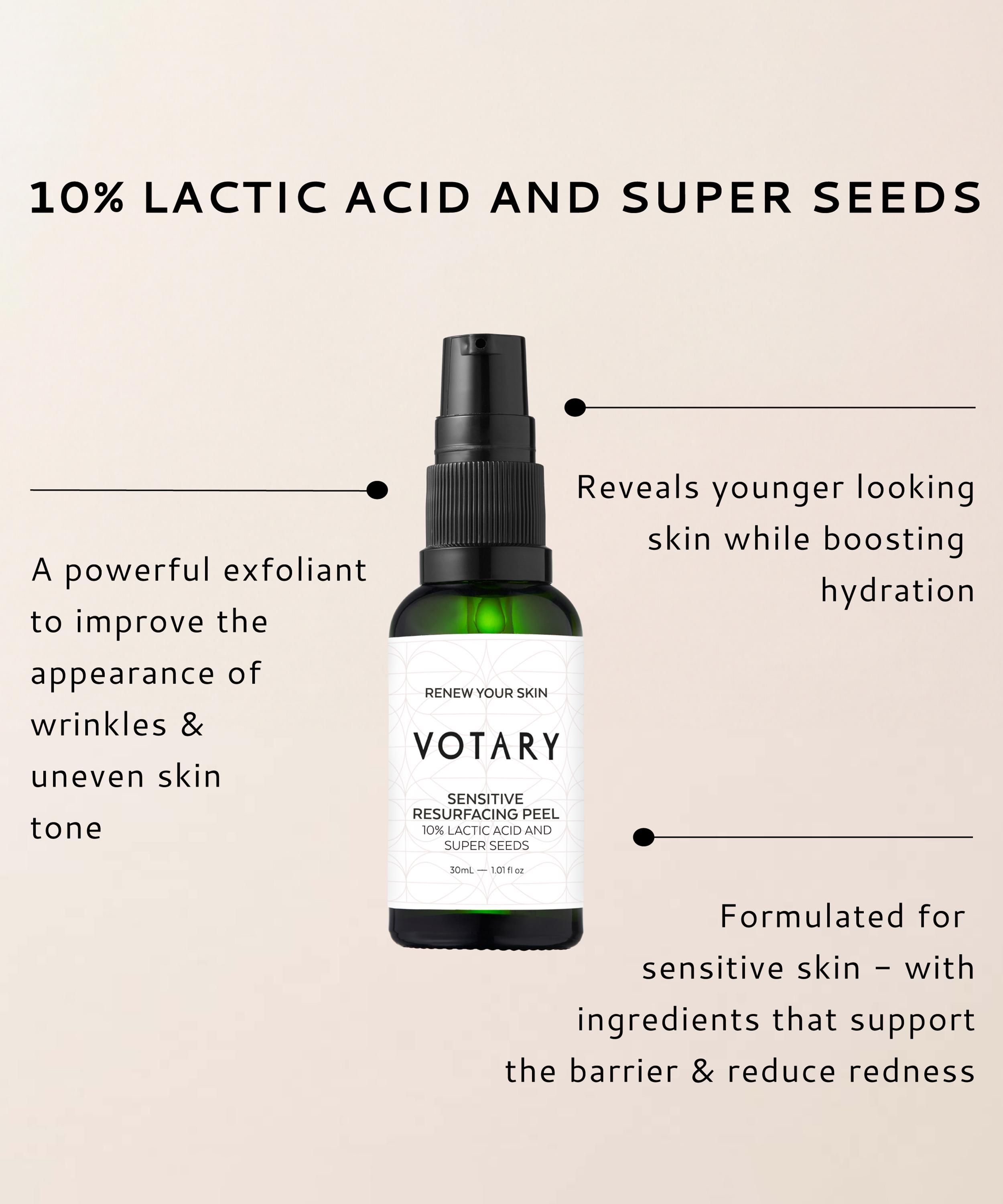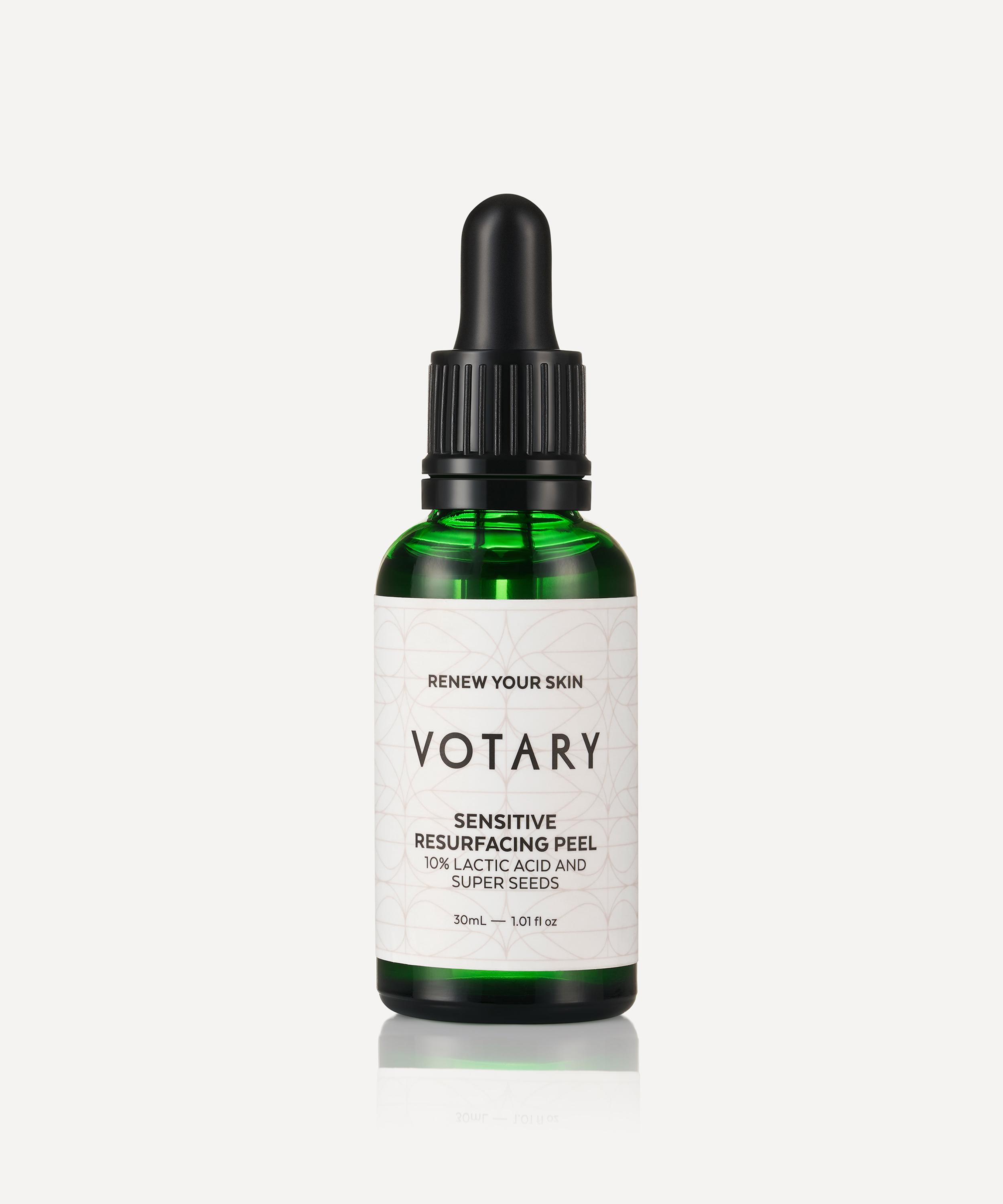 Discover a more balanced, youthful-looking complexion with Votary's transformative Sensitive Resurfacing Peel, infused with 10% lactic acid for powerful results.