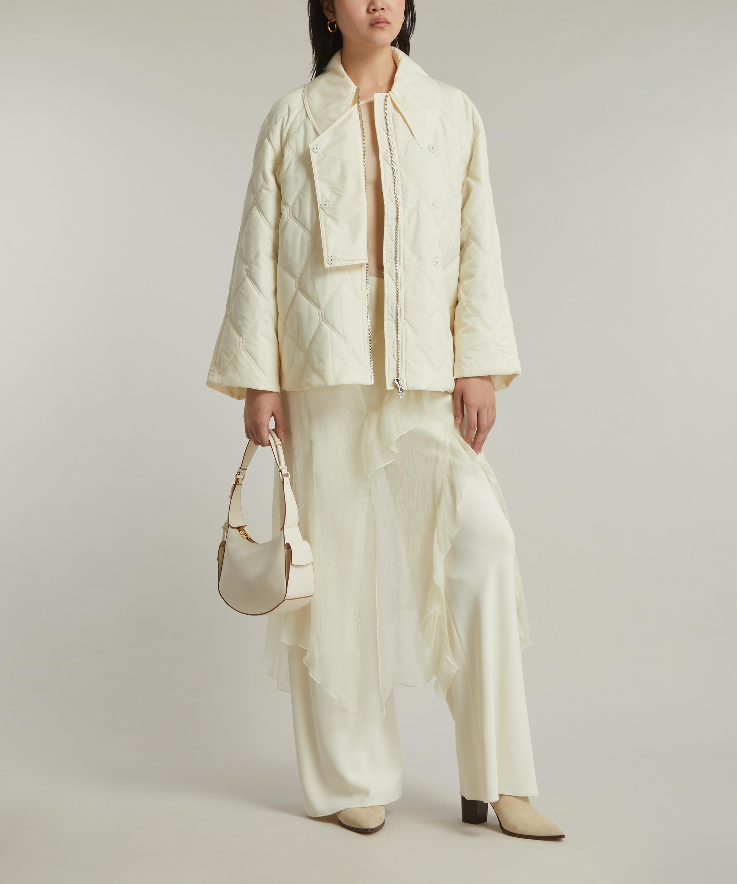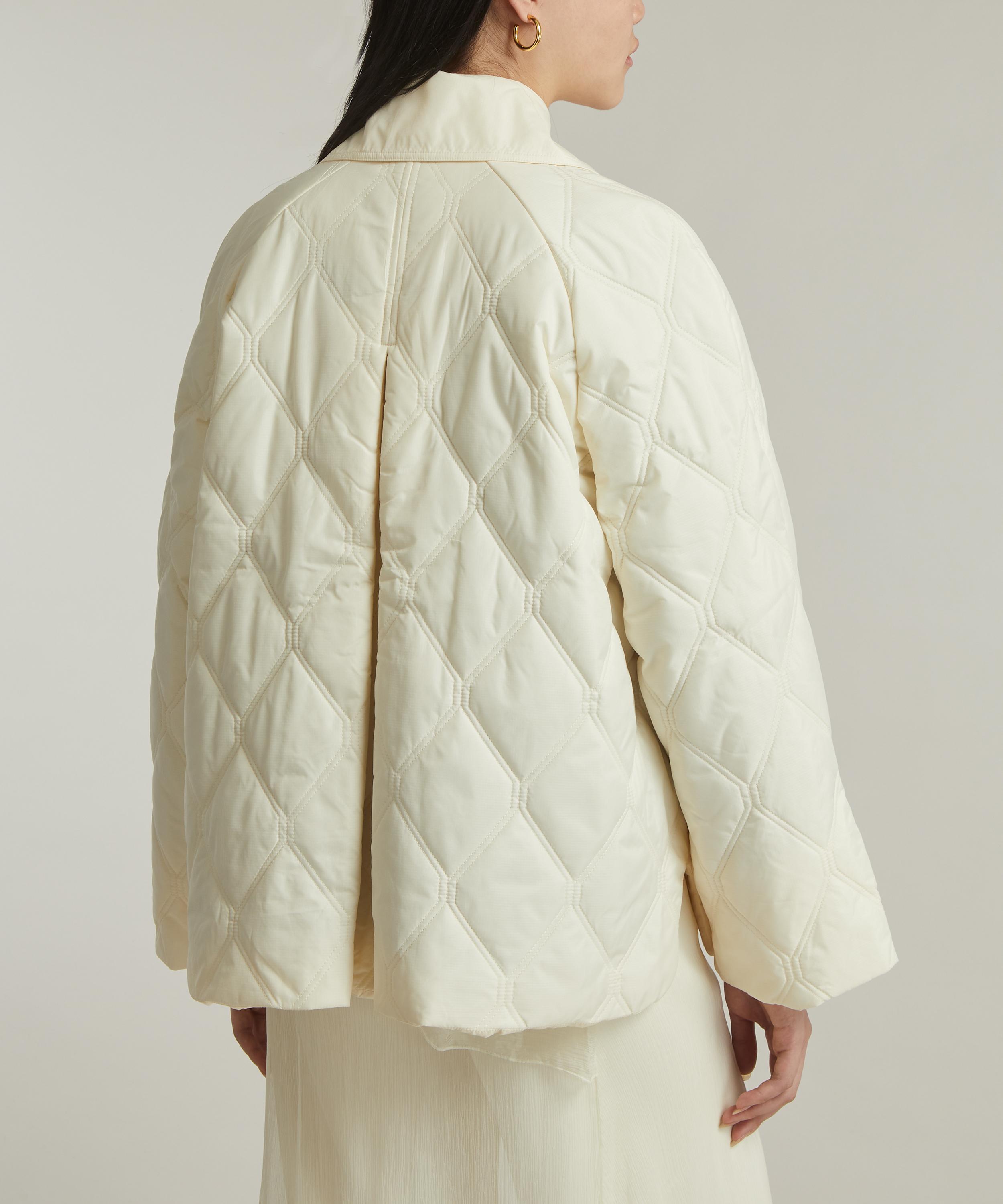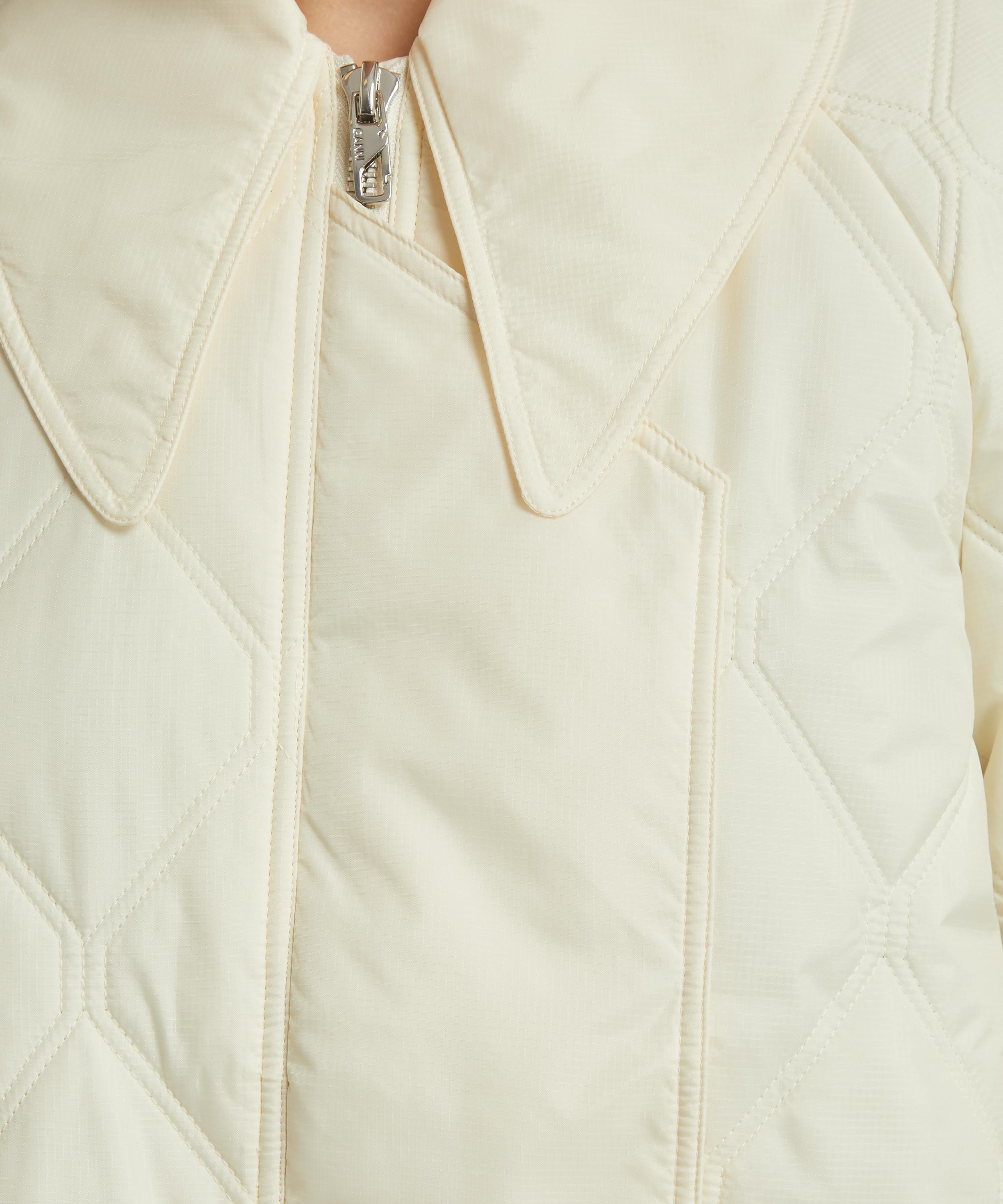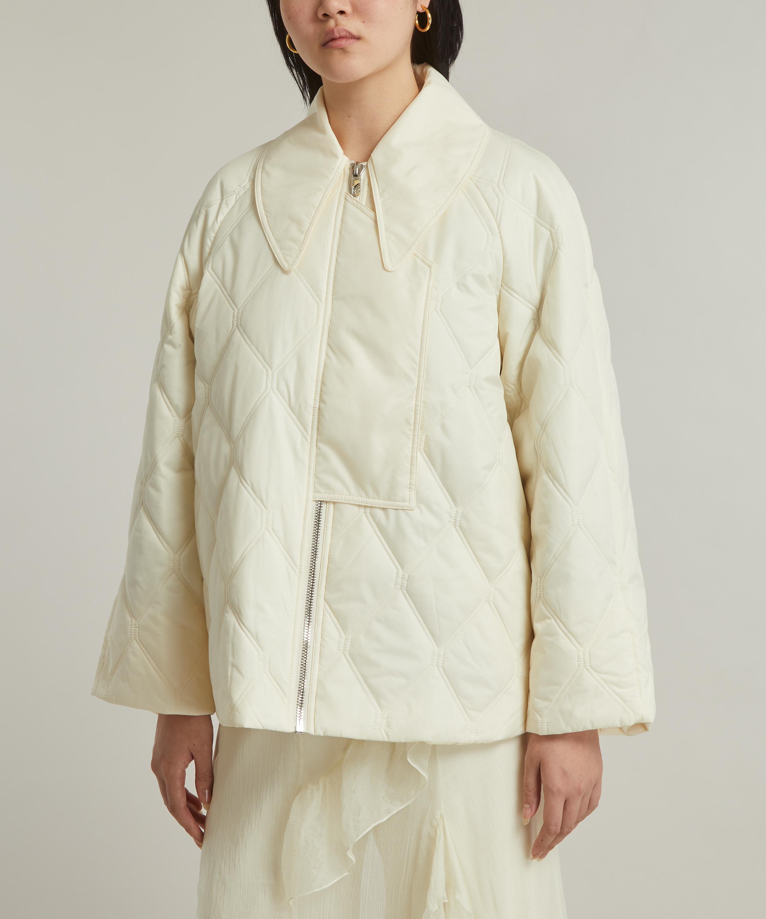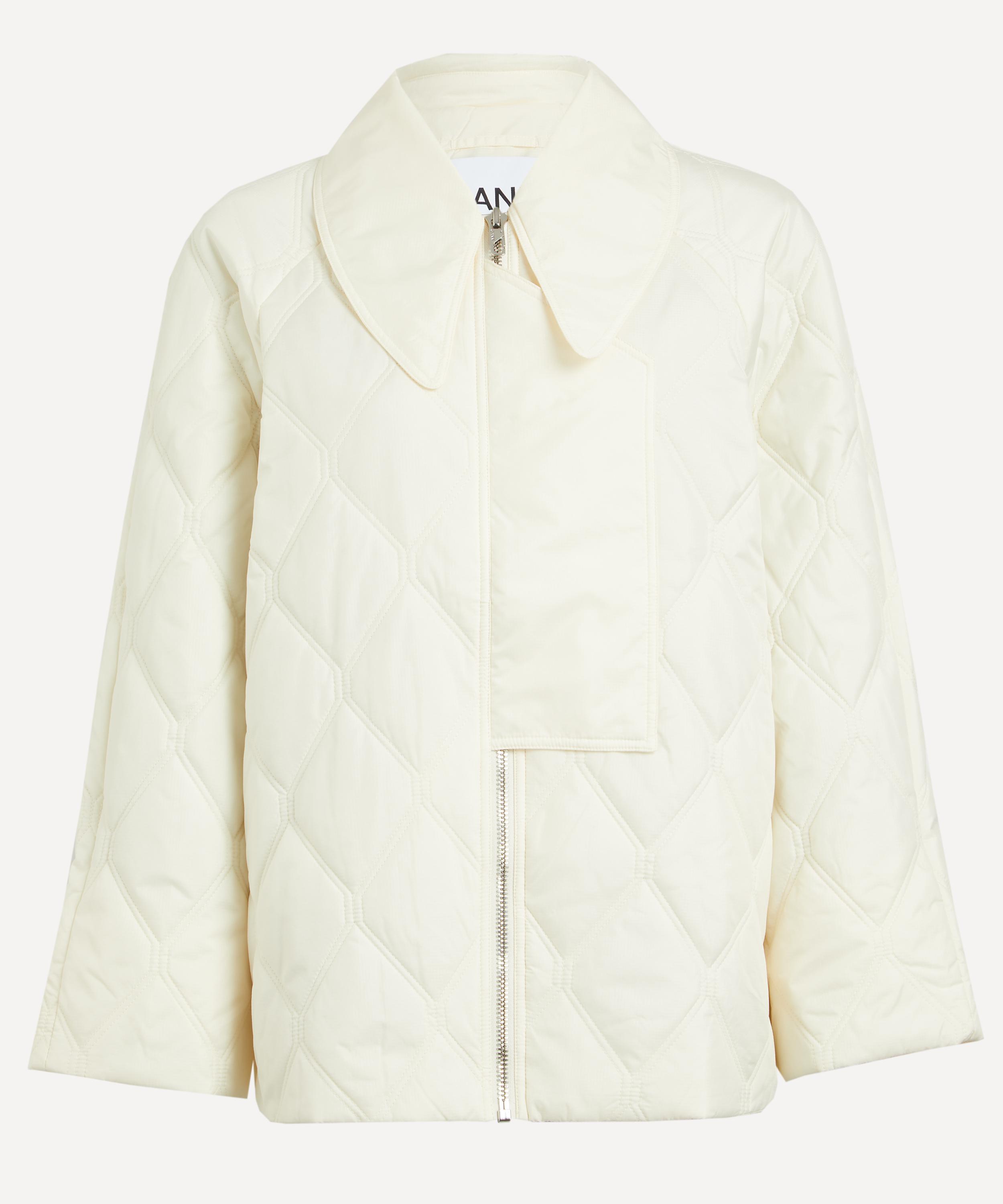 Elevate your outerwear edit the Scandi-Cool way with the Quilted Jacket from cult label GANNI. Cut from a technical ripstop fabric for a relaxed fit, this playful jacket features a diamond quilted design, asymmetrical button closure, zip-front fastening, an exaggerated collar, a box pleat in the back, and two side pockets for a polished and practical finish.