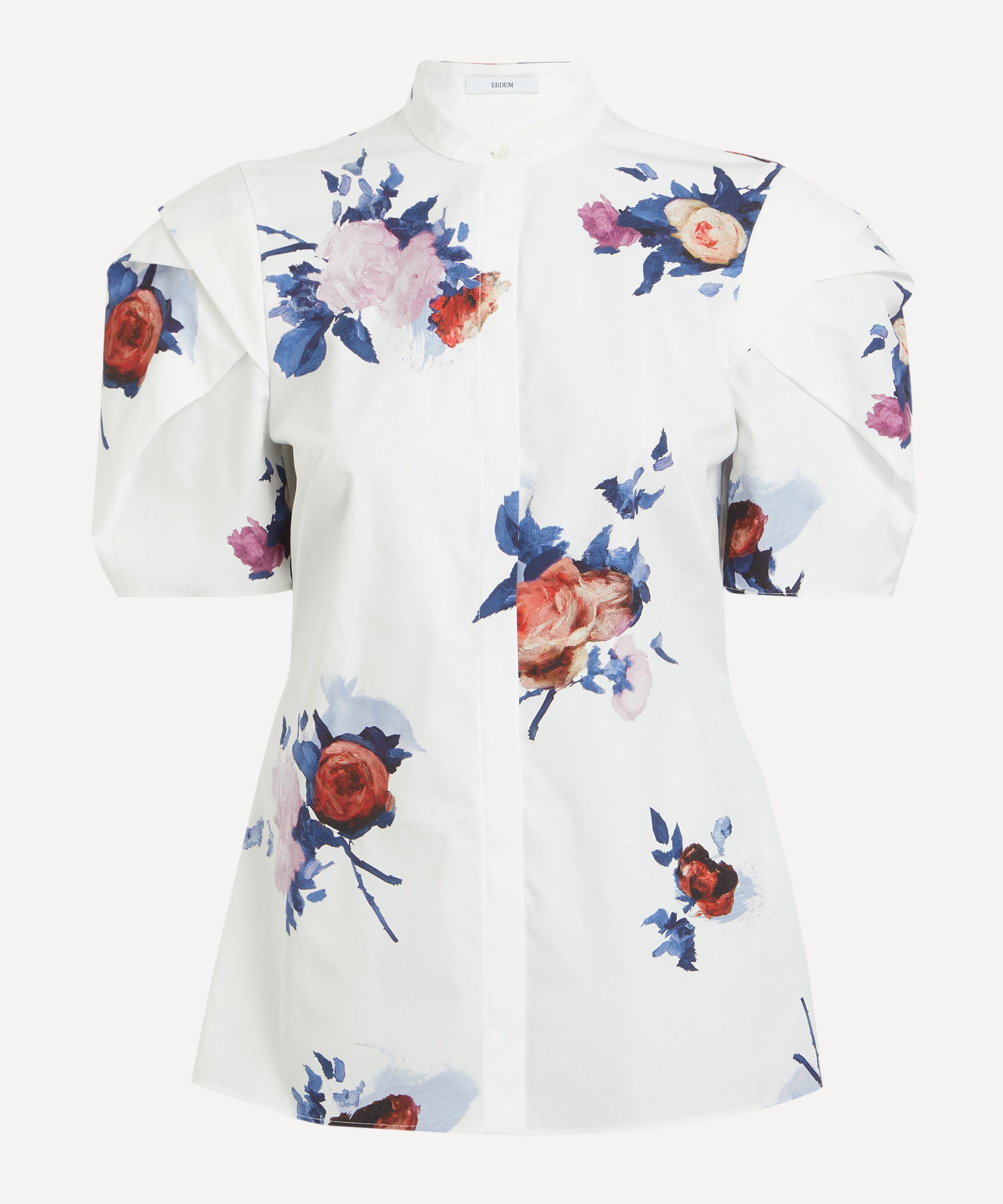 Crafted from structured cotton poplin and adorned with painterly rose bouquets, this short-sleeve top features a flattering fitted silhouette, complemented by a stand collar and concealed button fastening for a timeless and refined finish.