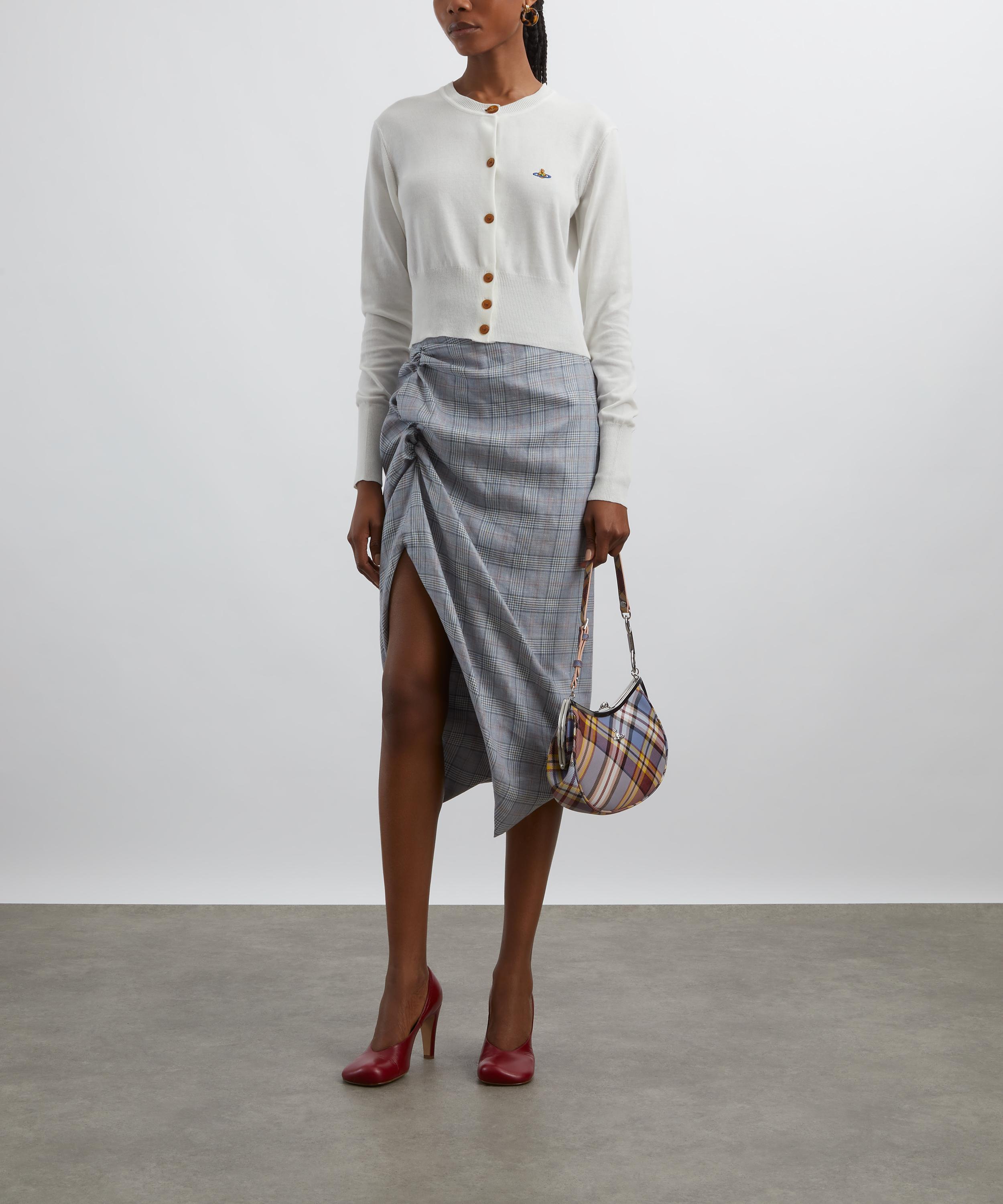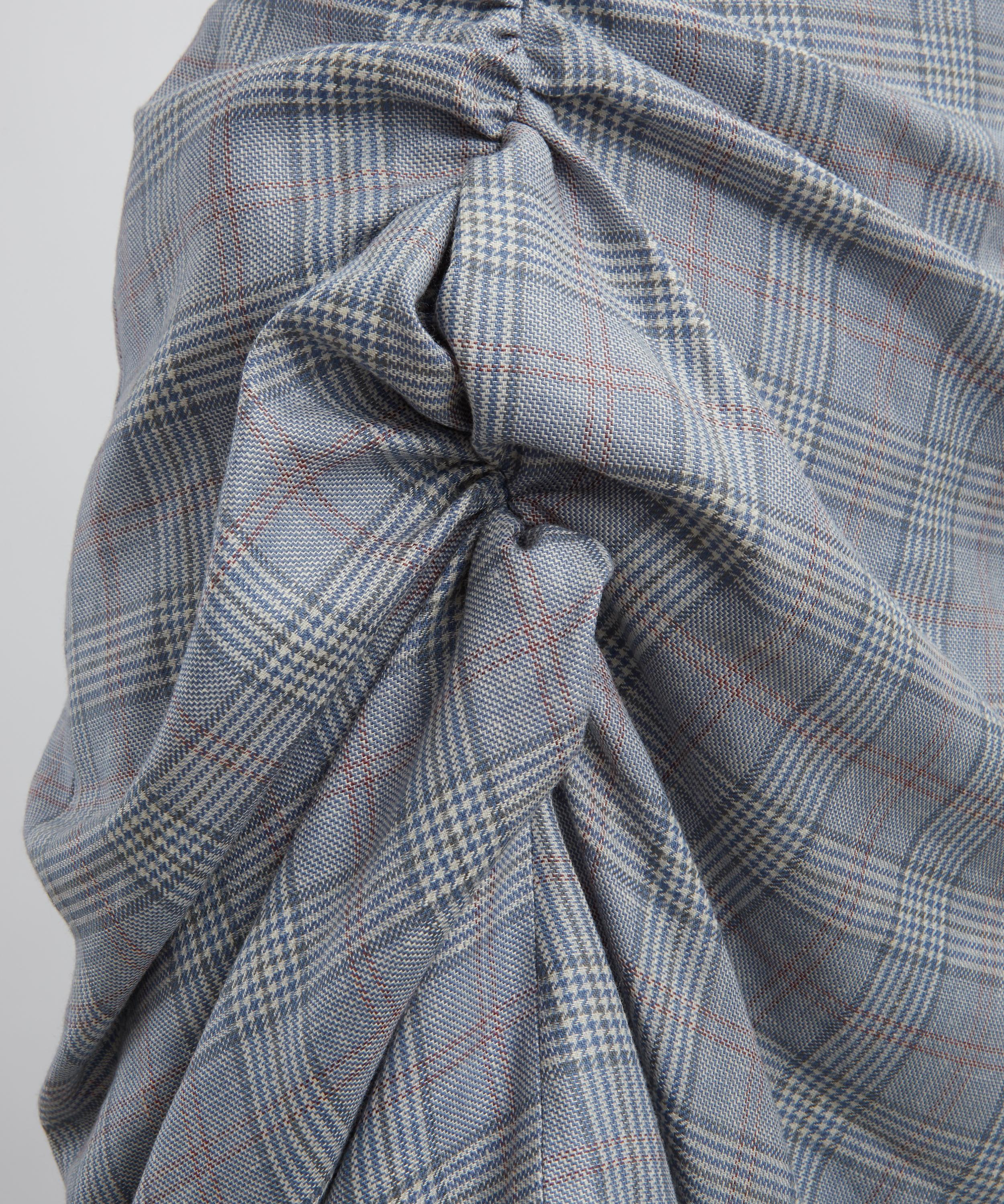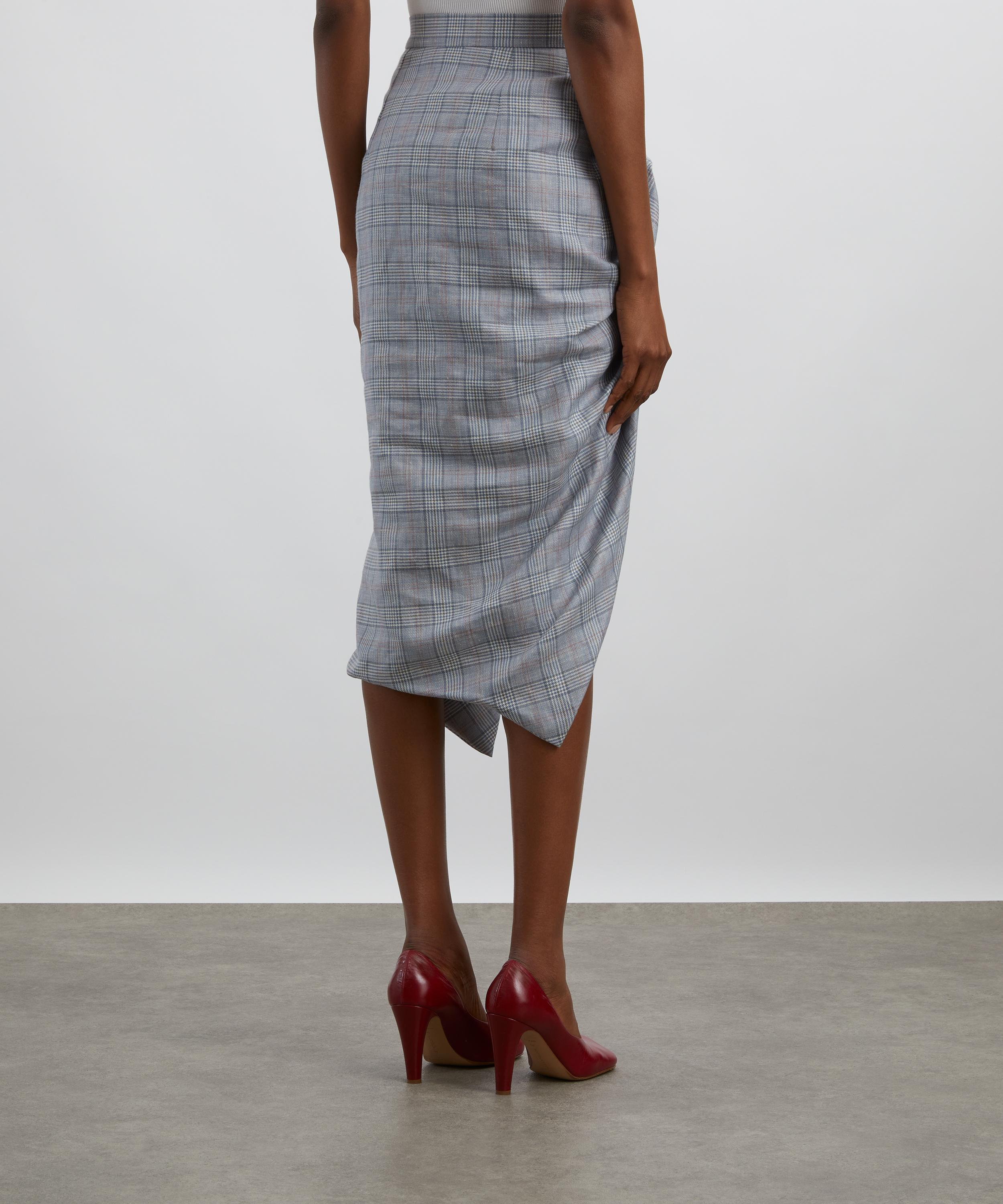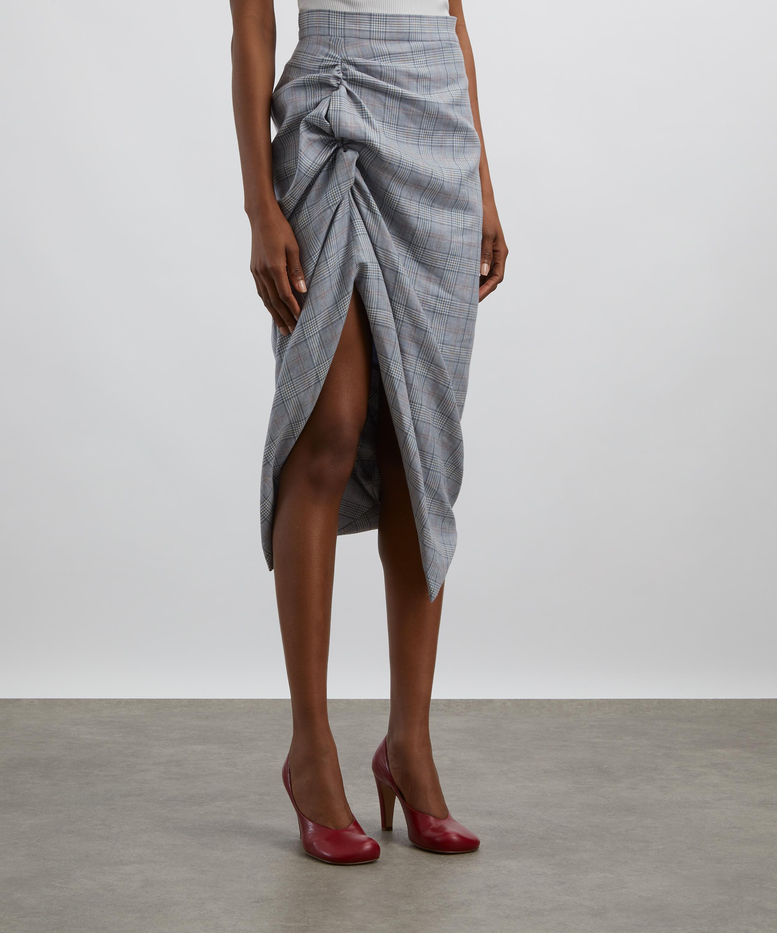 Adorned with the timeless Prince of Wales check motif, this skirt features an abstract, asymmetric pencil silhouette, highlighted by a gathered side split for a truly showstopping look.