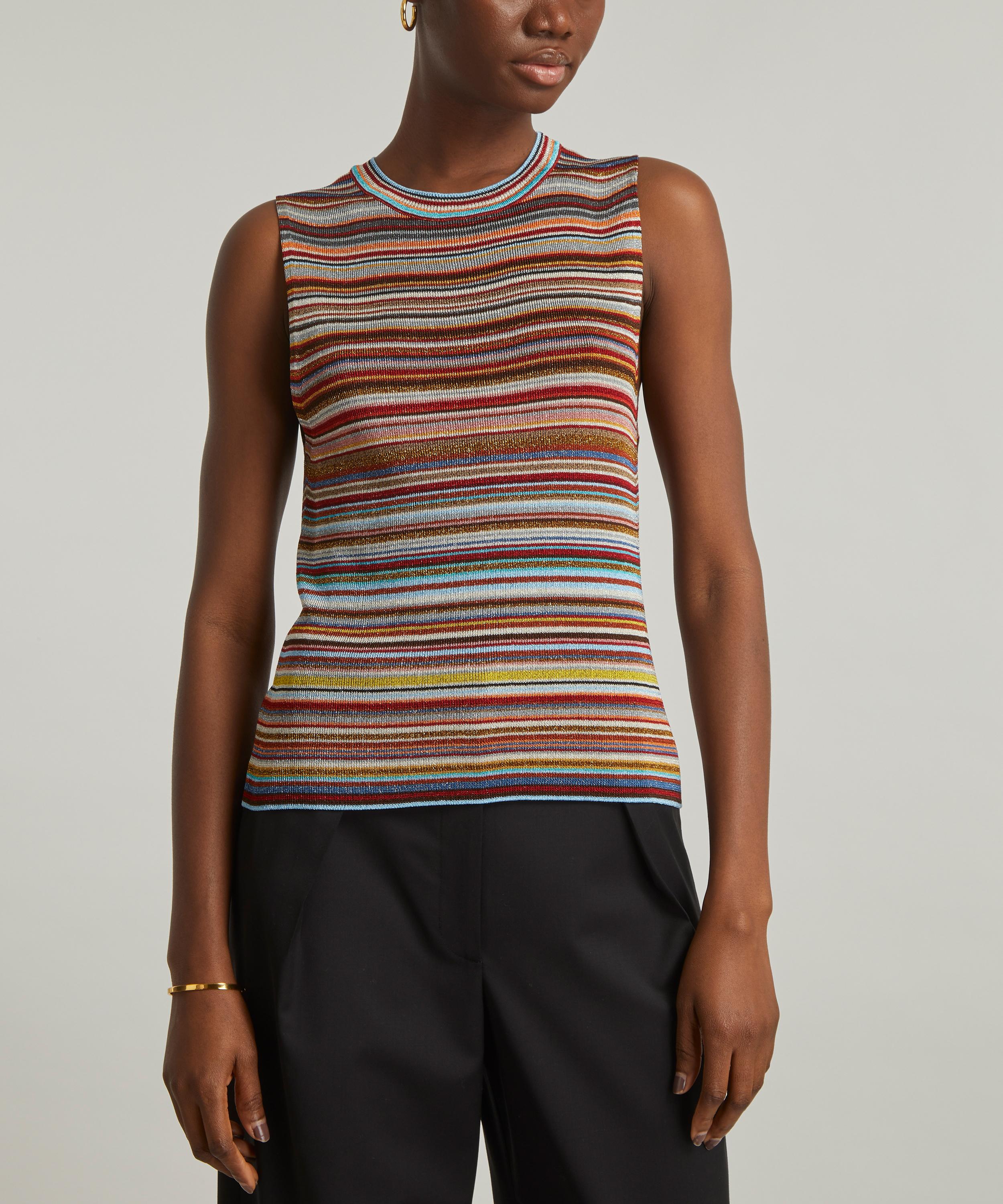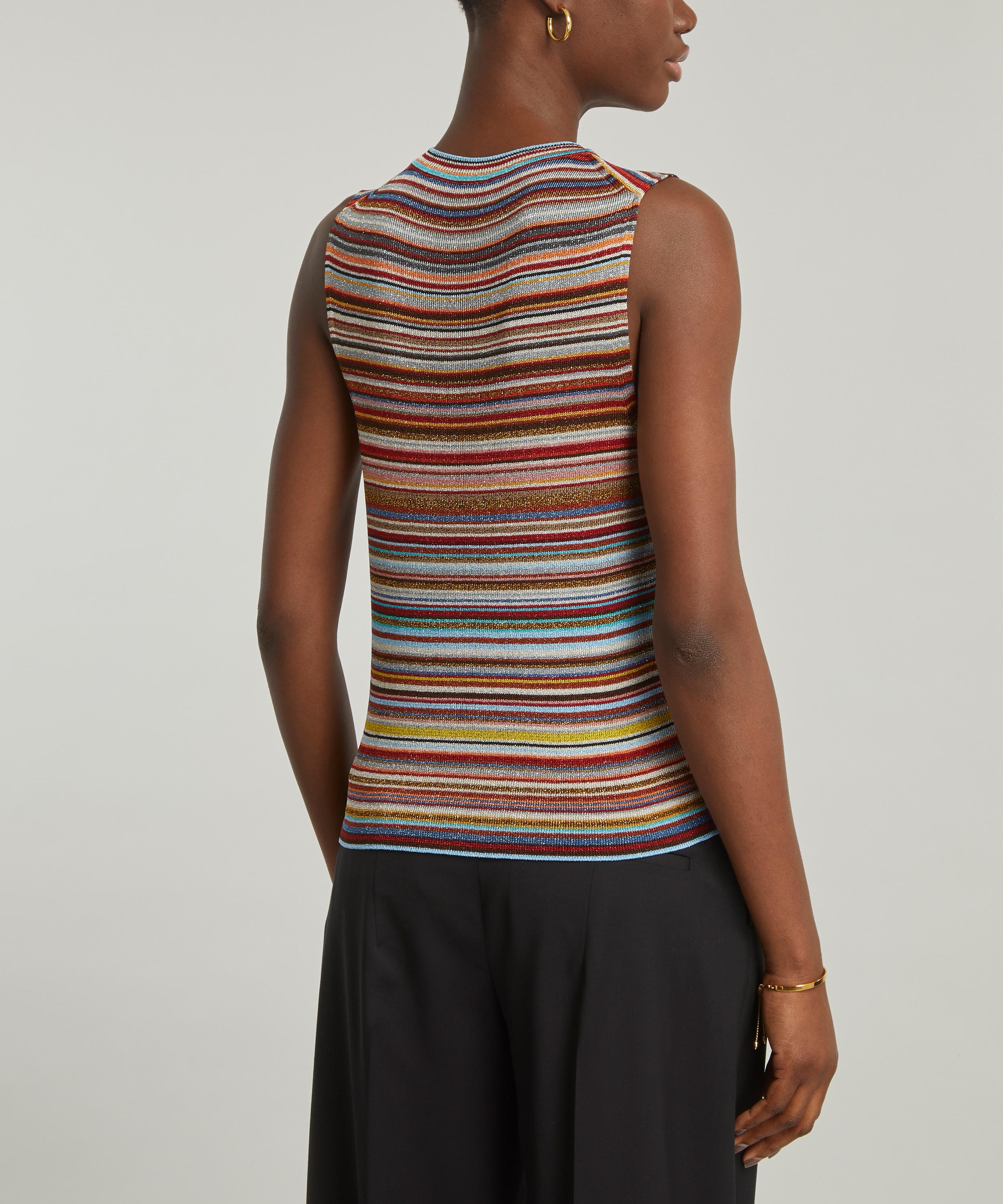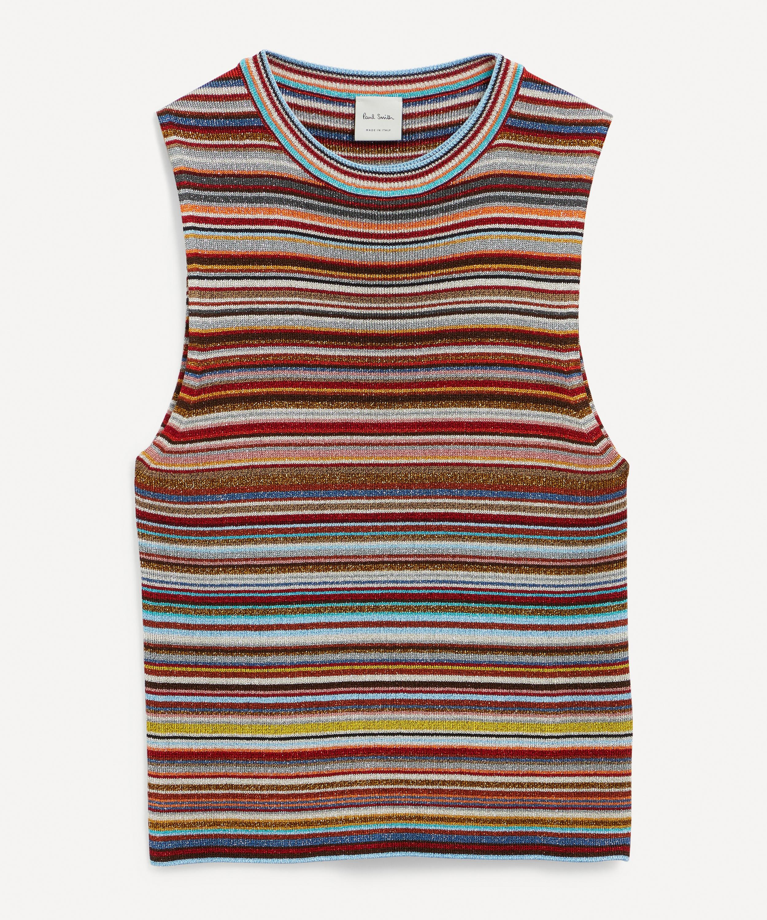 An irreverent update on a staple silhouette, this vest top has been expertly crafted in Italy and is complete with a bold, multicoloured stripe, detailed with a metallic texture throughout – perfect for bringing a touch of vibrancy and warmth to your work or weekend winter edit.