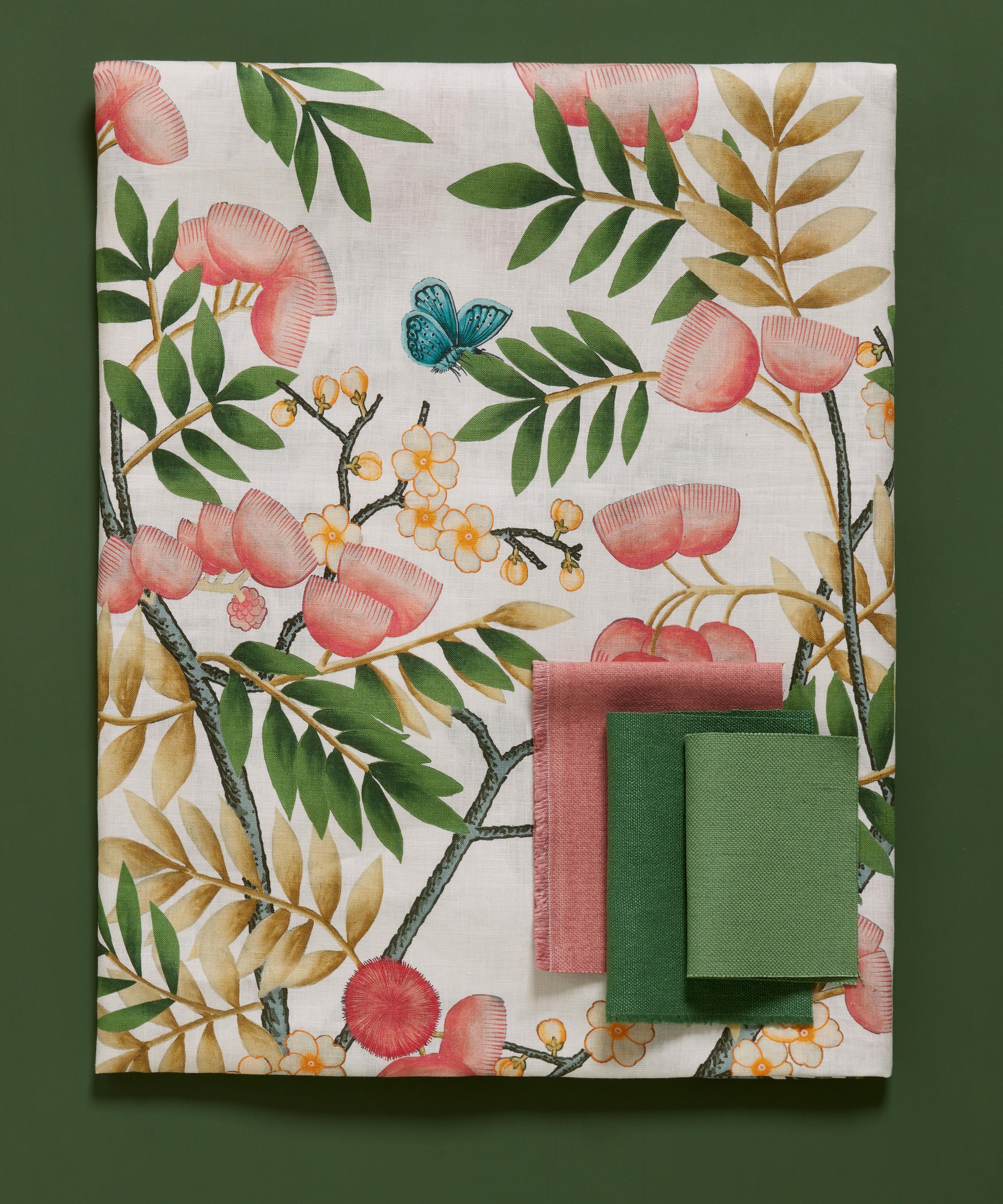 The Botanical Atlas fabric collection celebrates our historic lineage of craftsmanship and design through a cross-pollination of styles and visual narratives. Richly layered embroideries, opulent textured weaves, and contemporary printed velvets and linens are juxtaposed with a selection of elegant stripes and mesmerising geometrics - expertly crafted using traditional and cutting-edge techniques in Italy, Belgium, and India. Silk Tree is Liberty Fabrics’ refreshingly modern interpretation of a Chinoiserie design.