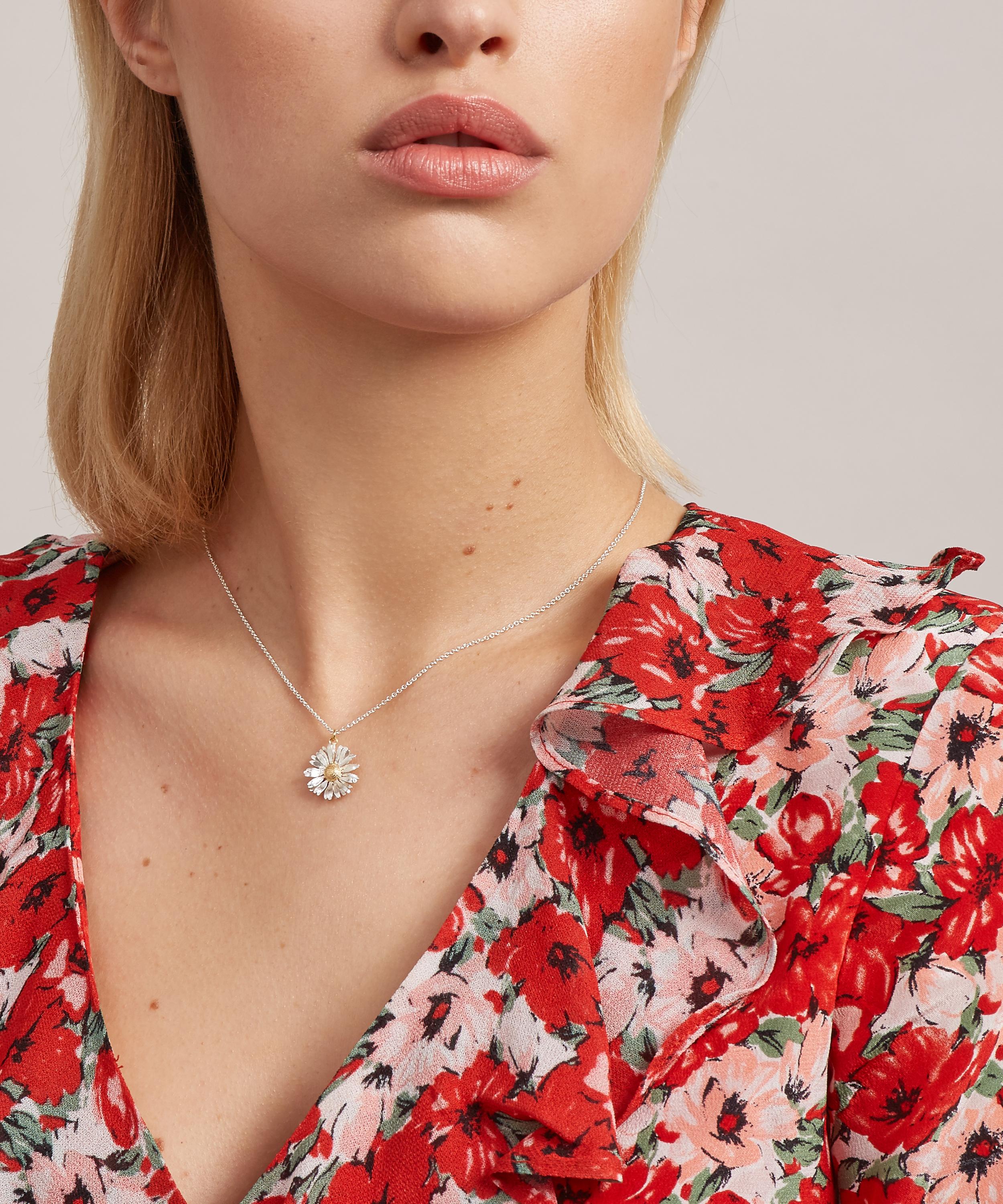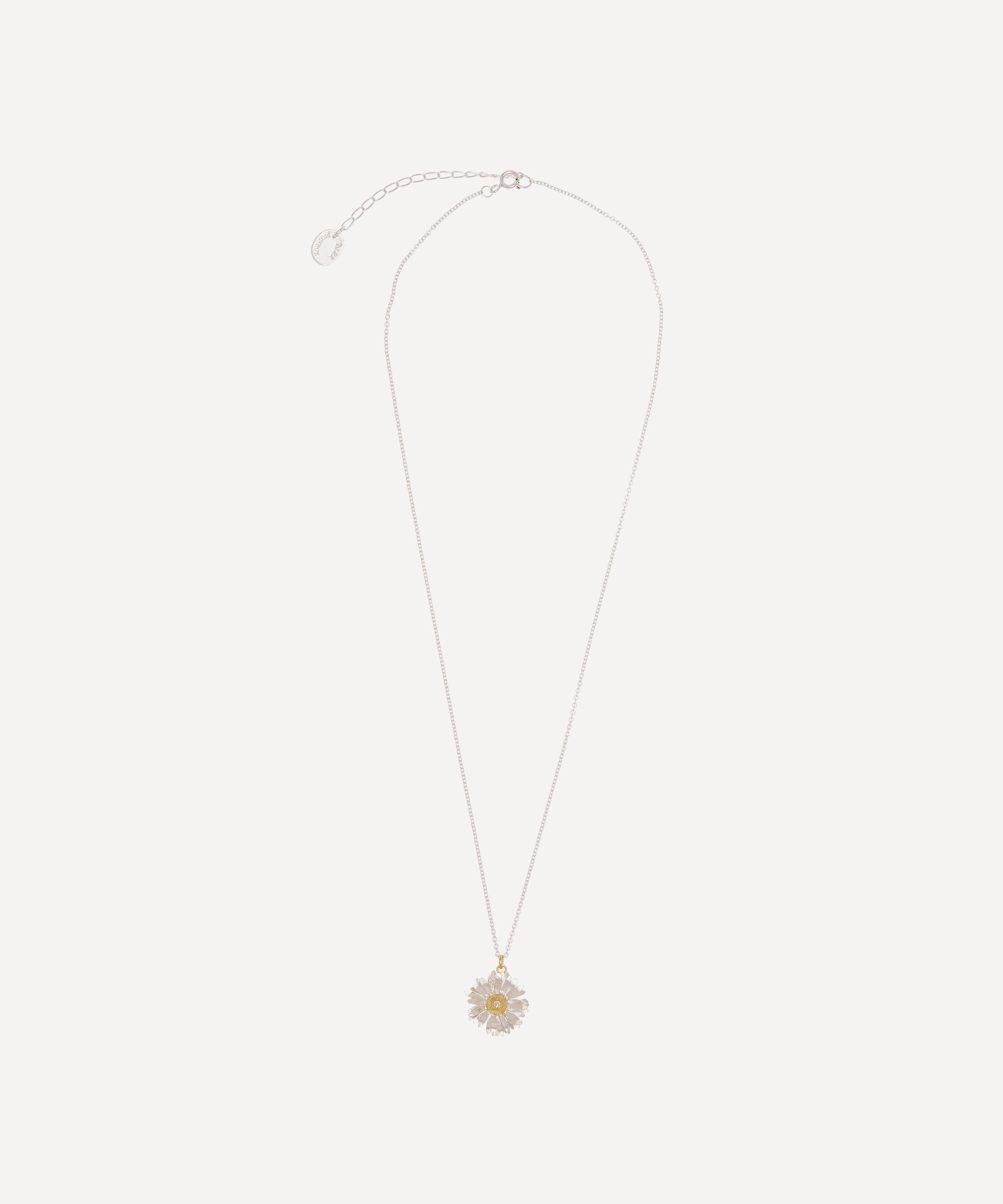 Handcrafted in the brand's London studio, this delicately sculpted pendant takes the form of a large daisy head with a cluster of overlapping sterling silver petals and a contrasting 22 carat gold-plated centre. Suspended from a fine silver trace chain, mix and match this piece with other natural motifs from the brand's collections for a wearable representation of the elegance and delicacy of the natural world.