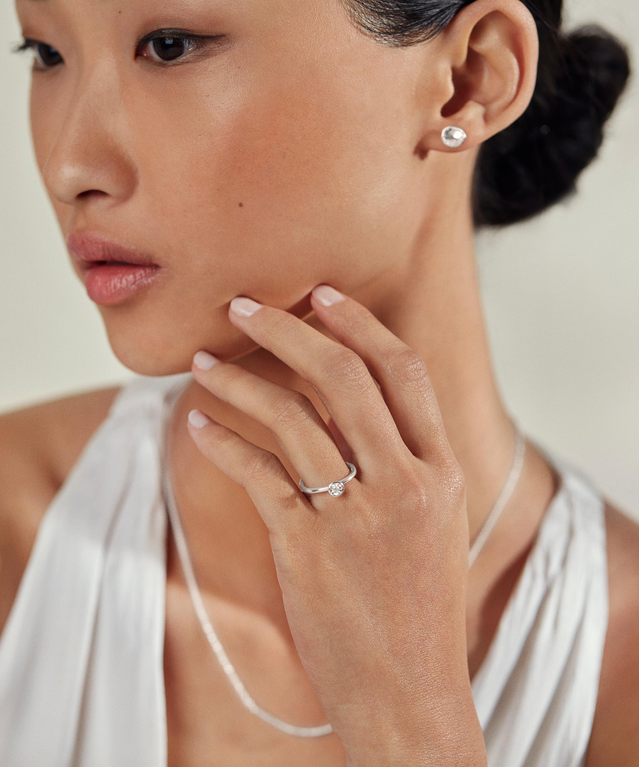 An elegant addition to your everyday line-up, this ring is adorned with a hand-cut white diamond solitaire for the slightest touch of sparkle. Complete with a thin band and a flawlessly polished finish, pair it with the Diamond Essential bracelet to maintain the minimal aesthetic, or style it with stacks of other bands for your own unique interpretation.
