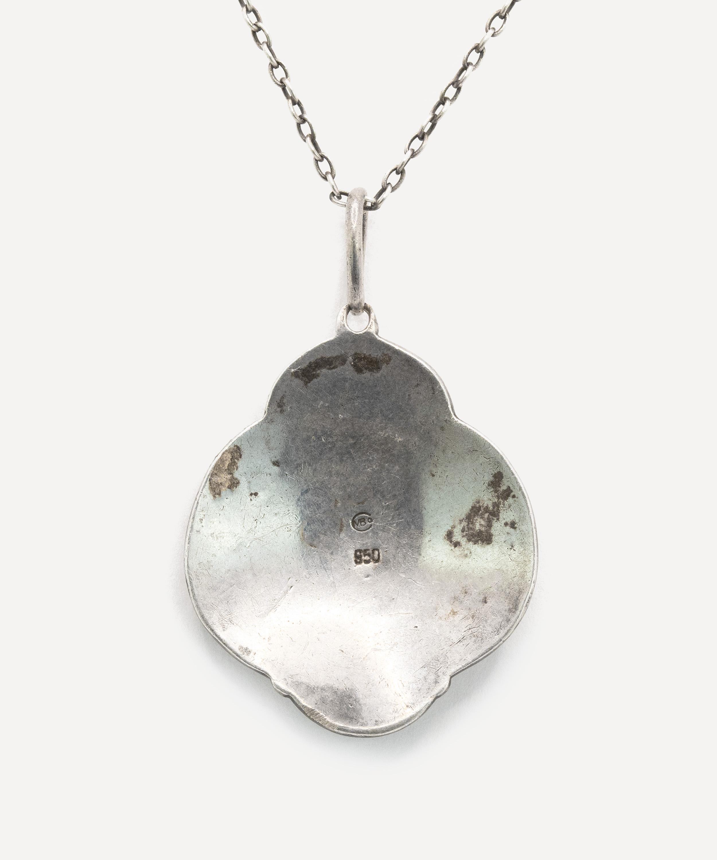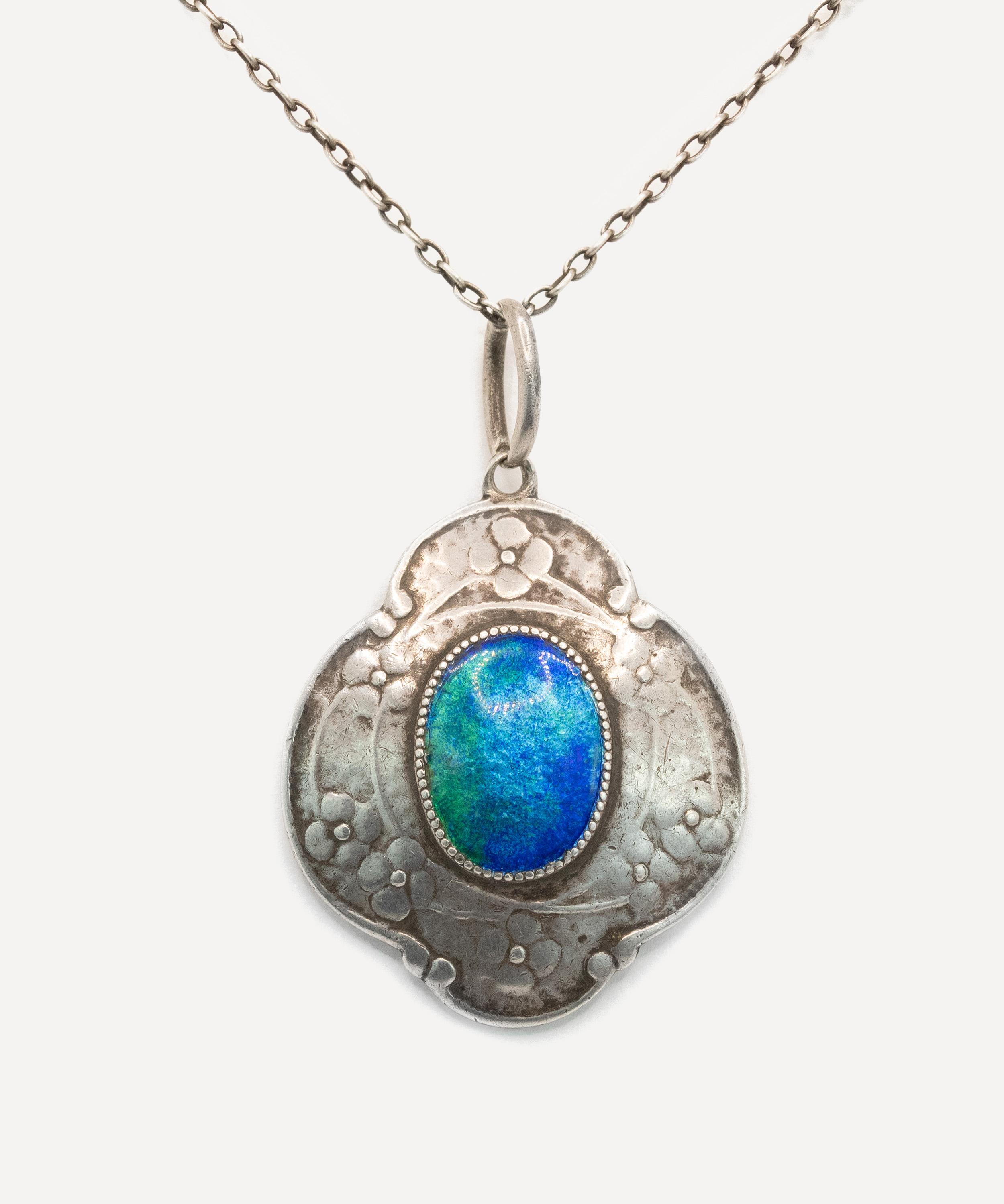 Meticulously crafted from silver, it features a shield-inspired design with a central blue enamel panel surrounded by hammered flower details. Whether worn as a statement of refinement or a whisper of antique charm, this pendant will steal the spotlight and elevate every ensemble with its undeniable presence – style it on a chain of your choice.