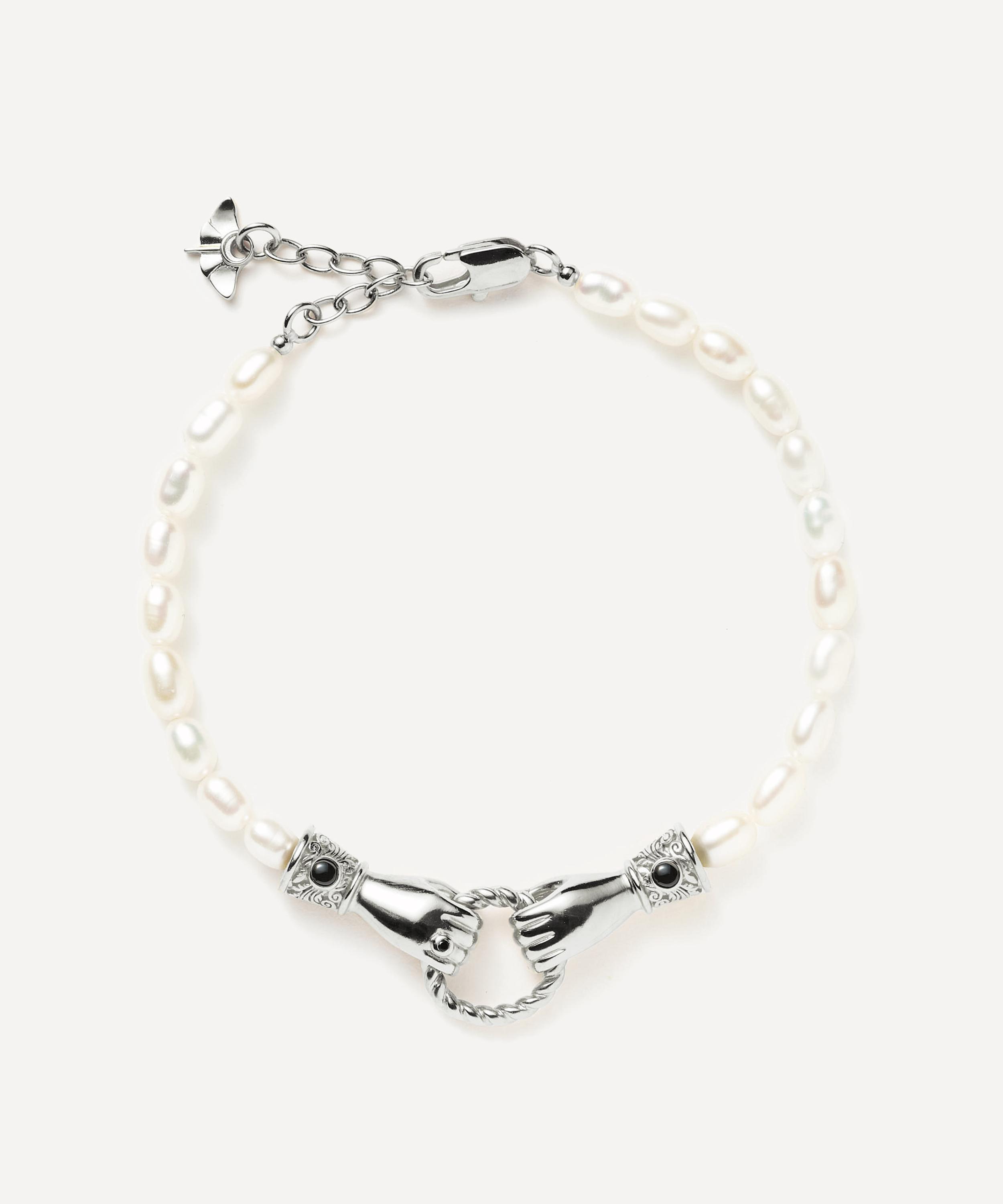 Embrace your individuality with the In Good Hands bracelet from the Harris Reed x Missoma collaboration collection. Crafted from silver-plated brass, it features an opulent string of white seed pearls, accented by two Georgian-inspired hands, each holding a twisted ring and detailed with a black onyx set cuff. Wear it alone or with other edgy bracelets for a curation that speaks to your unique sense of style.
