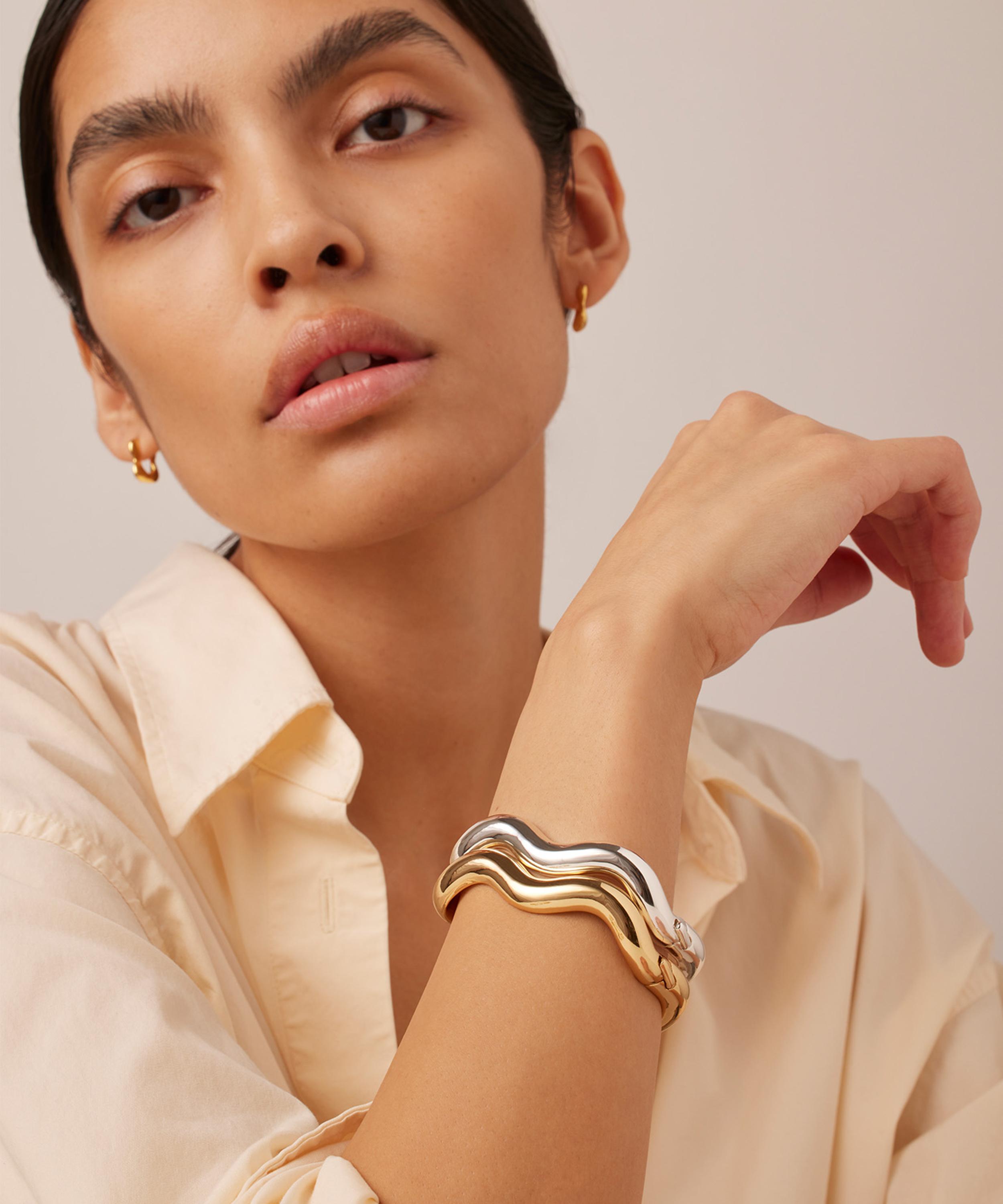 Crafted from platinum-plated steel with a high-polish finish, this bangle boasts a wavy silhouette echoing the designer’s sculptural vision. The design opens and closes with a hinge fastening, allowing effortless styling. Wear it solo for a minimal look, or stack with gold pieces for a contemporary two-tone effect.