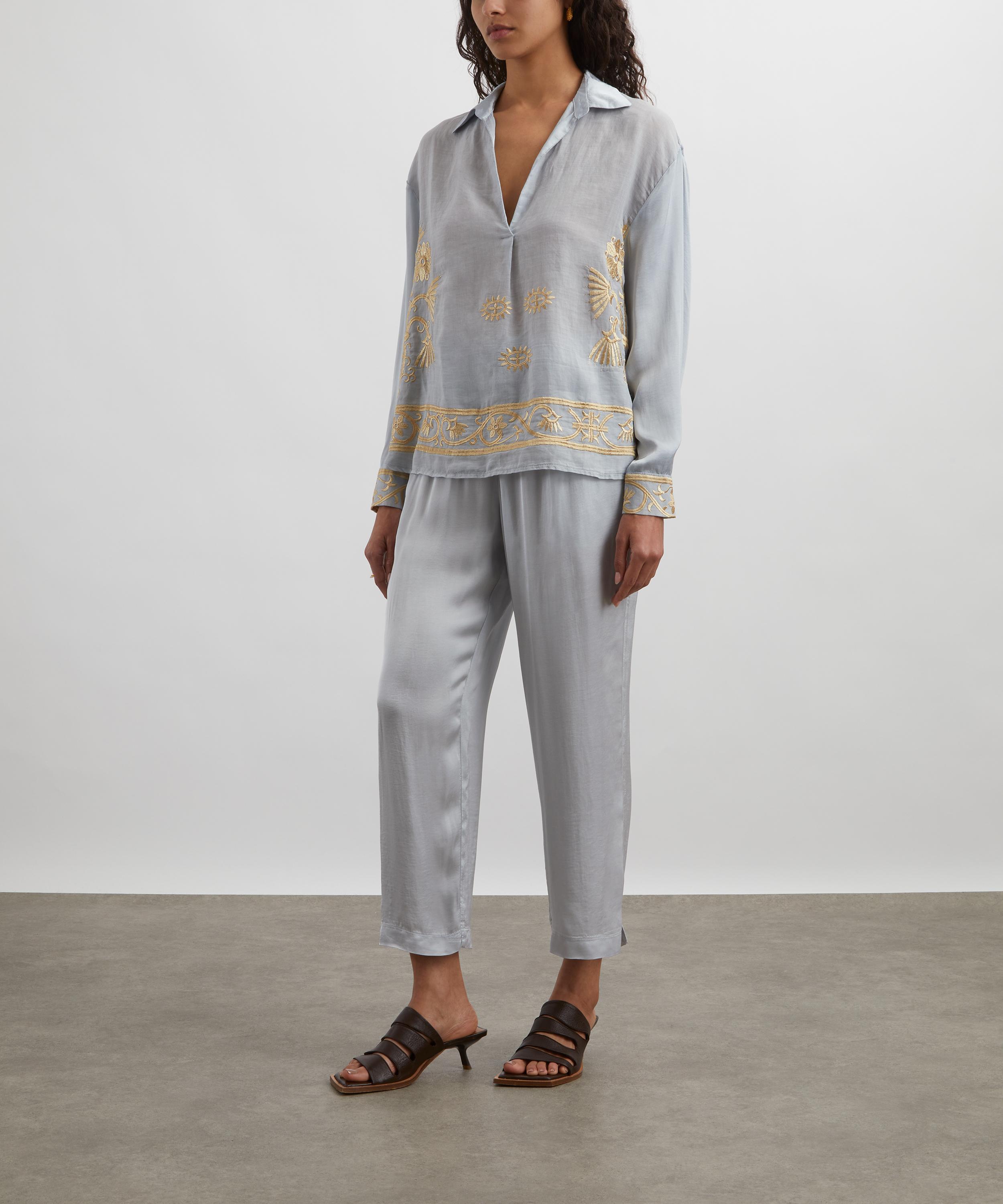 These Silver Silky Cropped Trousers by Athenian label Greek Archaic Kori infuse your new-season wardrobe with the sun-drenched elegance of the Mediterranean.