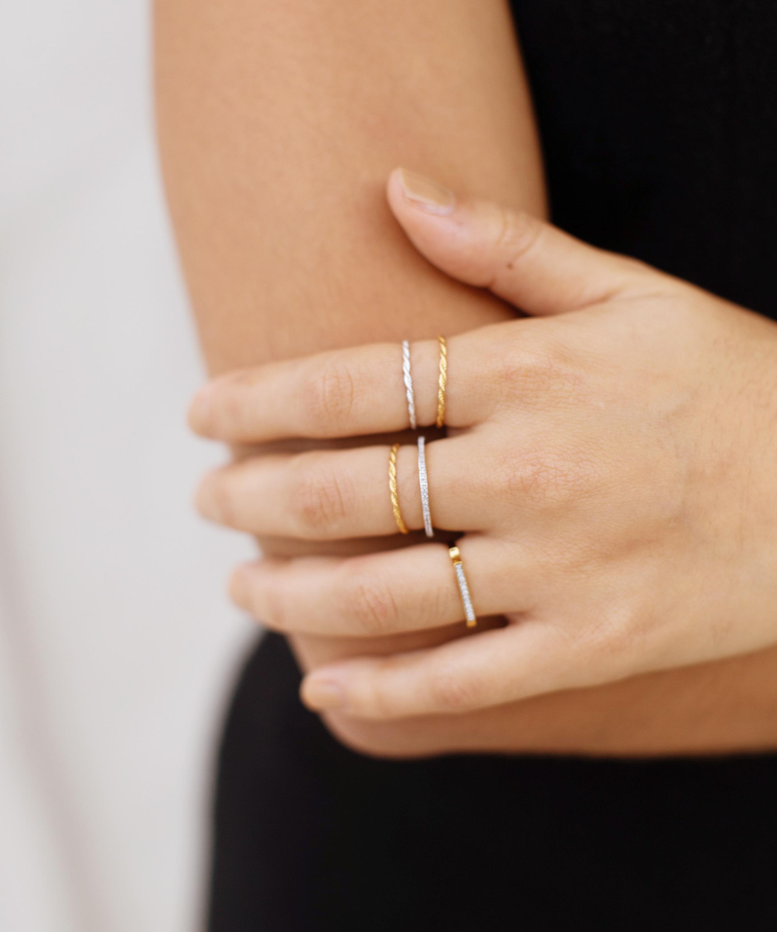 An essential minimalist style, this ring is an effortlessly elegant piece and the perfect token of affection for a partner, family member or close friend. A delicate array of glittering micro pavé diamonds embellishes the ultra-slim design - style it solo for statement appeal or incorporate it into your everyday curation for a custom contemporary look.