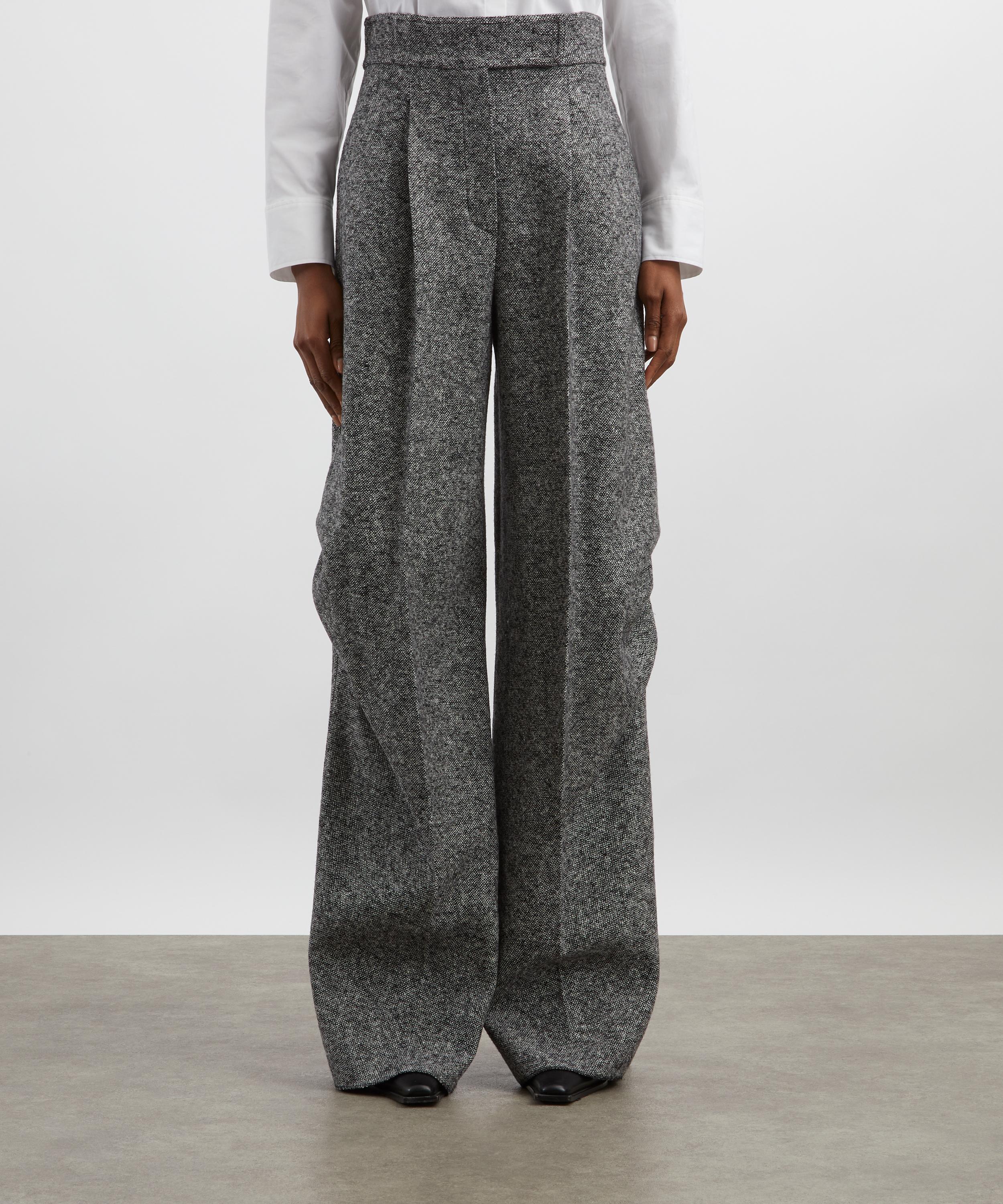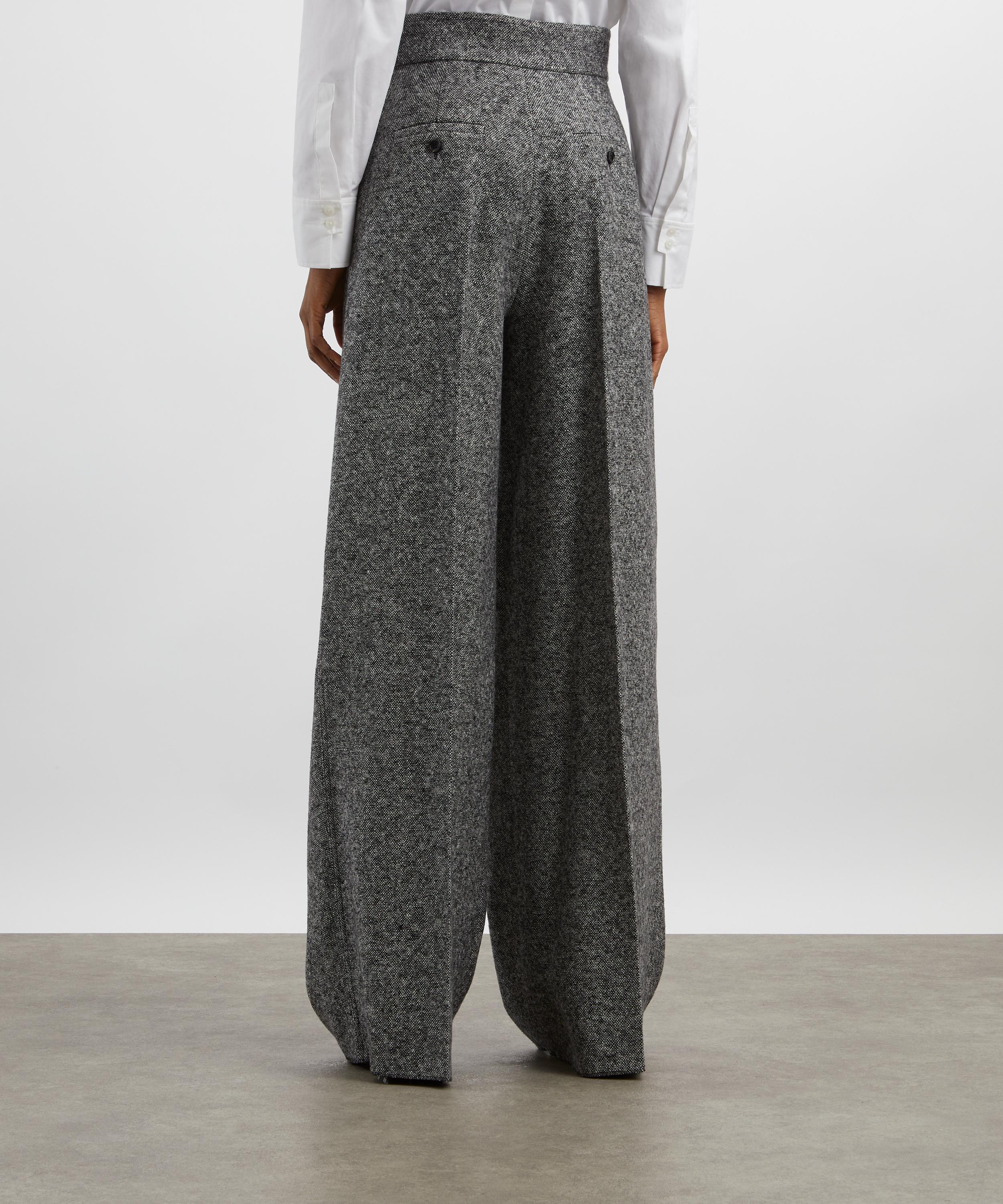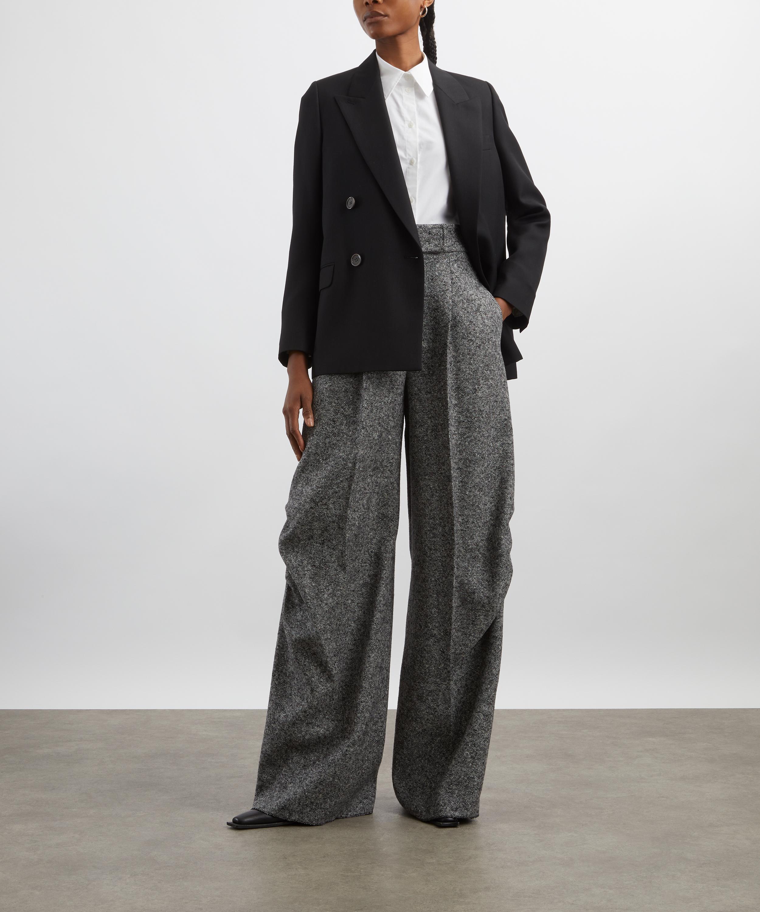 Crafted from a wool and silk blend tweed, these high-waisted trousers feature a wide-leg silhouette with single pleats, a centre-front crease, and a wide waistband for a refined, tailored finish.