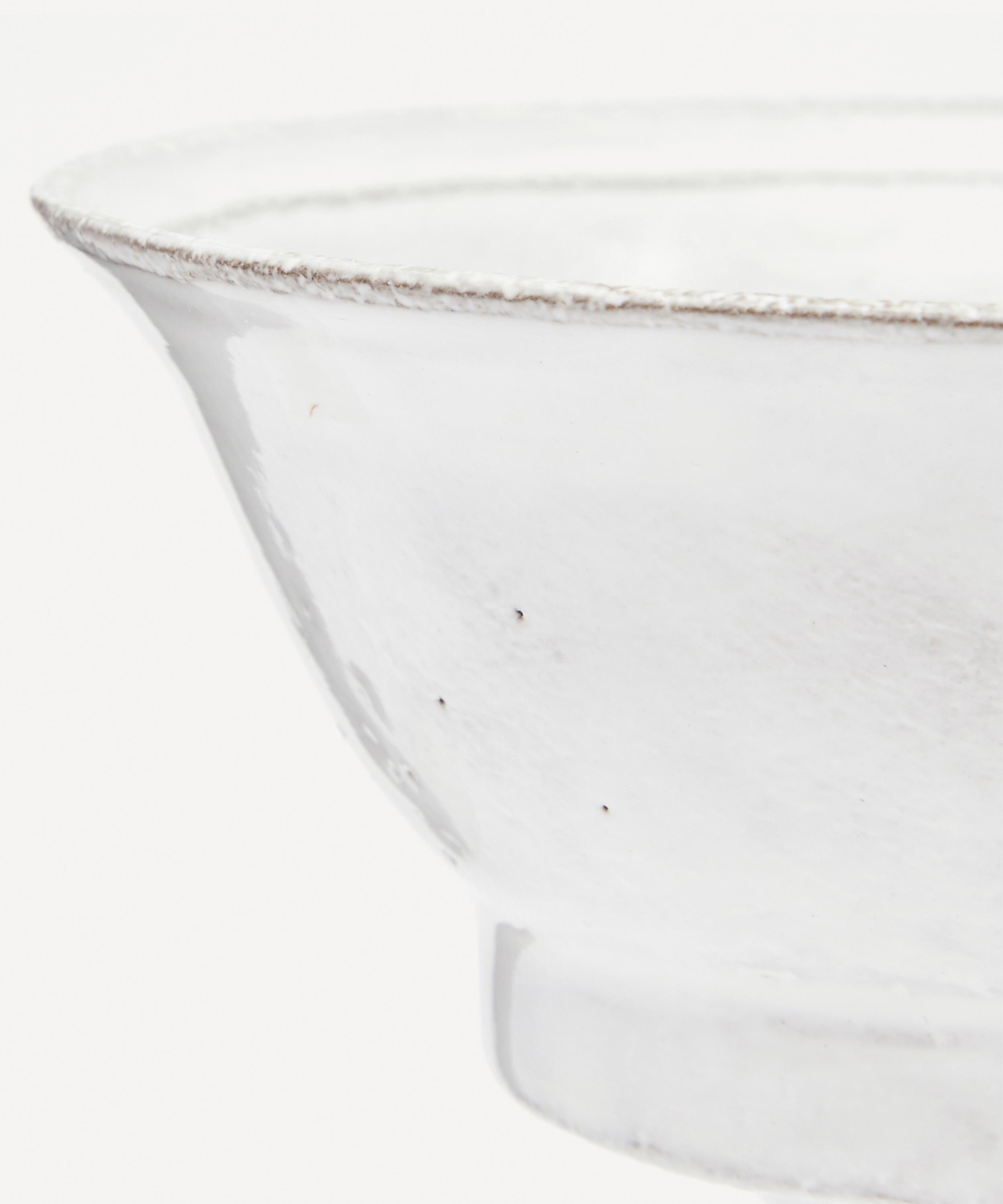 Votary of pre-industrial fabrication, Astier de Villatte is celebrated for being the one and only studio in Paris to hold and harbour the traditions of artisanal ceramic production. Restoring the ancestral systems of moulding and stamping, the standing bowl is made using handcrafting techniques from the Middle Ages which involve moulding a handmade sheet of clay, double firing the ‘biscuit’ piece and glazing the product in white enamel – a lengthy process that requires a drying time of up to one month. The organic piece is engraved with the brand’s signature crest - depicting an interlacing A & V - alongside the initials of one of the 40 master artisans who created the glazed bowl. Each handmade piece tells a beautiful story, it romances and imparts a sense of nostalgia into its owner. Arrange with other serveware in the collection to breathe an air of authenticity into your table setting.