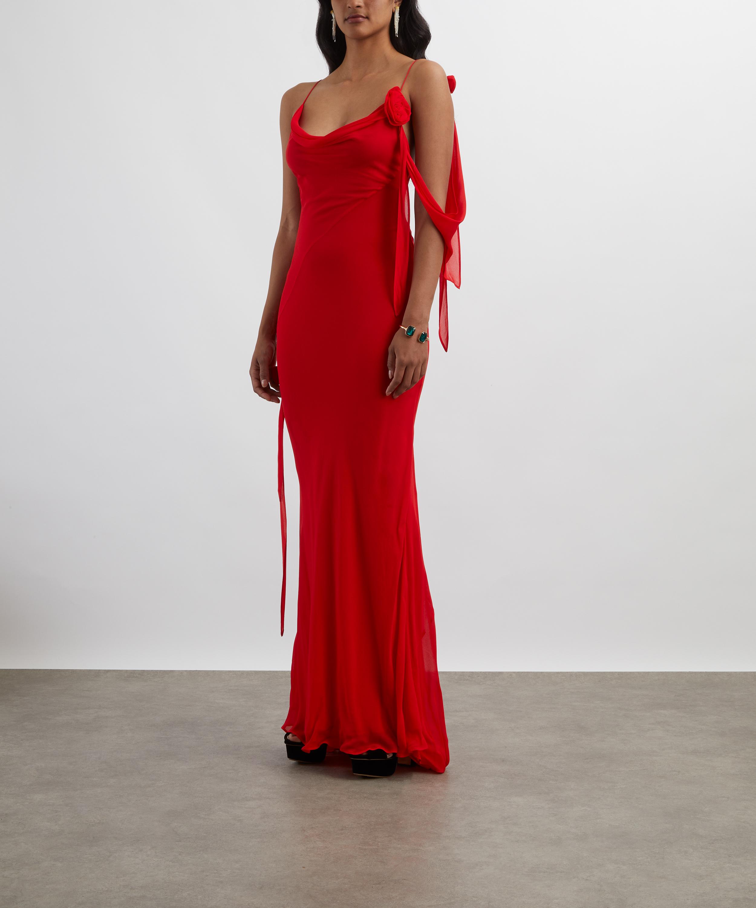 Crafted from fluid viscose georgette, this striking red maxi dress exudes sophistication with its figure-skimming sheath silhouette and draped cowl neckline, finished with a delicate flower corsage for a charming touch.