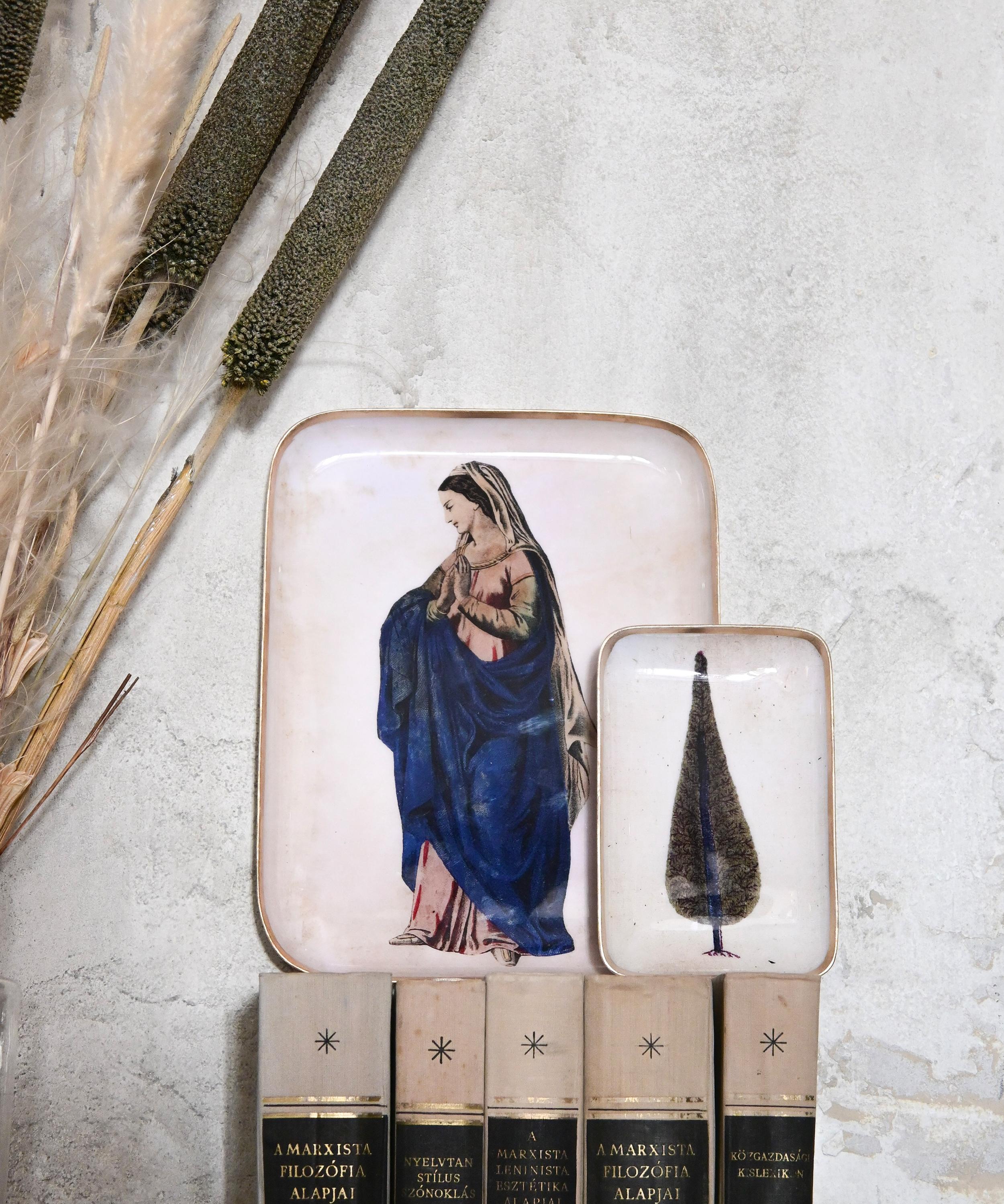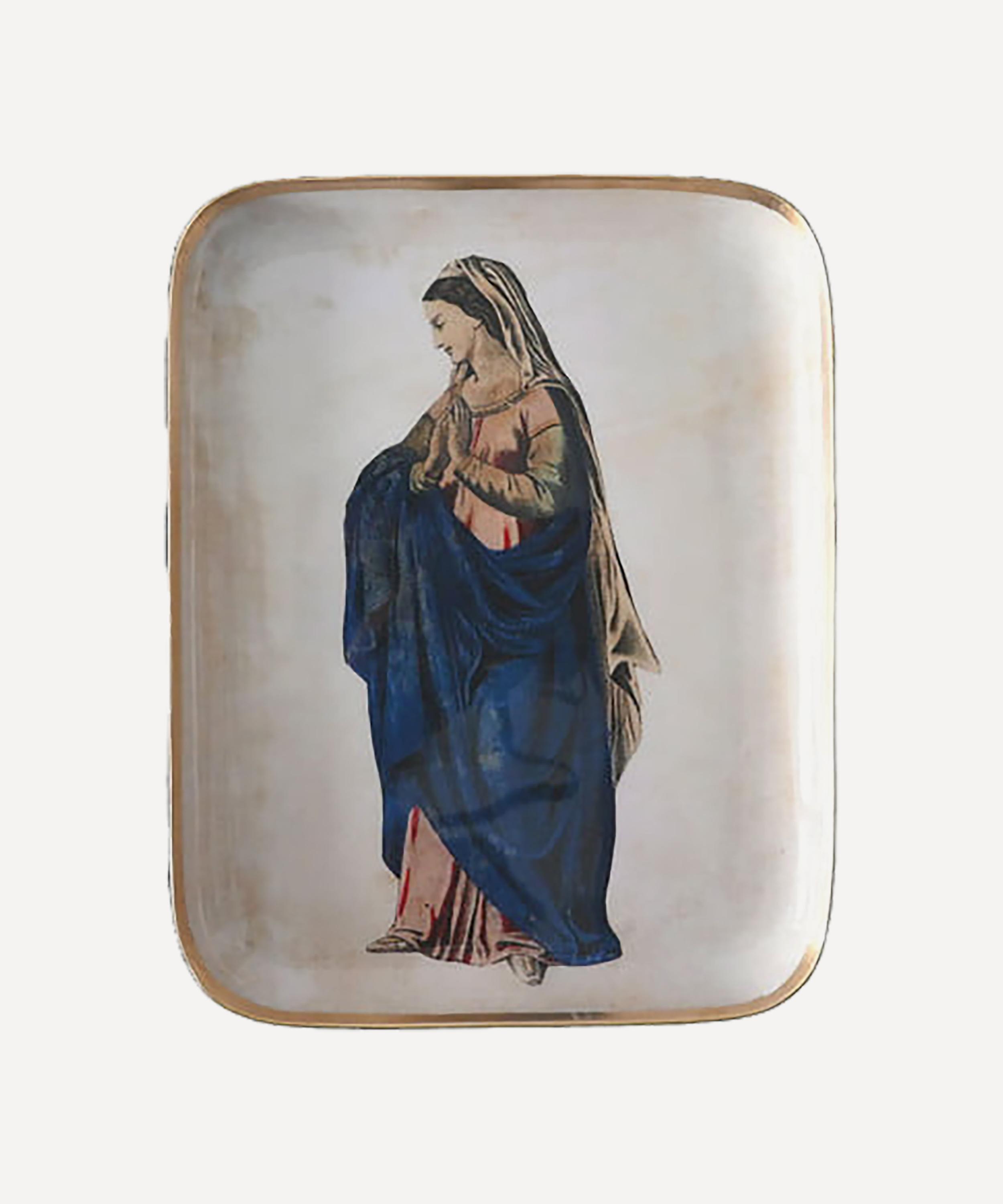 Meticulously crafted from durable enamelled aluminium, this tray features a delicate religious inspired design. Delicately finished with a hand-gilded edge, pile trinkets on this handy tray or arrange on your desk for the perfect eclectic accent to your workspace.