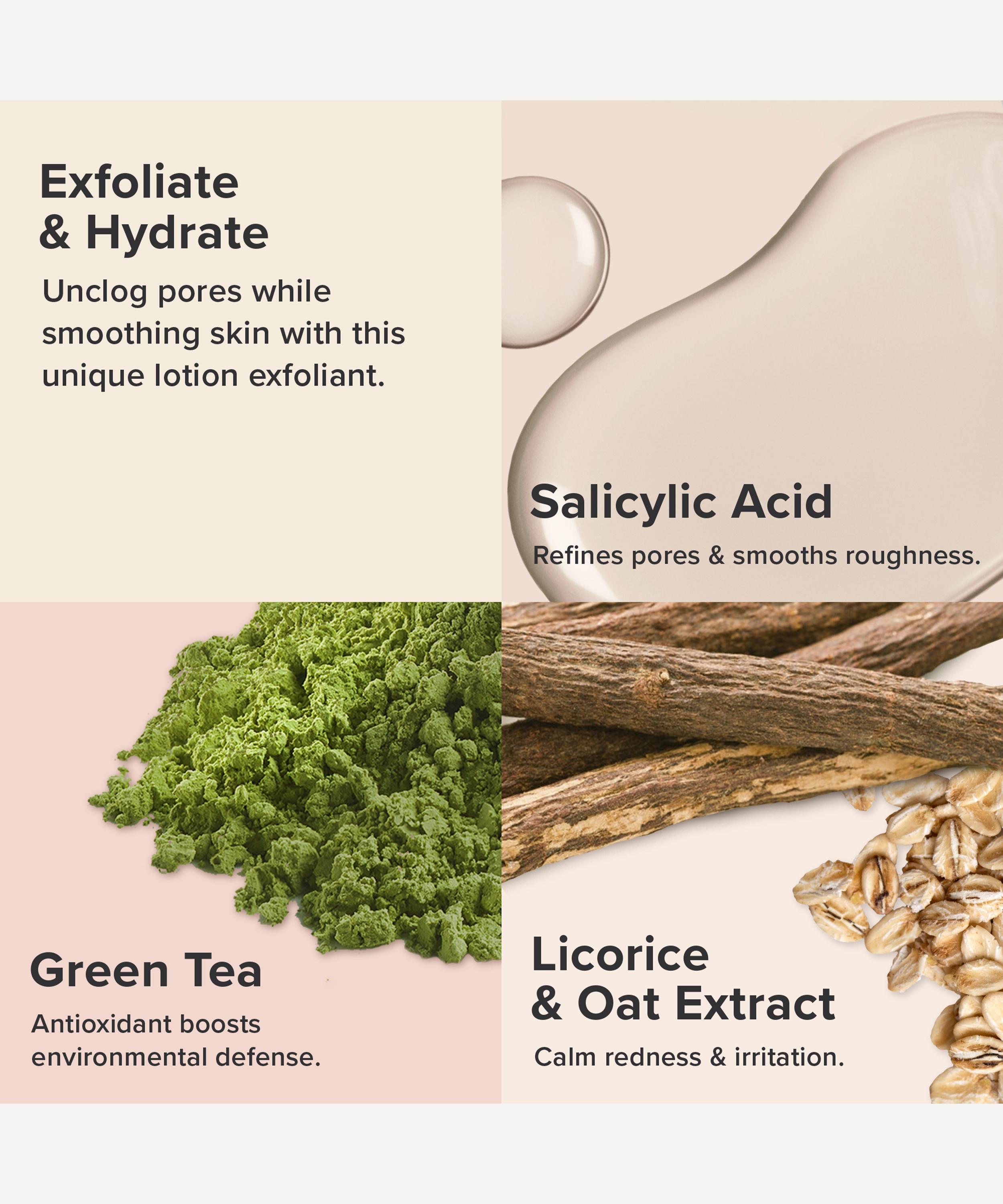 Infused with 2% salicylic acid, this moisturising leave-on treatment gently removes built-up dead skin cells, revealing a smooth and radiant complexion. Blended with soothing plant oils and antioxidants, this multi-action lotion is a dream for all skin types, unveiling a clear, natural, healthy-looking glow.