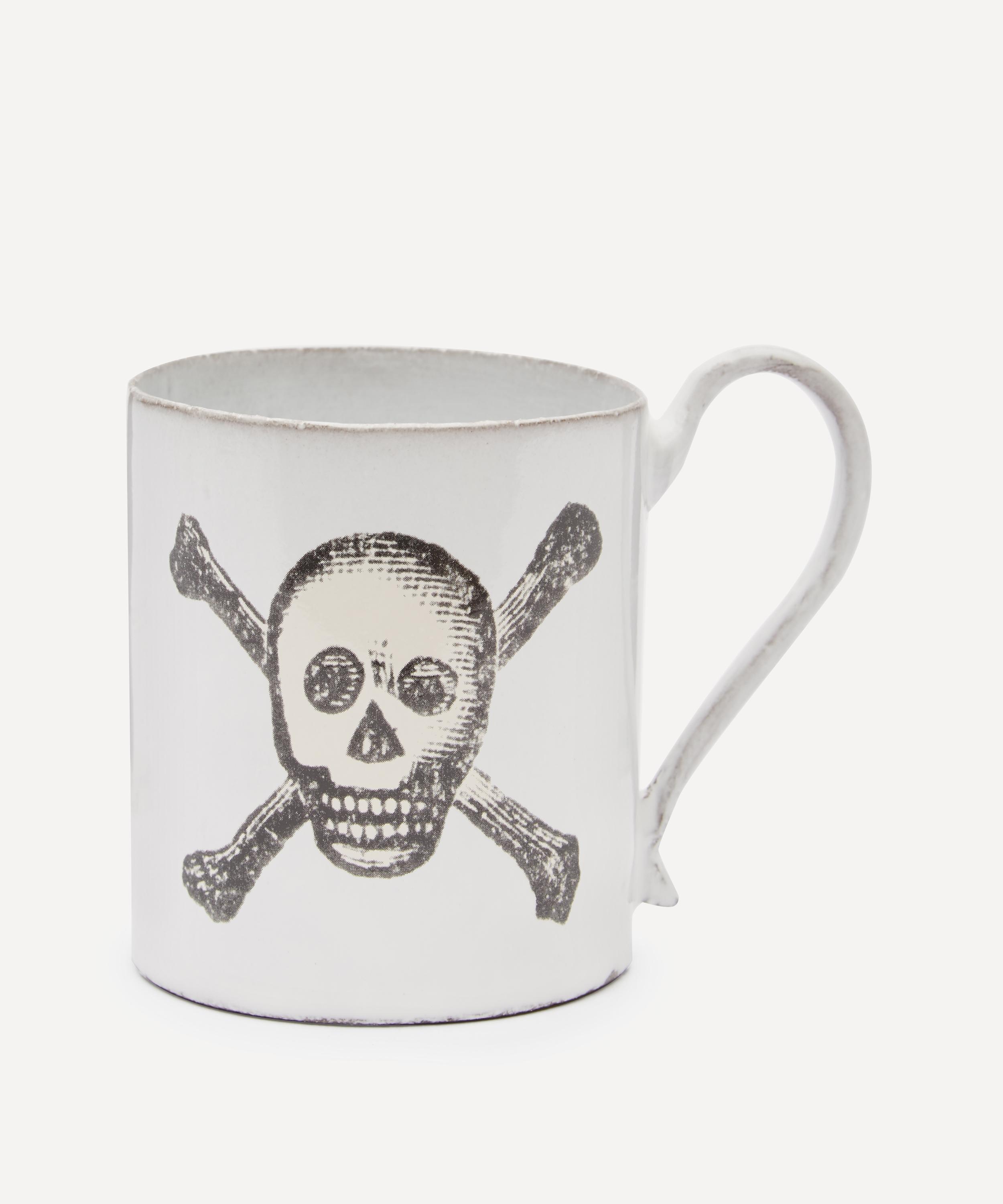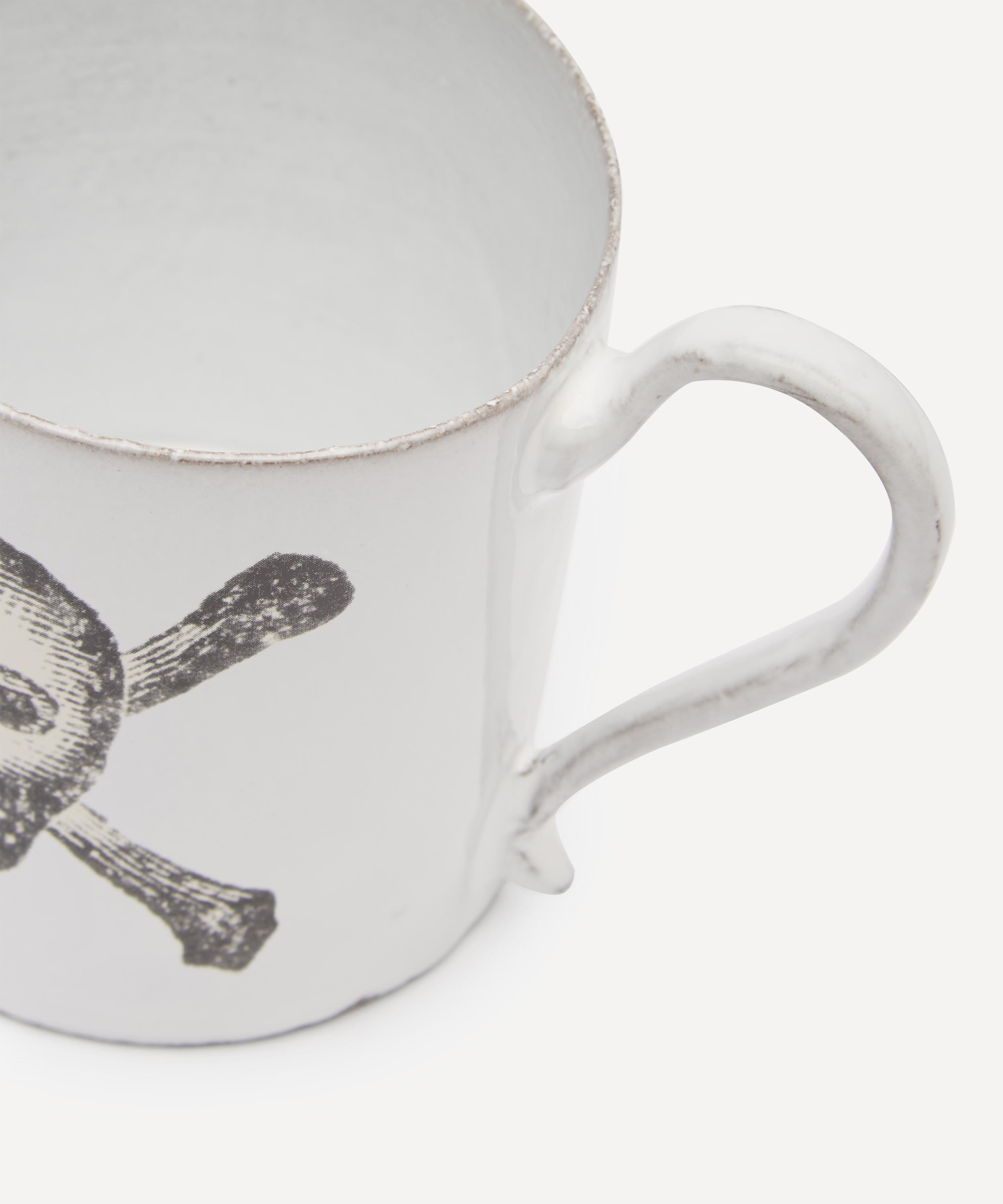 Votary of pre-industrial fabrication, Astier de Villatte is celebrated for being the one and only studio in Paris to hold and harbour the traditions of artisanal ceramic production. Restoring the ancestral systems of moulding and stamping, the skull and crossbones mug is made using handcrafting techniques from the Middle Ages which involve moulding a handmade sheet of clay, double firing the ‘biscuit’ piece and glazing the product in white enamel – a lengthy process that involves a drying time of up to one month. Characterised by John Derian's skull and bones découpage, the ceramic mug is engraved with the brand’s signature crest - depicting an interlacing A & V - alongside the initials of one of the 40 master artisans who created it. Each handmade piece tells a beautiful story, it romances and imparts a sense of nostalgia into its owner. Arrange with other characterful mugs in the collection to breathe an air of authenticity into your dining collection.