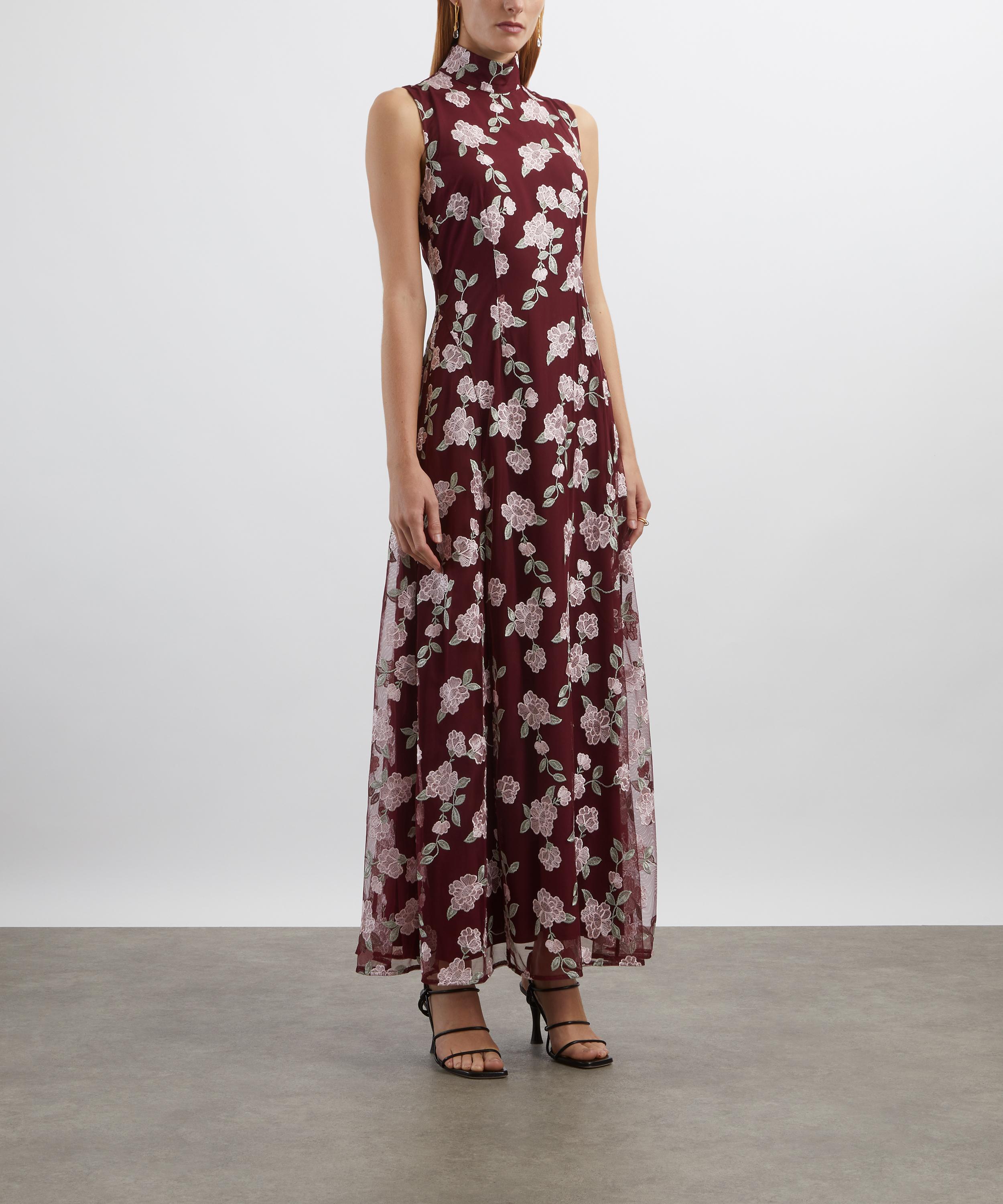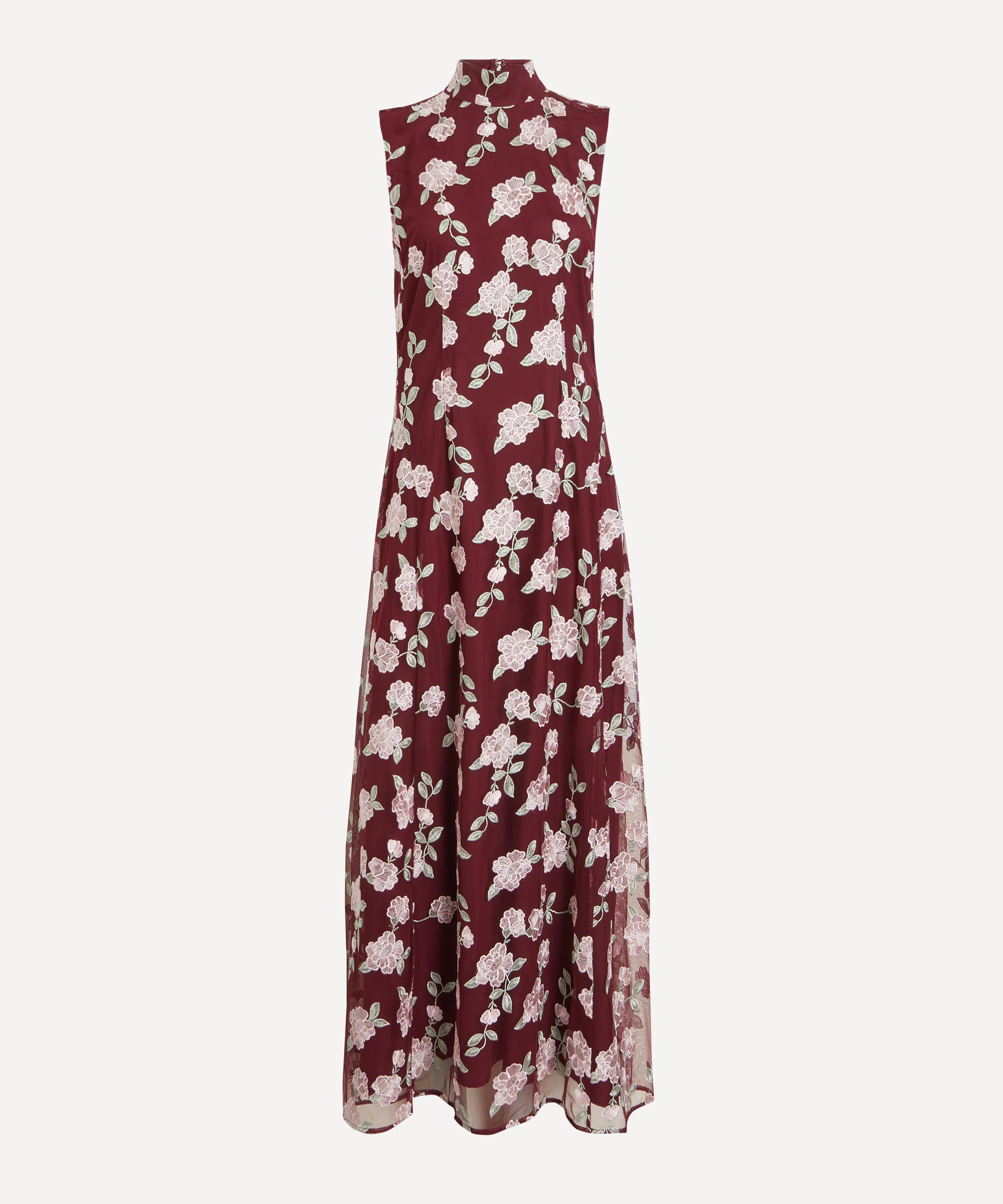 Adorned with tactile floral embroidery, this sleeveless maxi dress exudes timeless elegance with its high neckline, form-fitting bodice, and flowing A-line skirt that falls gracefully to the ankle.