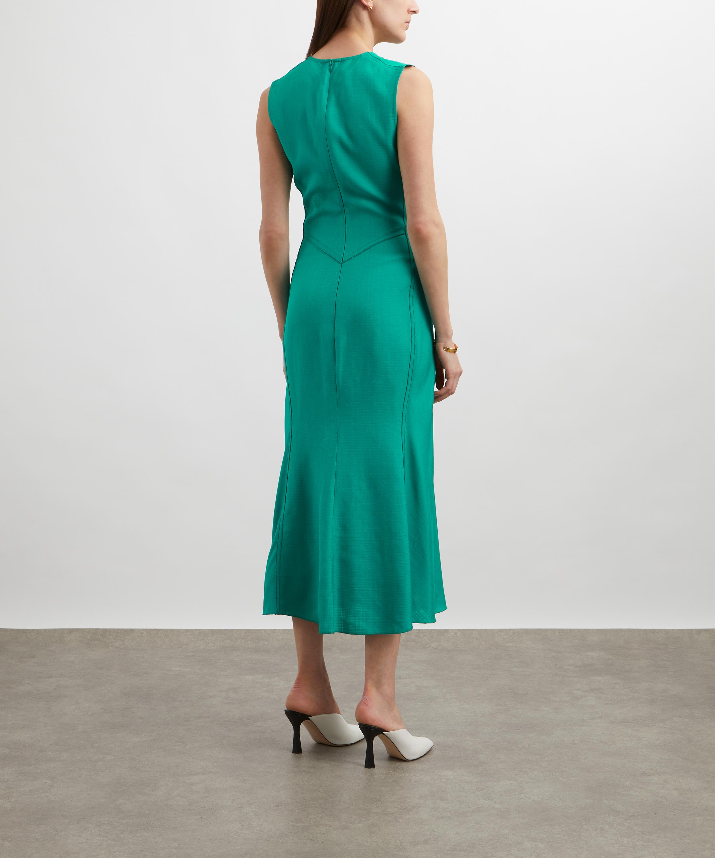 Presented in a vibrant shade of peacock, this sleeveless dress features a waist-defining silhouette with flattering pleat detailing at the centre. Falling to a flowy A-line skirt, its V-neckline adds a refined touch, making it a perfect balance of elegance and modernity.