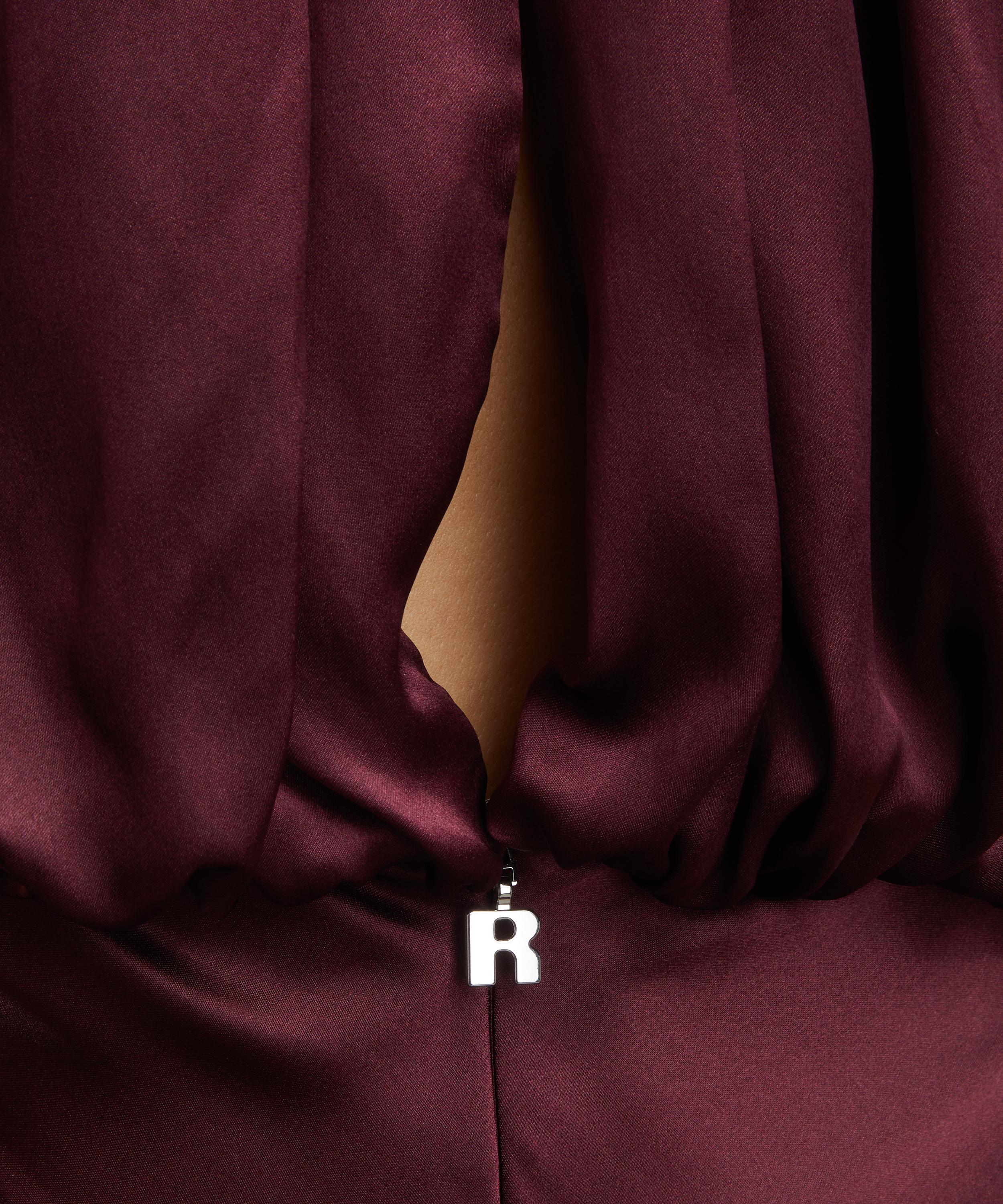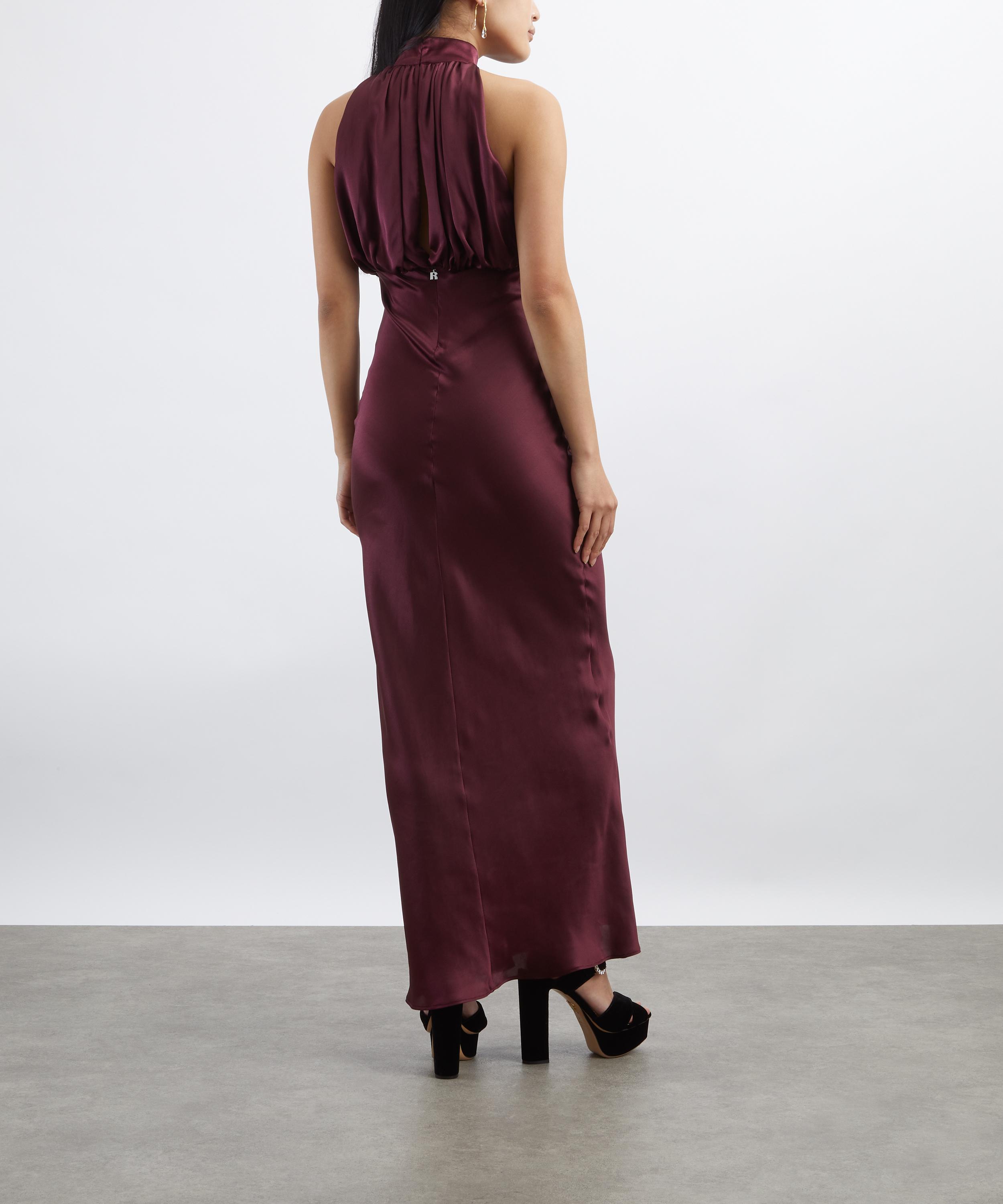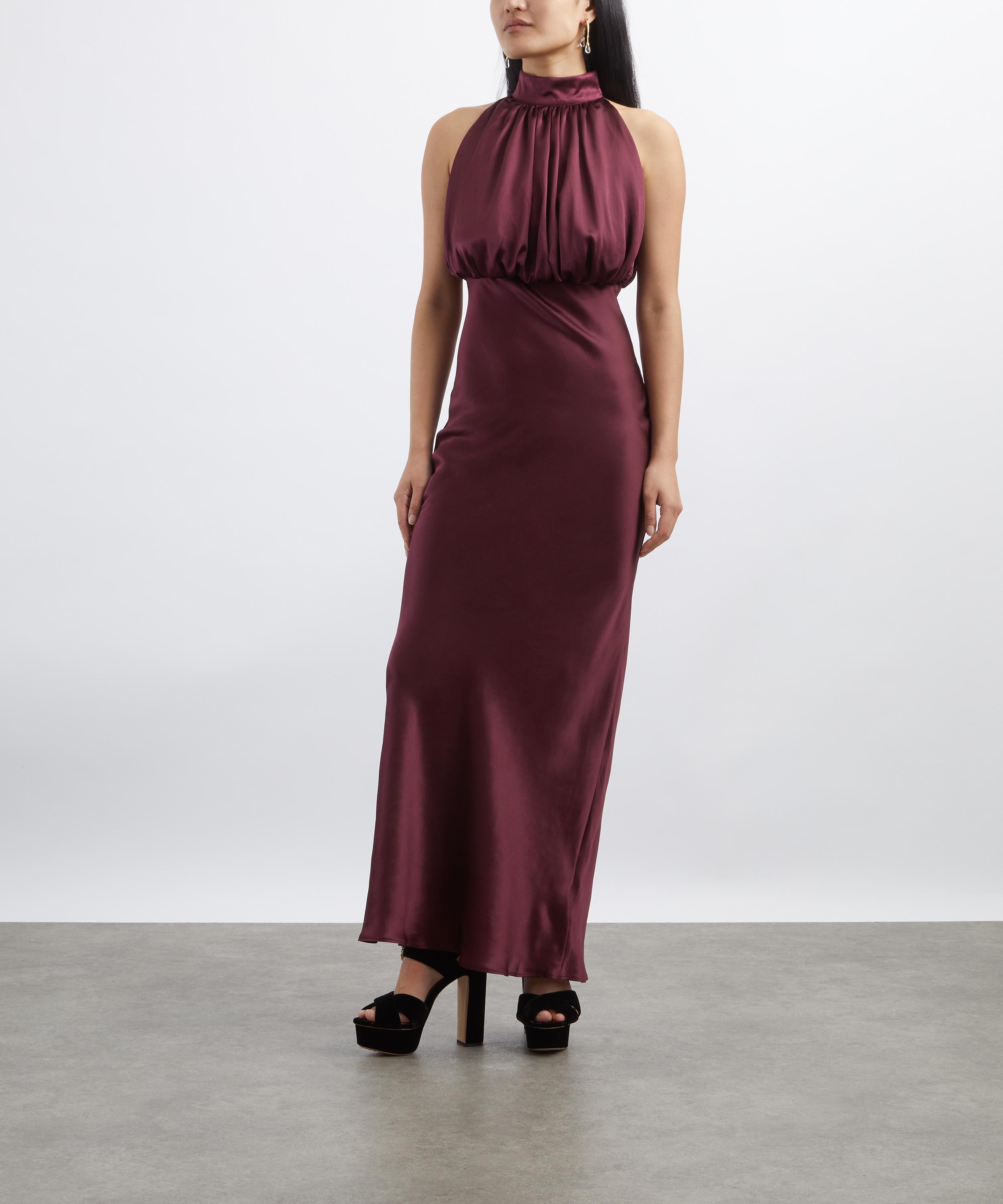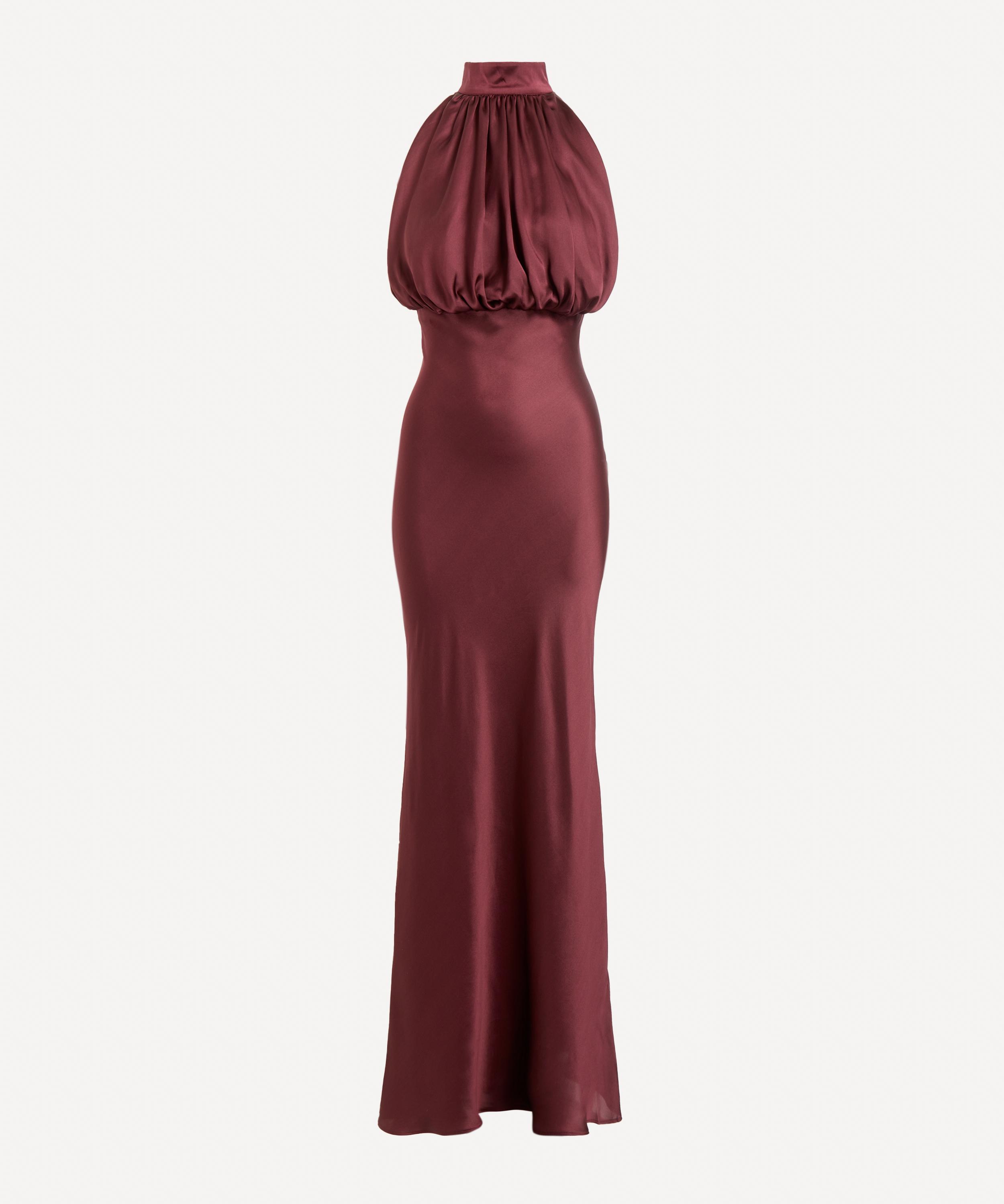 Beautifully crafted from lustrous silk in a deep red hue, this sleeveless maxi dress exudes timeless elegance with its narrow high neckline, voluminous blouson shape and form-fitting waist that secures with a concealed zip closure. It’s completed with a flowing skirt that falls gracefully to the ankle.