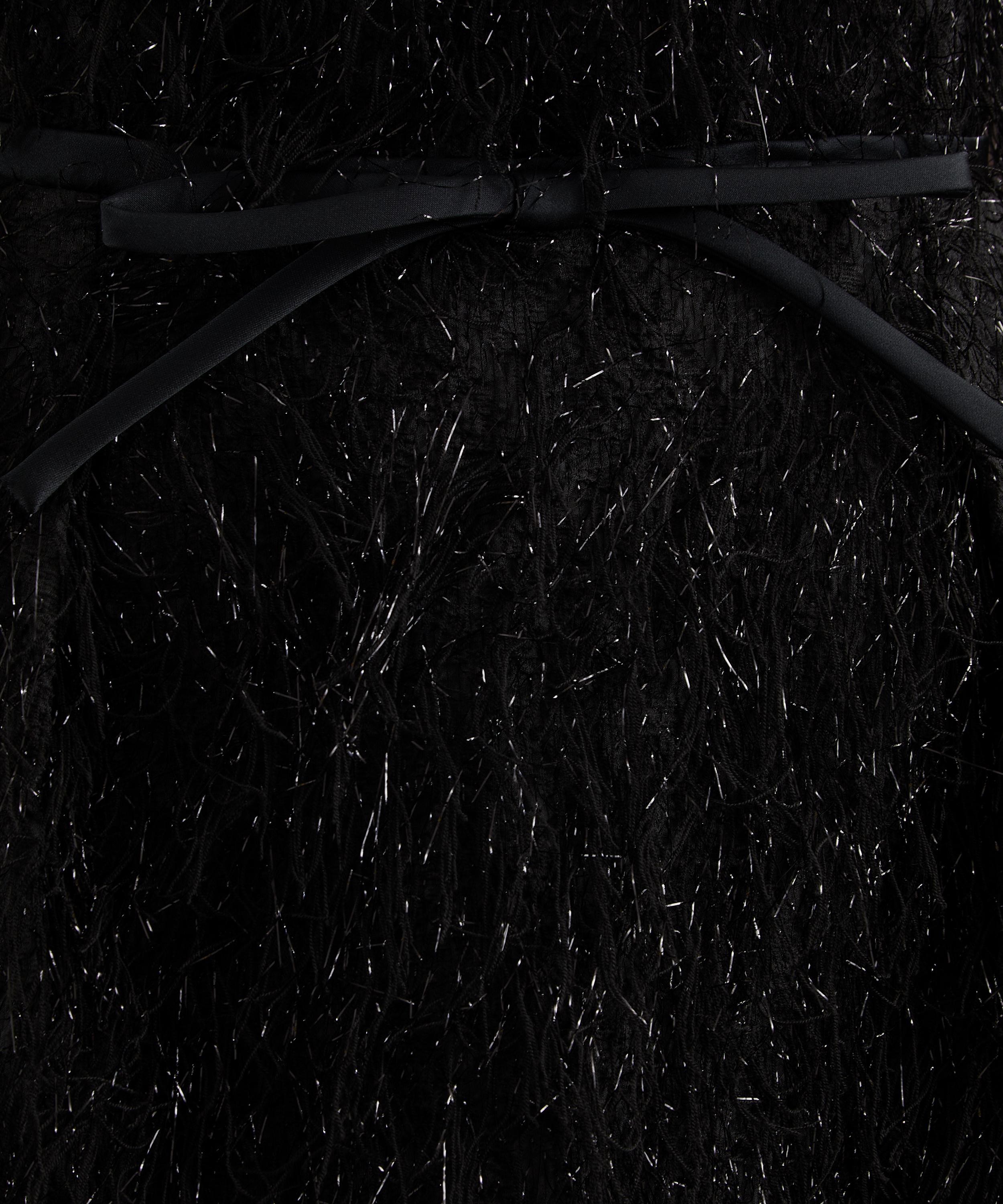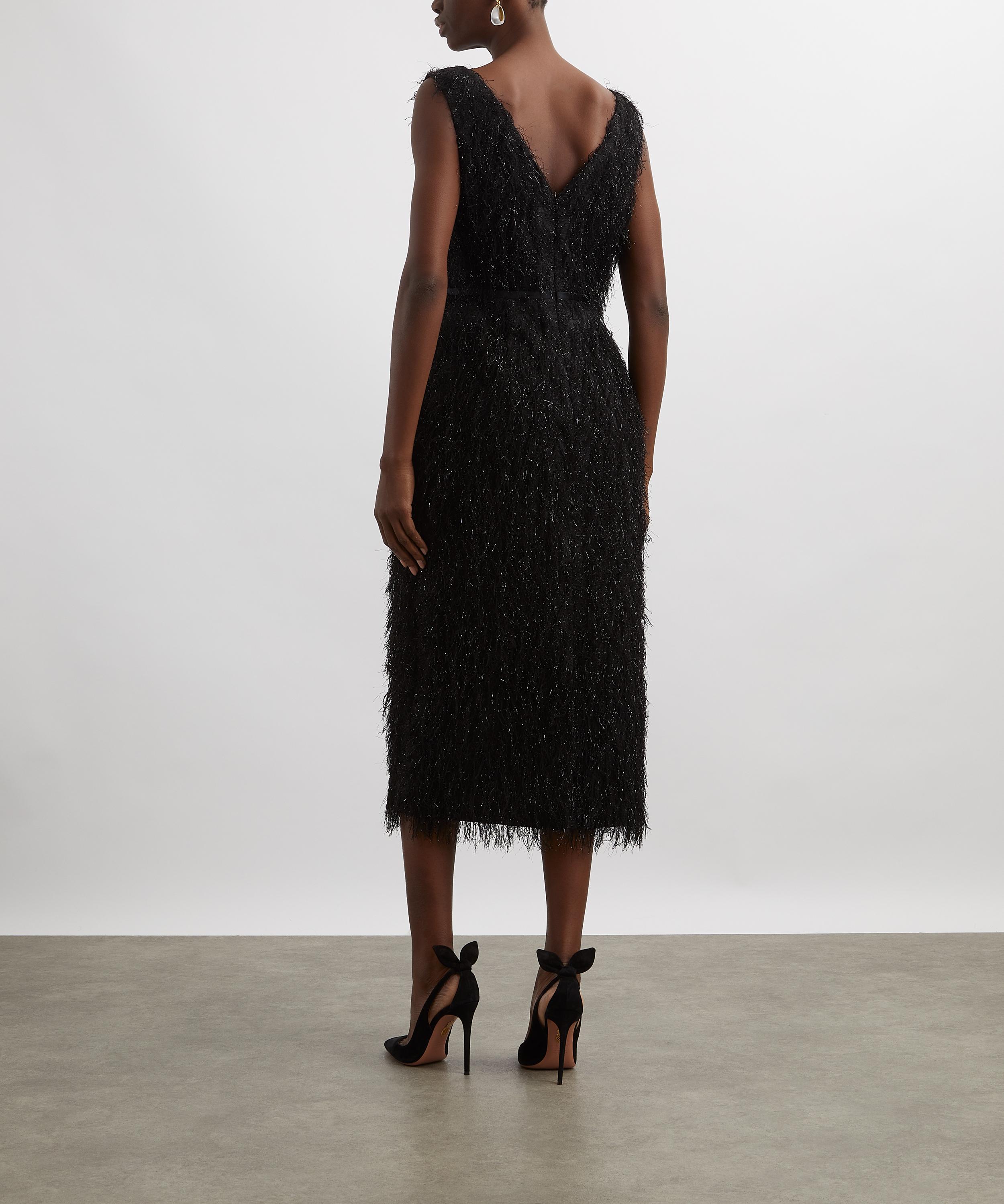 Rendered in black tweed, this slimline midi dress embodies understated refinement. A boat neckline and V-shaped back frame the silhouette, while a tie-fastening bow at the waist lends a graceful, feminine finish.