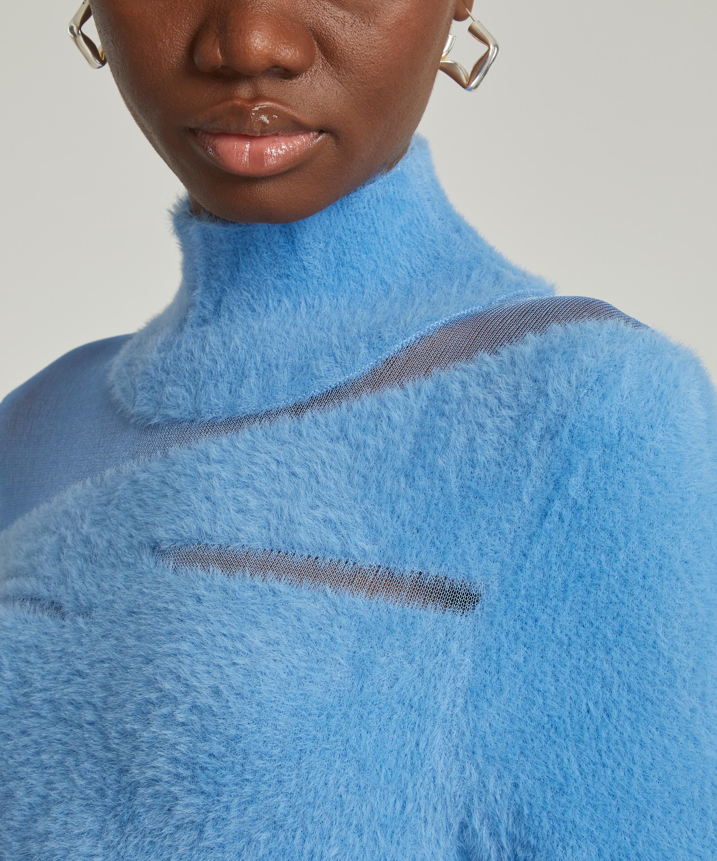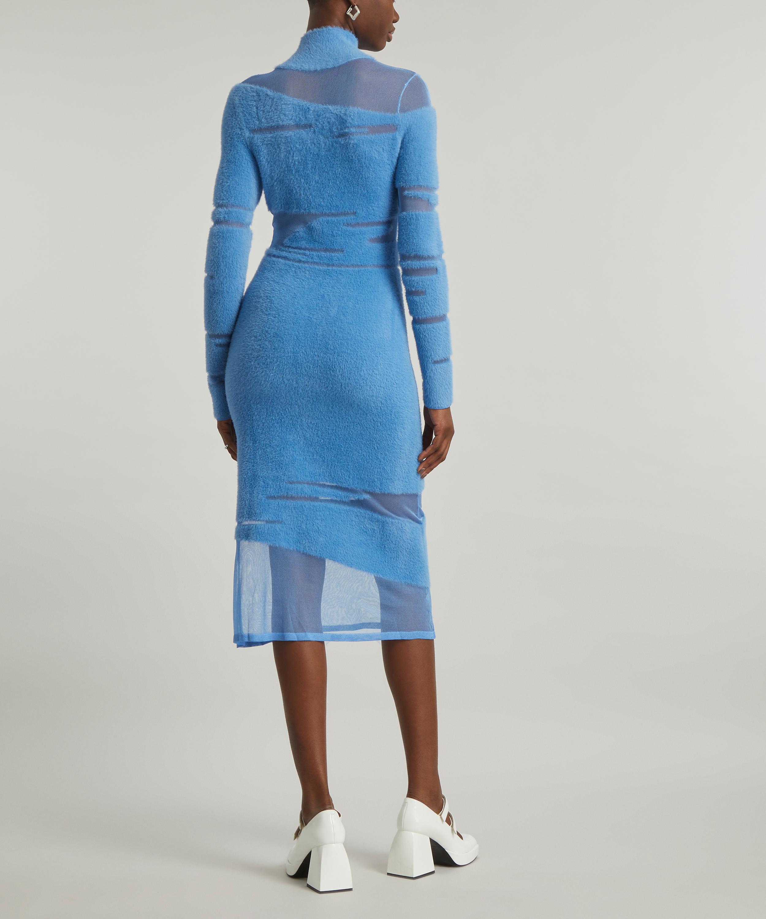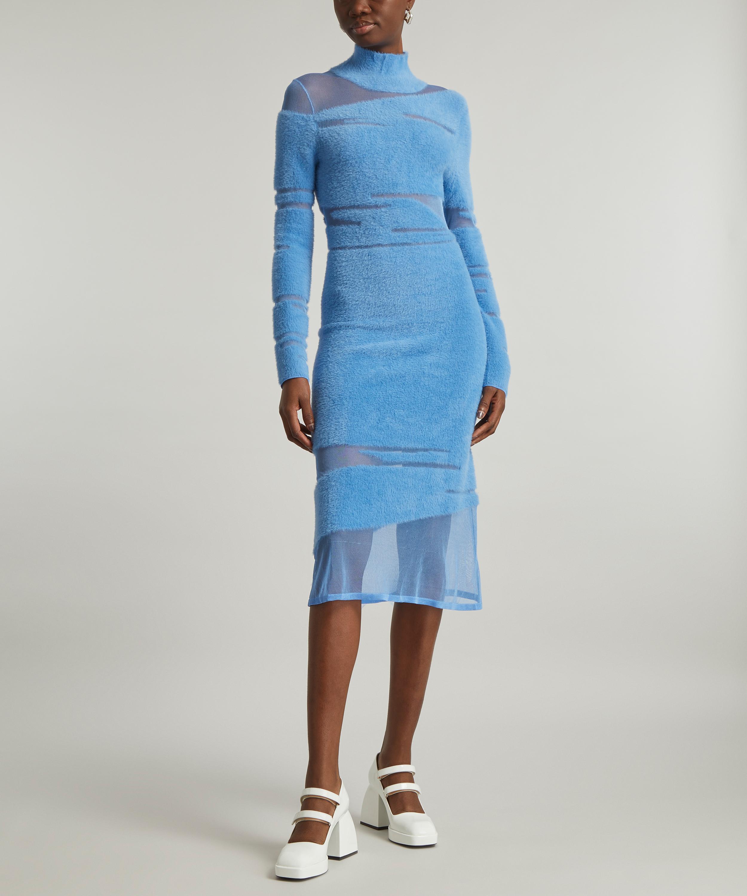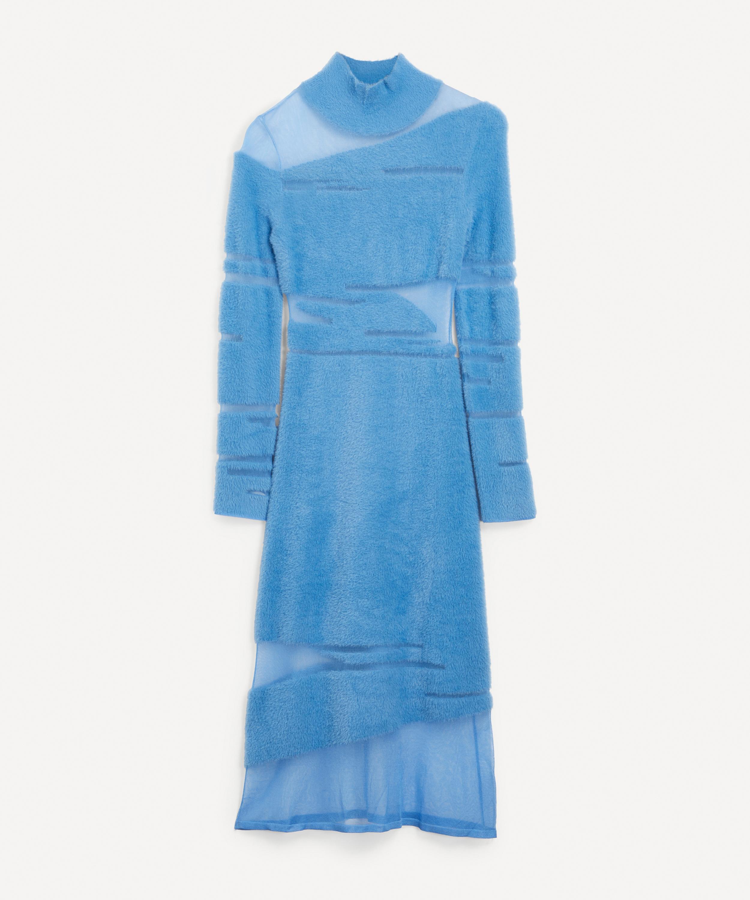 Boldly blue and brimming with eccentricity, make an icy impression in the Sliding Doors dress from House of Sunny. Cosy and effortlessly cool, this form-fitting long-sleeved dress has a turtleneck and a low hem, crafted from a disparate blend of sheer satin and the label’s signature fluffy-knitted fabric.