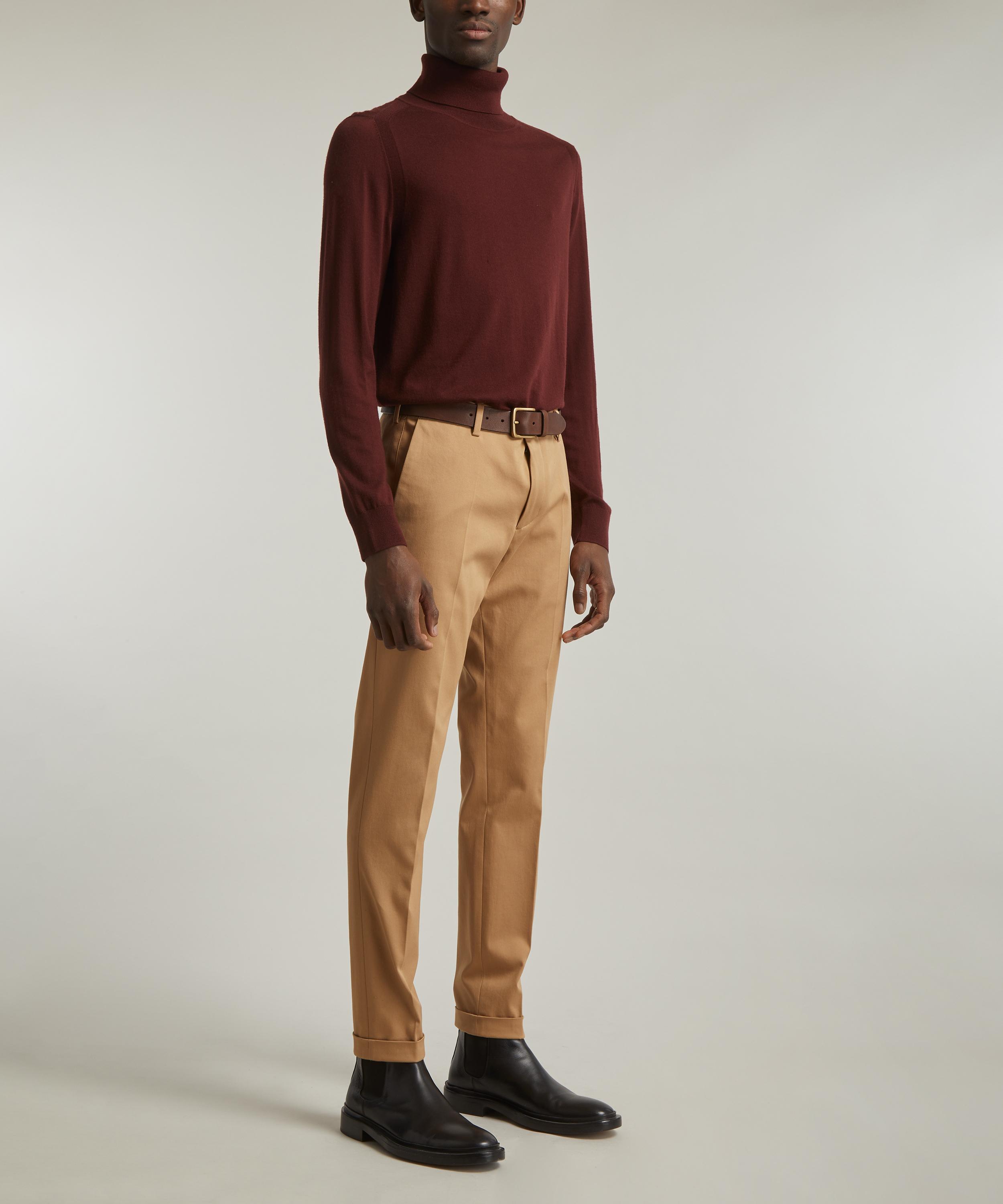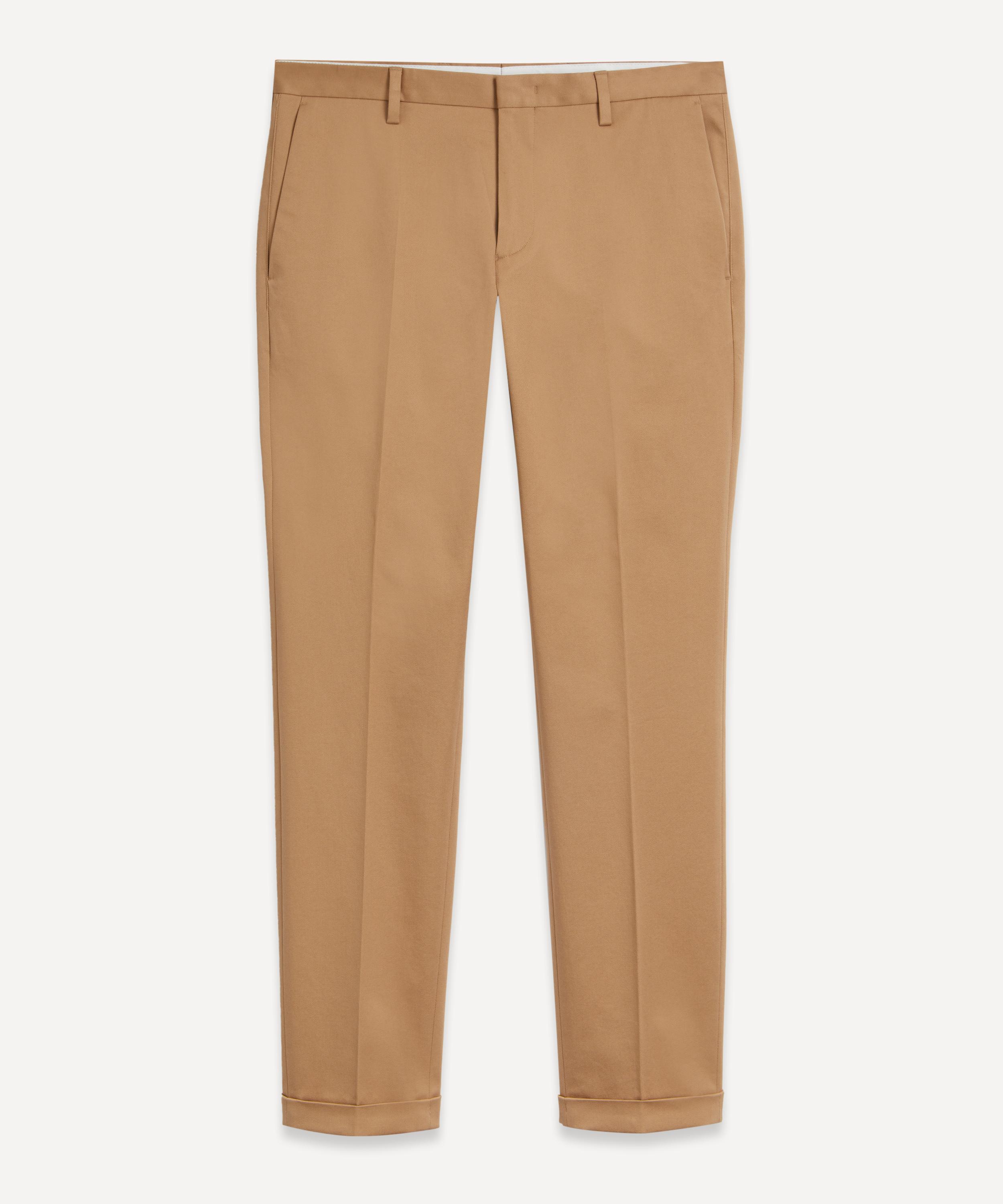 Made from a premium cotton cloth with stretch added for an extra boost of comfort, these classic tan chinos feature a flattering slim-fit complete with central creases, rear welt pockets and turn-ups at the hem.