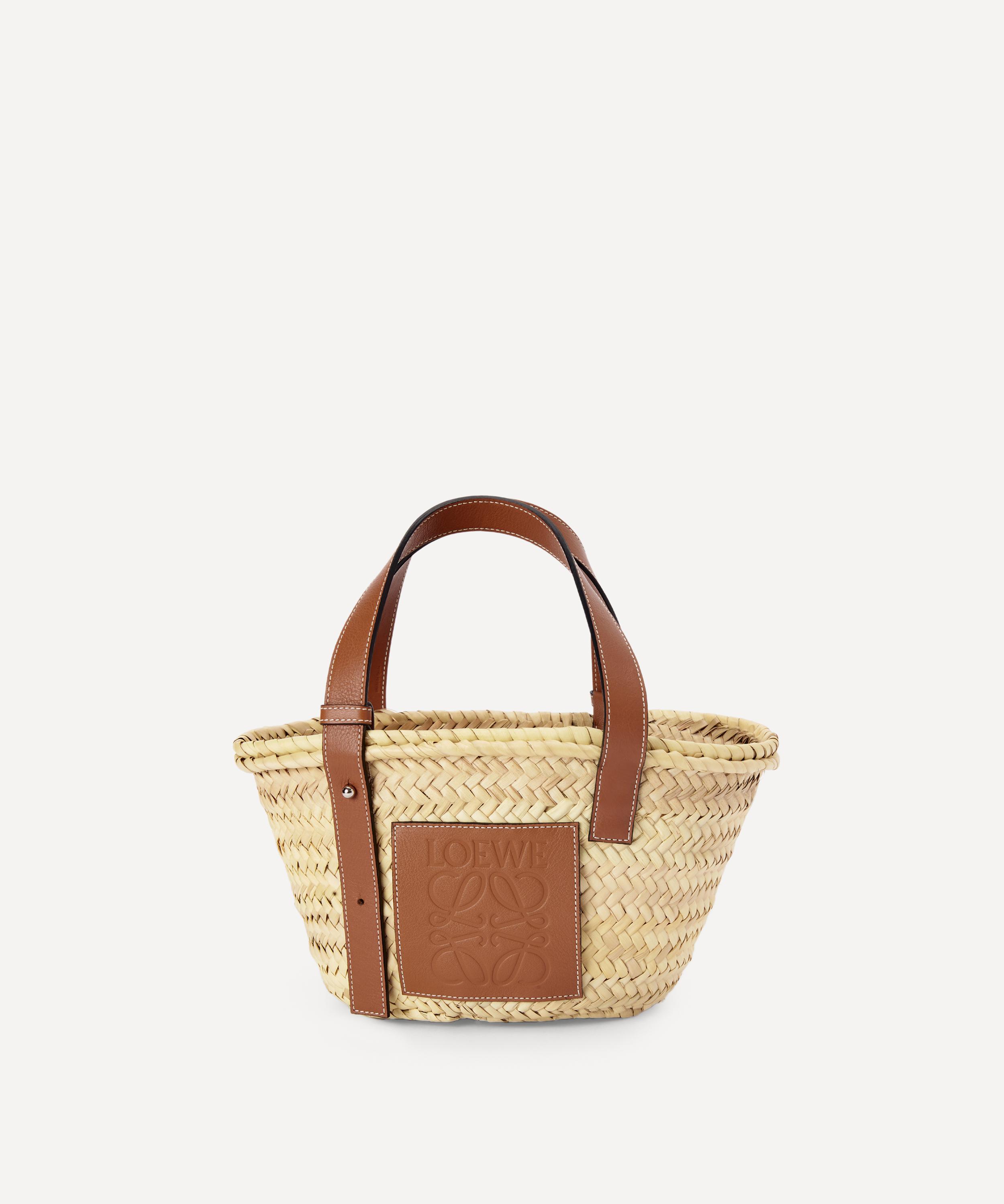 Hand-woven from natural palm leaves, Loewe's Basket bag showcases a rustic, unlined design with two adjustable leather top handles and a large leather plaque featuring a debossed version of the brand's distinctive Anagram logo. Ideal for market shopping, city strolls and trips to the beach, this compact piece is perfect for toting your daily essentials in true Mediterranean style.