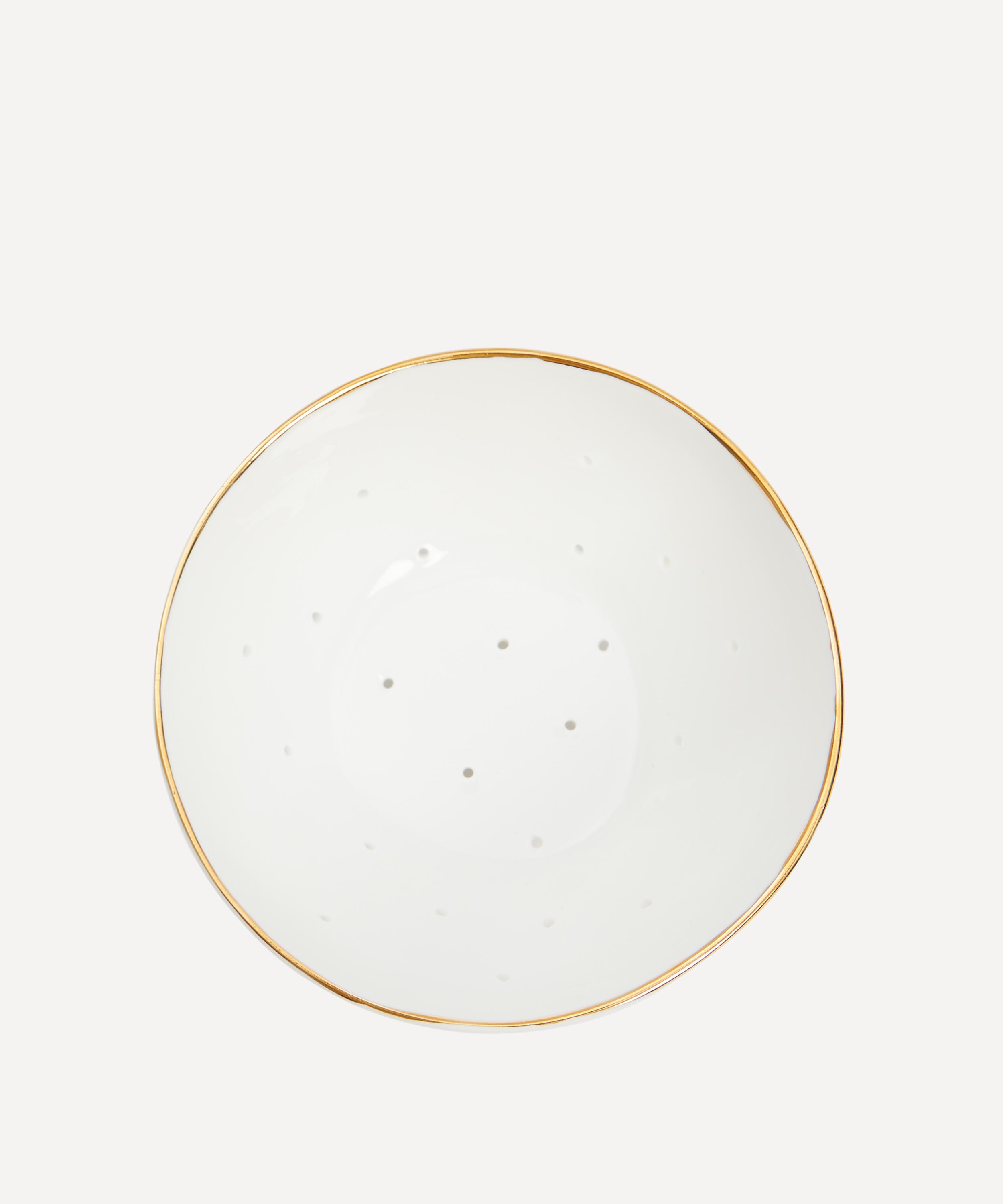 This handy bowl is the perfect size for a punnet of smaller fruits such as blueberries or currants – ready to wash and serve straight away. An effortlessly charming way to get bugs out of your berries, careful detailing such as its dainty feet and drainage holes complement the hand-painted 24ct gold banding around the edge. A chic and practical addition to your kitchen edit.