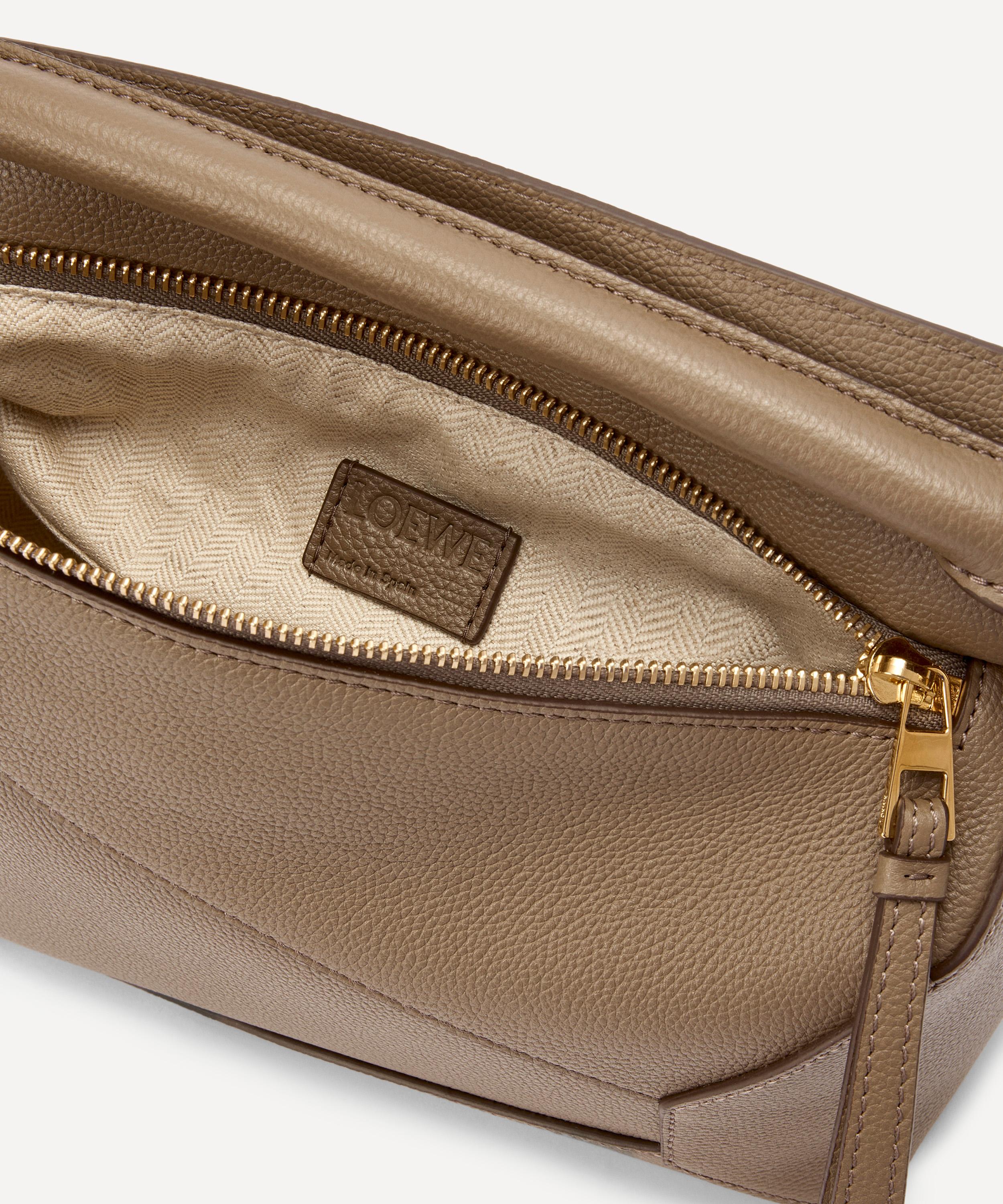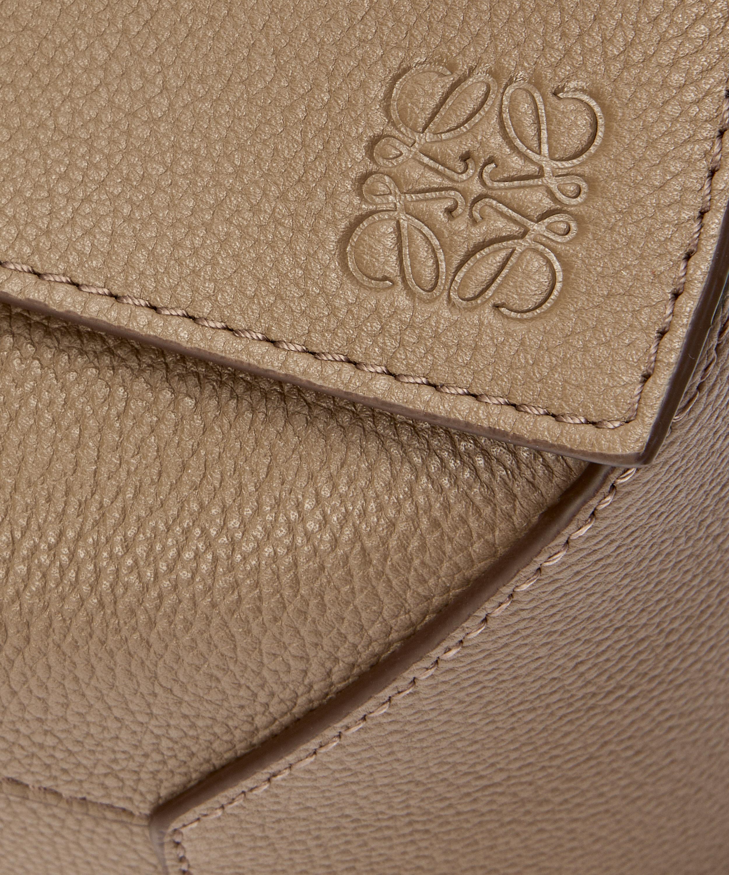 Cut from grained calfskin leather, this small rendition of Loewe's Puzzle bag is characterised by the same boxy cuboid silhouette that can be folded in several different ways thanks to the precisely cut geometric panels across the exterior. The design is fitted with a spacious main compartment that can hold a small vertical wallet, most mobile phones, and sunglasses case, while the brand's distinctive Anagram logo is embossed at the front. Complete with a top handle and a detachable shoulder strap, it can be worn across the body, over the shoulder or even folded down flat for an artful alternative to your usual clutch bag.