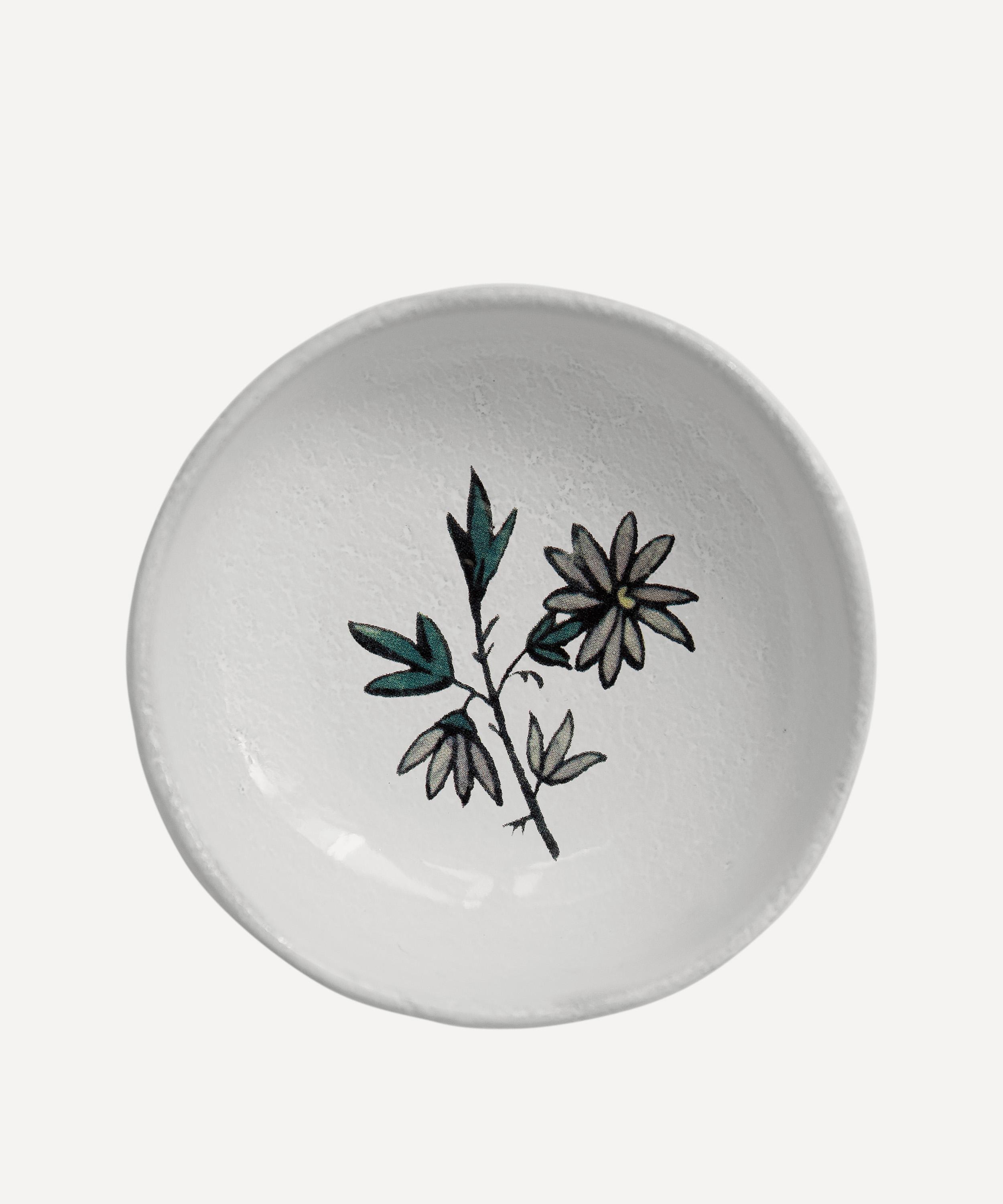Votary of pre-industrial fabrication, Astier de Villatte is celebrated for being the one and only studio in Paris to hold and harbour the traditions of artisanal ceramic production. Restoring the ancestral systems of moulding and stamping, this piece is made using techniques from the Middle Ages which involve moulding a sheet of handmade clay, double firing the ‘biscuit’ piece and glazing the product in white enamel – a lengthy process that requires a drying time of up to one month. Characterised by the charming sprig of flowers that adorns the centre, it is engraved with the brand’s signature crest - depicting an interlacing A & V - alongside John Derian's name in block capitals. Each handmade piece tells a beautiful story, it romances and imparts a sense of nostalgia into its owner.