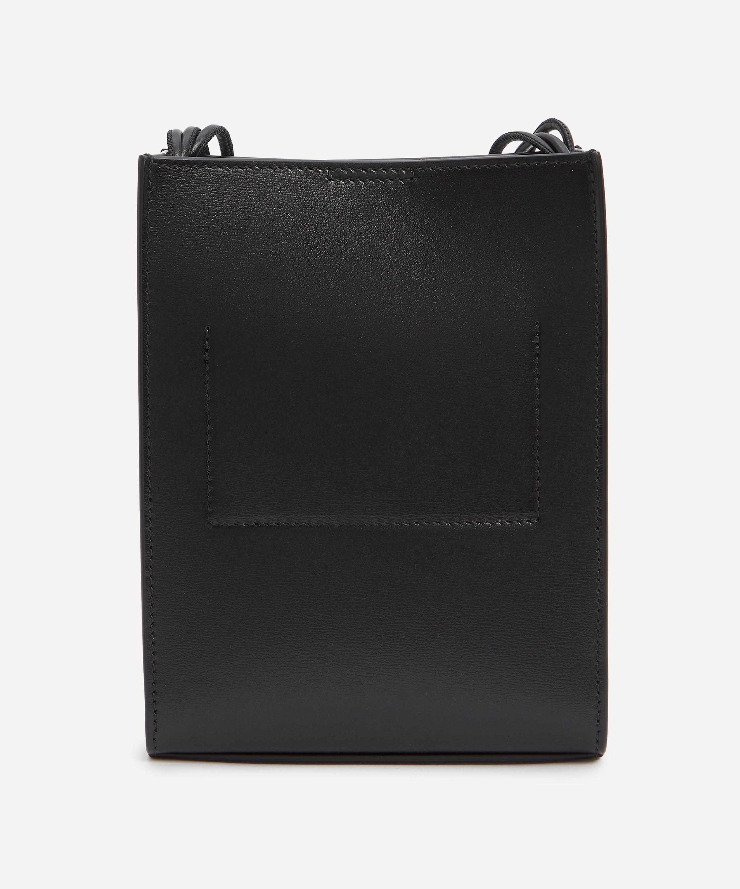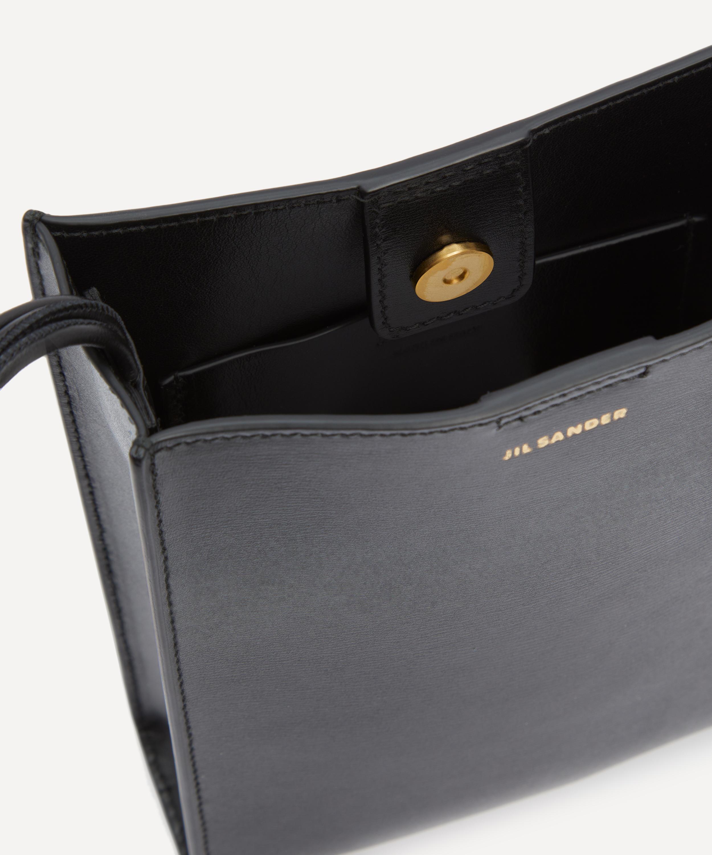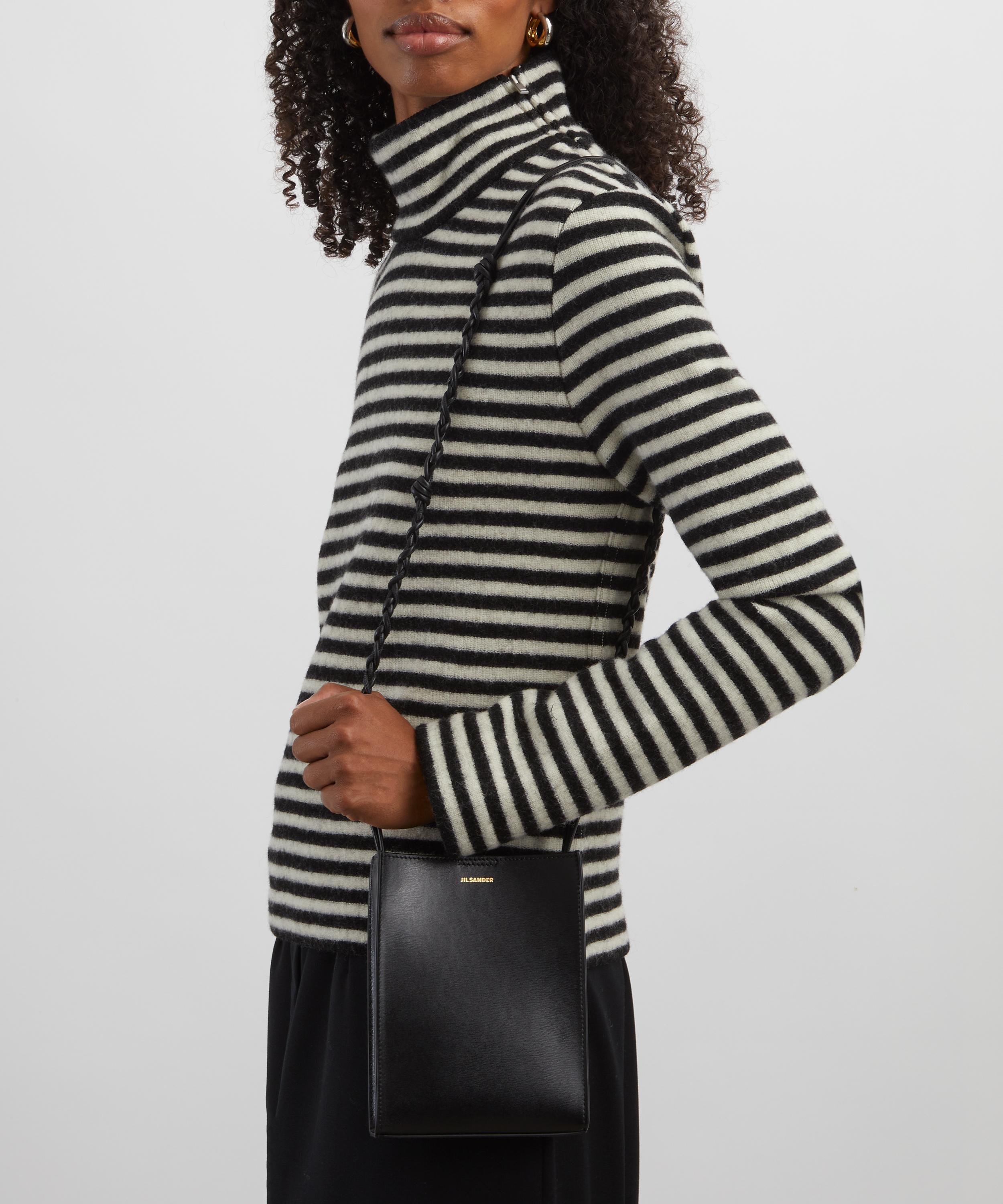 Master sophisticated minimalism with the Tangle Crossbody Bag from Jil Sander. Crafted from smooth calf leather with a nappa lining, it features a rectangular silhouette in a sleek, black colourway. Equipped with a spacious main compartment and magnetic closure, it fits small essentials like your phone, keys, and wallet. It’s finished with foil embossed branding to the front and a hand-knotted strap to be worn over the shoulder, or crossbody.