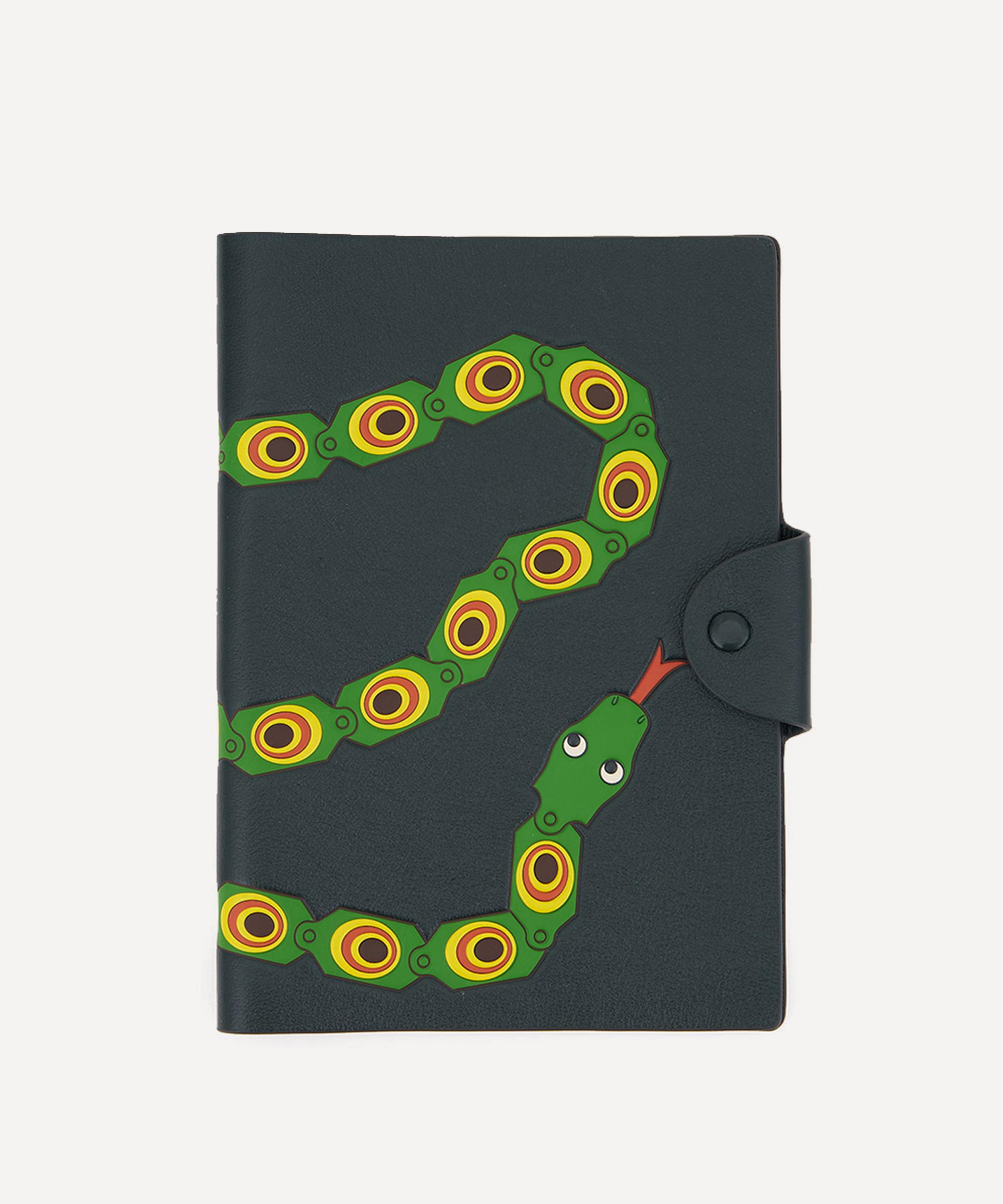 Crafted from the brand’s signature textured leather this notebook presents a playful snake motif spanning its A5 silhouette - complete with a leather tab closure for a polished yet practical finish.About Anya Hindmarch
