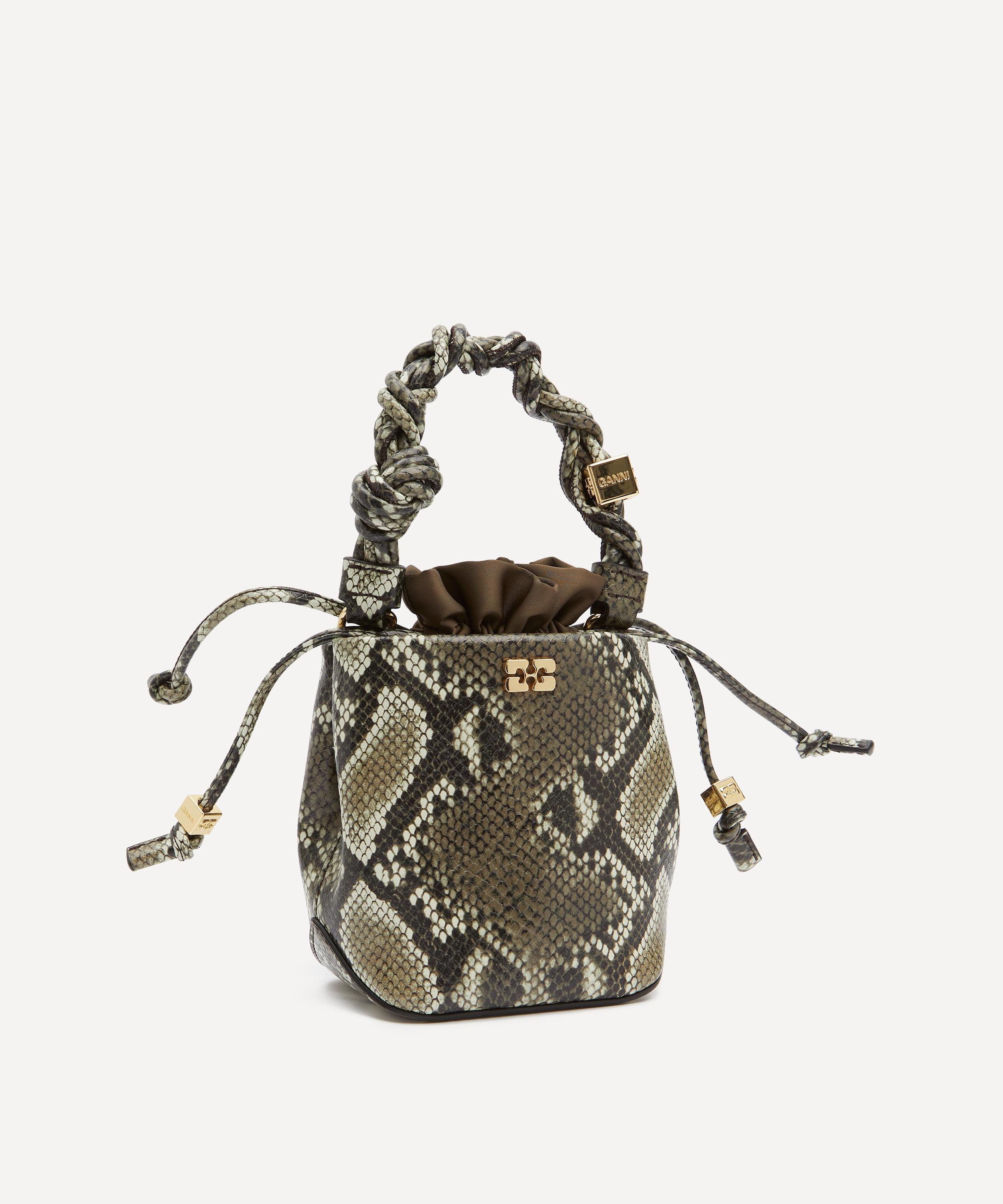 Give your outfit a chic, sophisticated finishing touch with the Mini Bou bucket bag by millennial-favourite Danish brand Ganni. Featuring a snake print bucket design, it’s further enhanced by a decorative braided top handle, a drawstring closure, and a metallic dice accent engraved with a GANNI and butterfly logo. Finished with an adjustable shoulder strap, it can be carried by hand or worn cross-body – perfect for off-duty looks.
