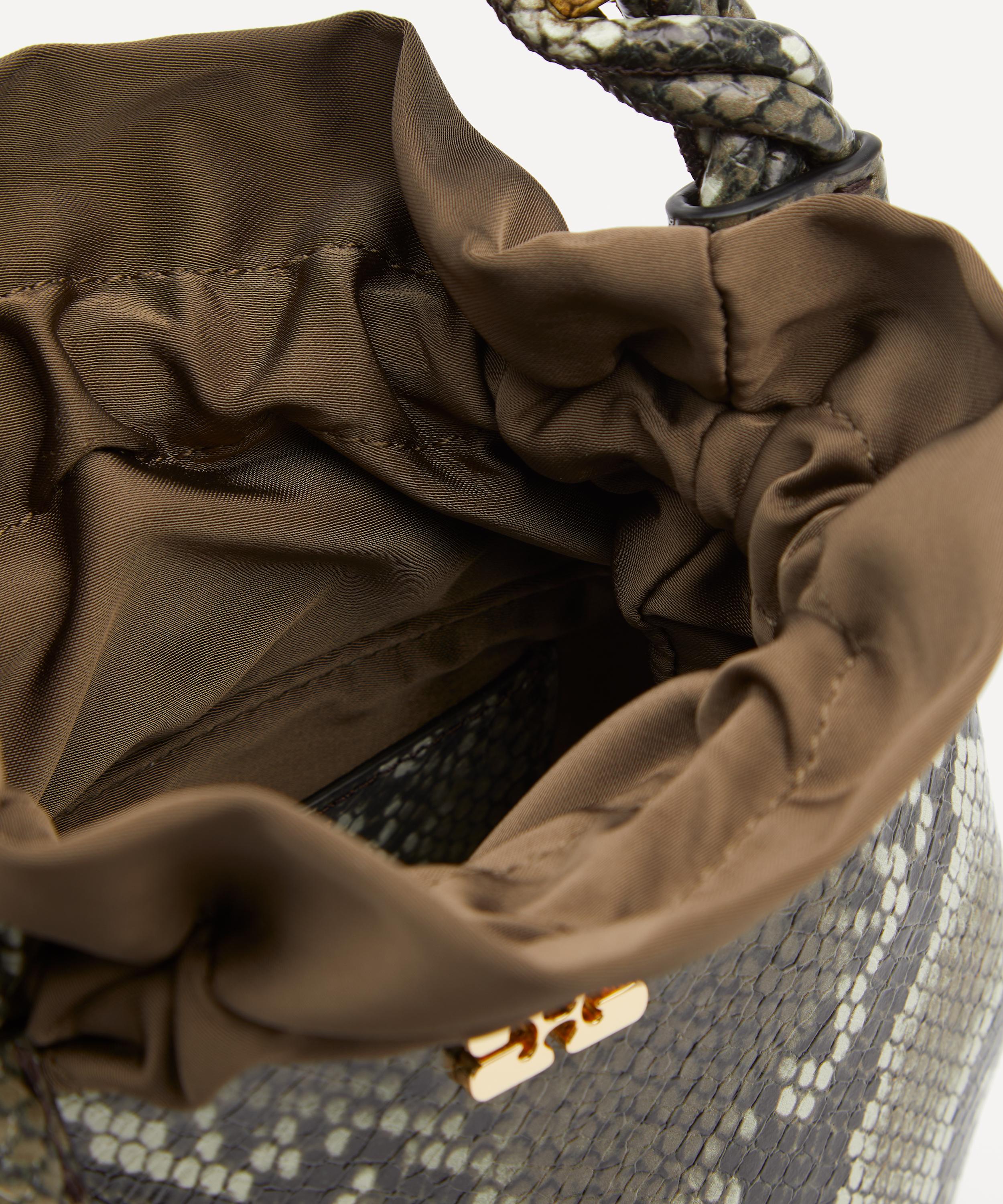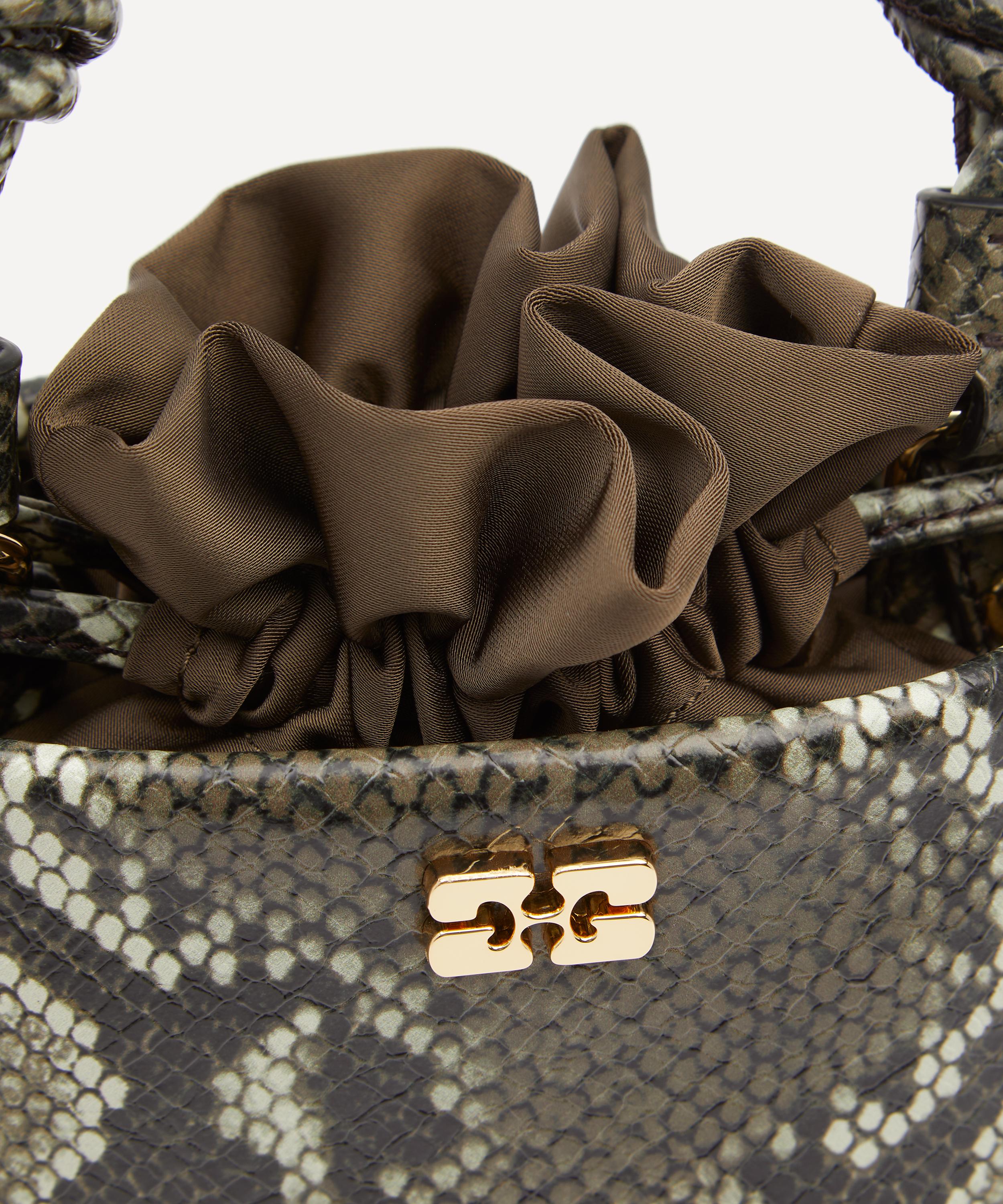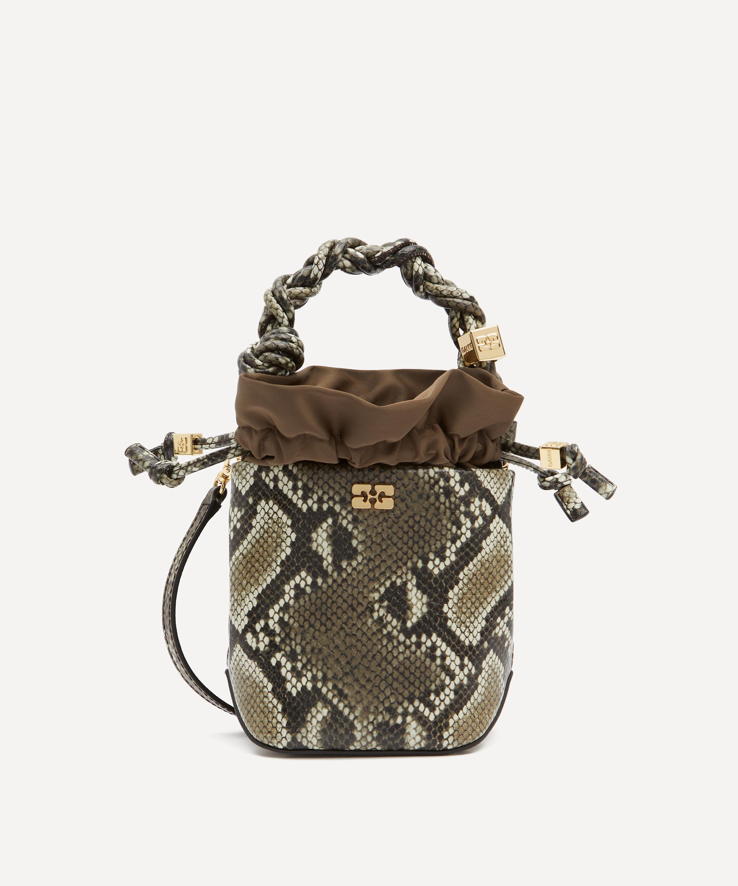 Give your outfit a chic, sophisticated finishing touch with the Mini Bou bucket bag by millennial-favourite Danish brand Ganni. Featuring a snake print bucket design, it’s further enhanced by a decorative braided top handle, a drawstring closure, and a metallic dice accent engraved with a GANNI and butterfly logo. Finished with an adjustable shoulder strap, it can be carried by hand or worn cross-body – perfect for off-duty looks.
