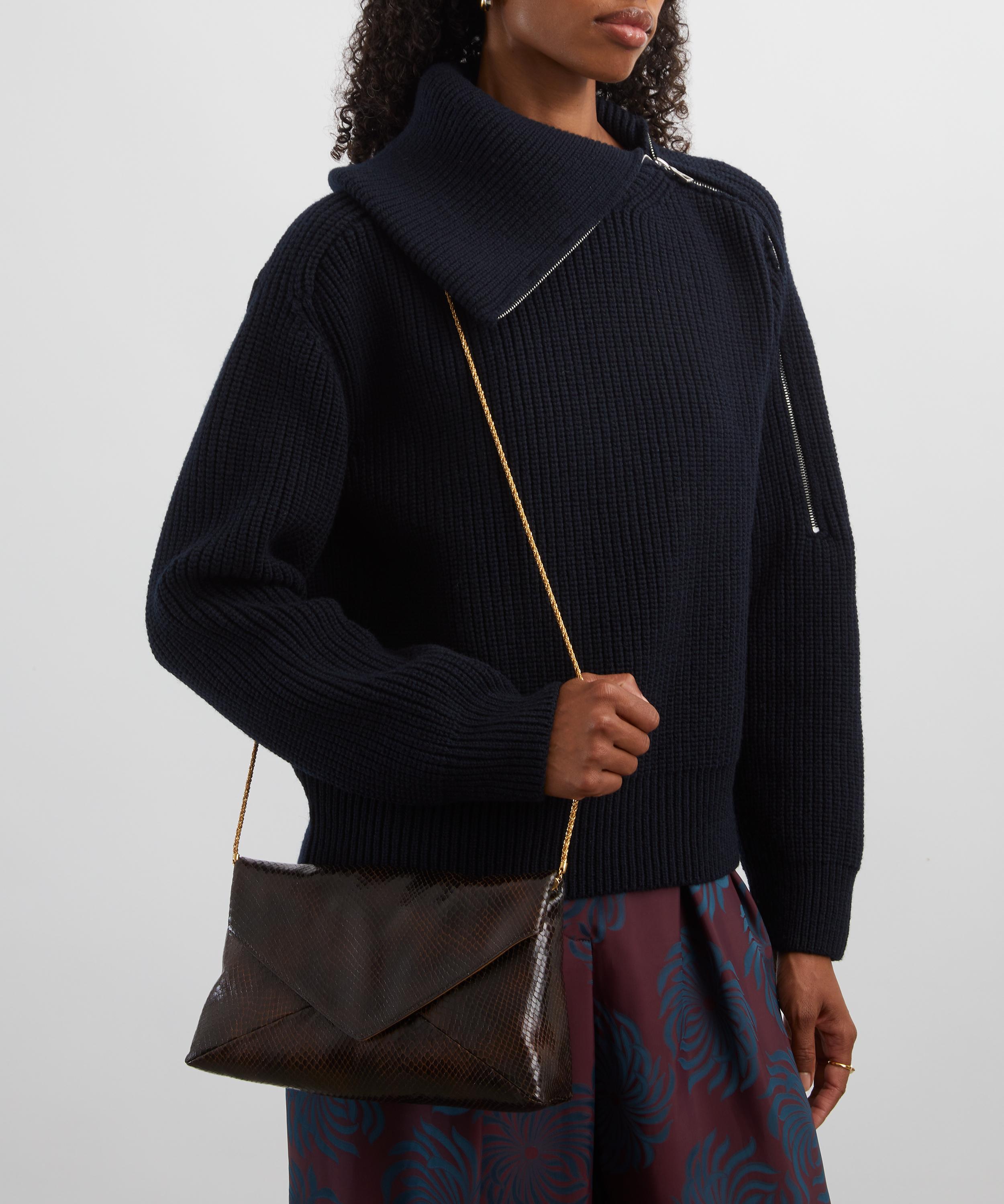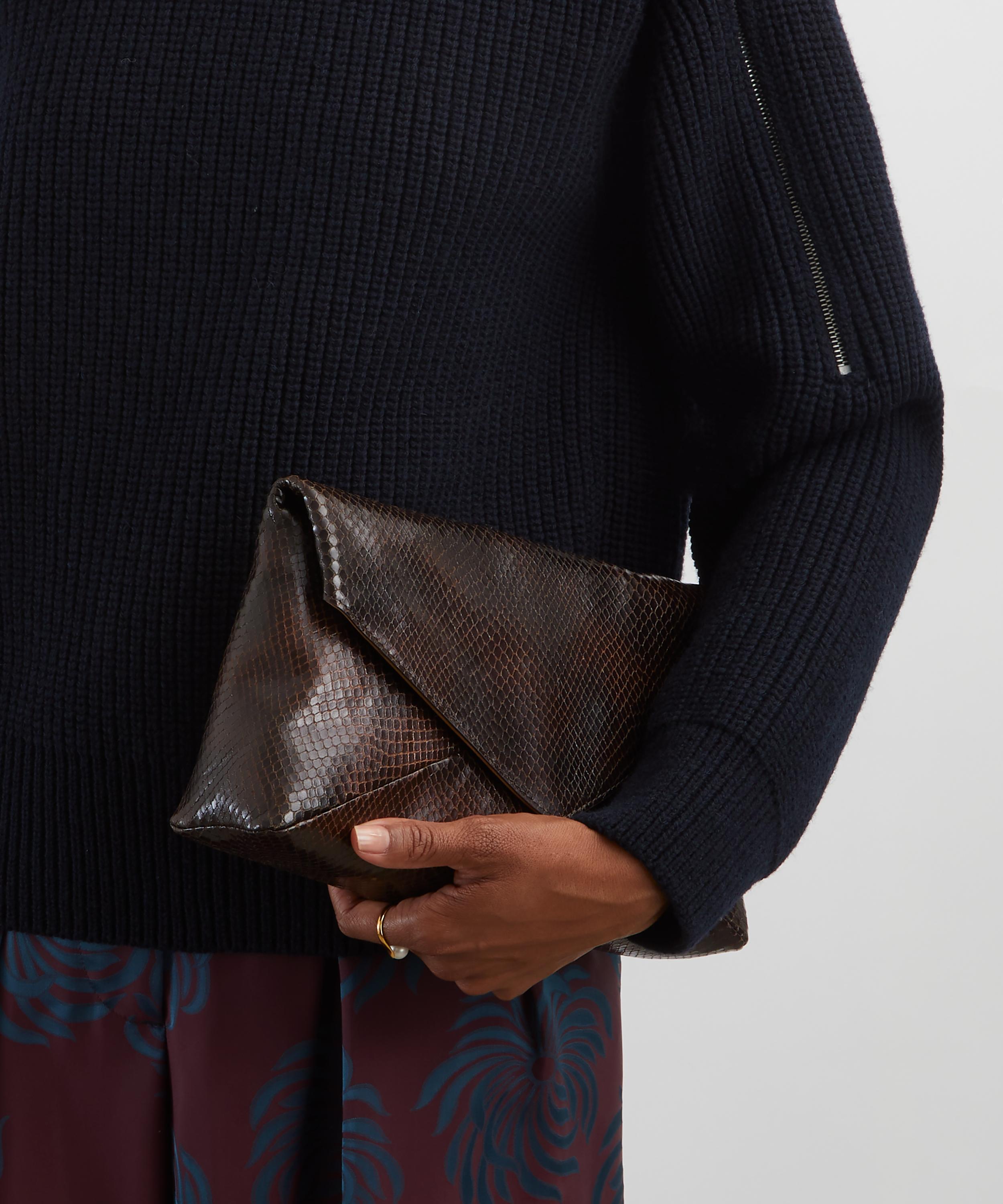 The Snakeskin Leather Clutch Bag from Belgian fashion designer Dries Van Noten boasts a practical and polished silhouette.
