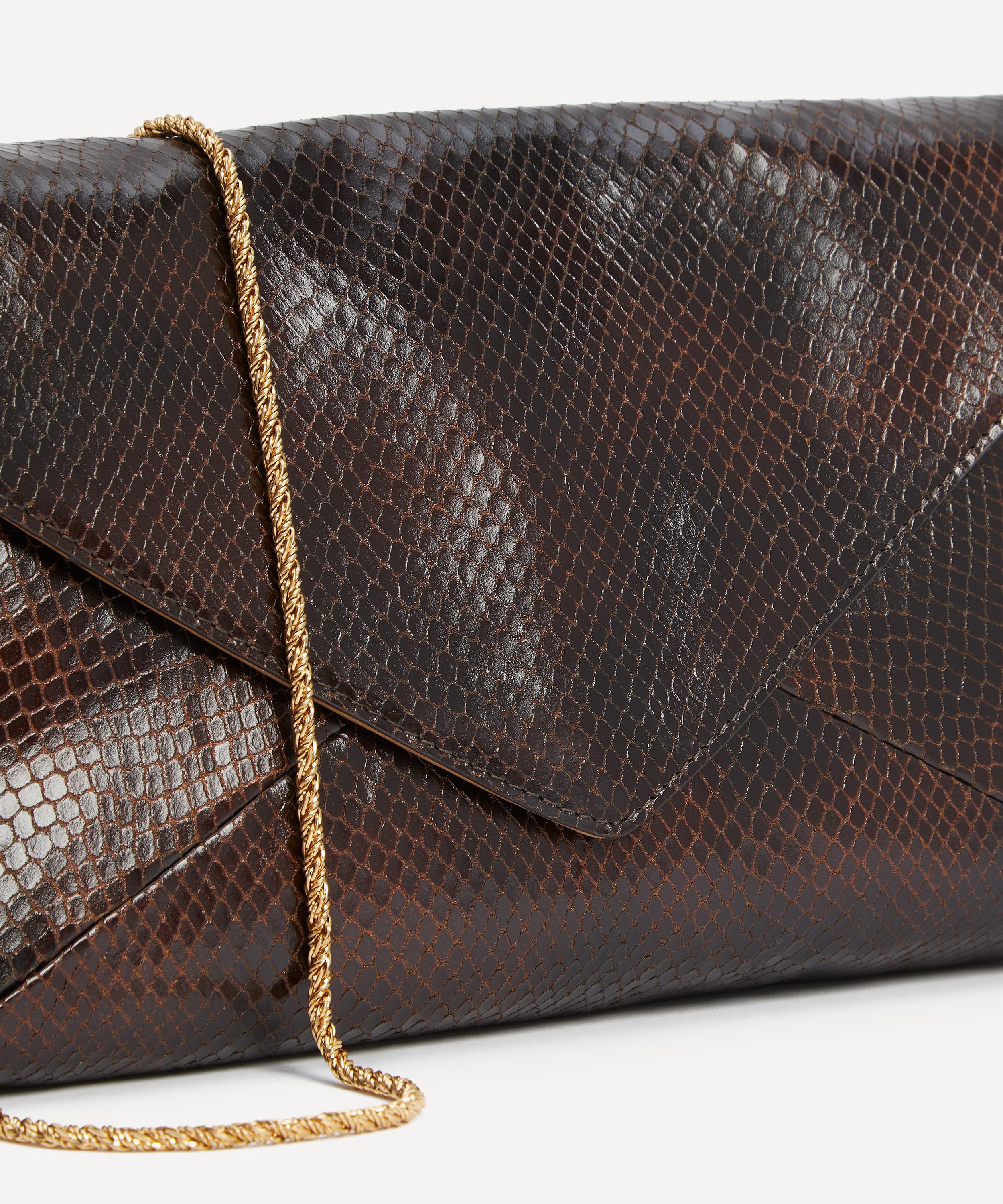 Crafted from snakeskin-embossed leather with a magnetic closure and an internal pocket, it’s finished with an adjustable chain strap to be worn crossbody, over the shoulder or carried by hand for easy, everyday styling.