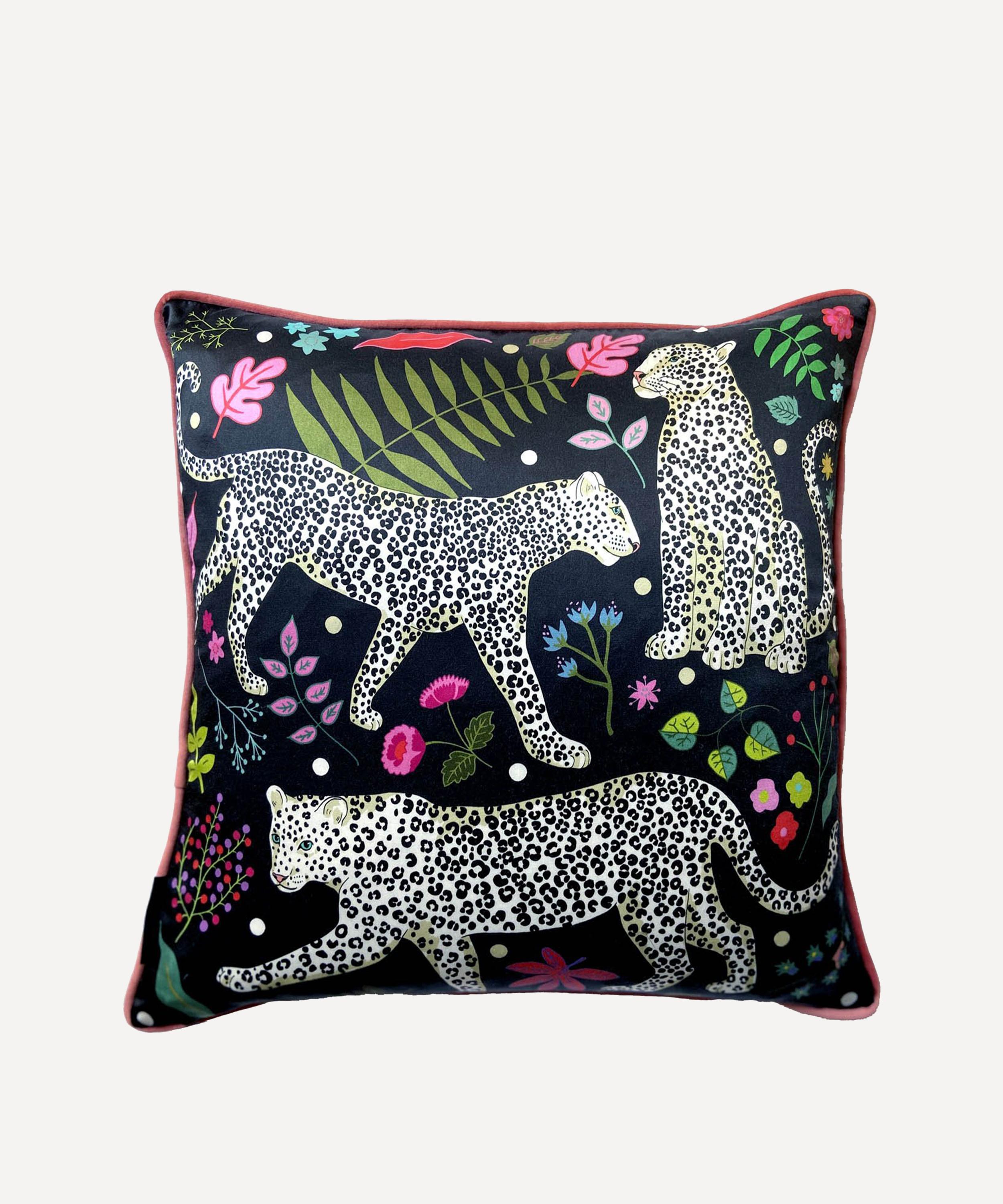 Known for her imaginative designs, which depict pastel sweet themes with a slightly hallucinatory edge, Karen Mabon brings her artful illustrations to this navy cushion. Crafted from a premium blend of Mulberry silk and cotton, it depicts three snow leopards surrounded by decorative foliage. Use it to add an extra dash of character to a favourite velvet sofa or patterned armchair.