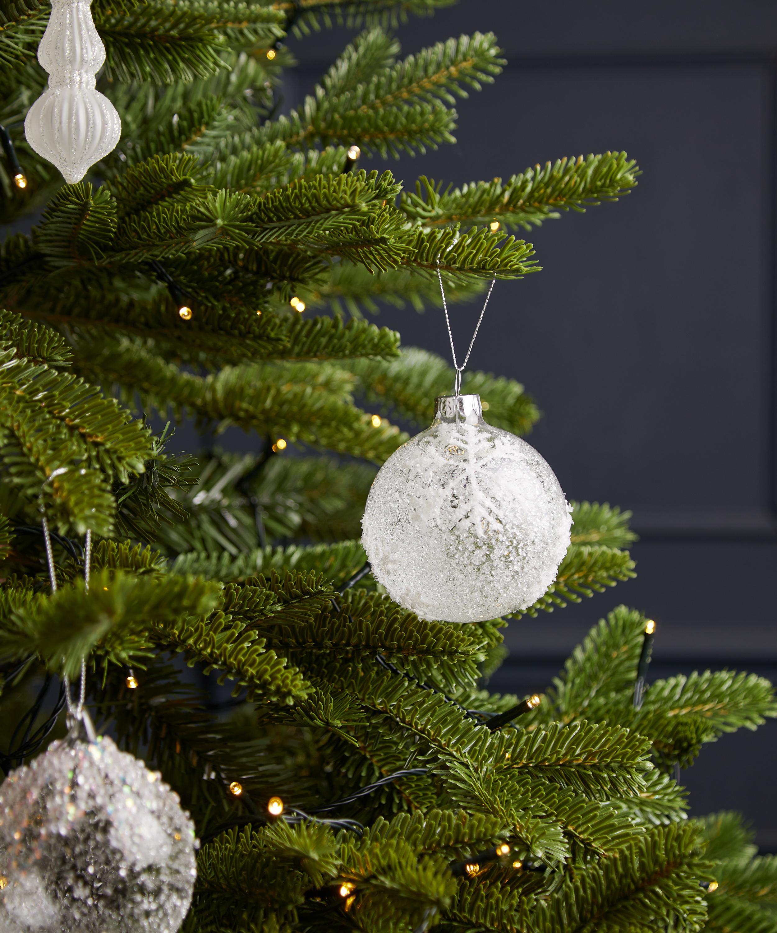 Elevate this year’s evergreen pine with the Snowflake Glass Bauble ornament, embracing your seasonal attire with a frosty coat of grandeur.